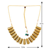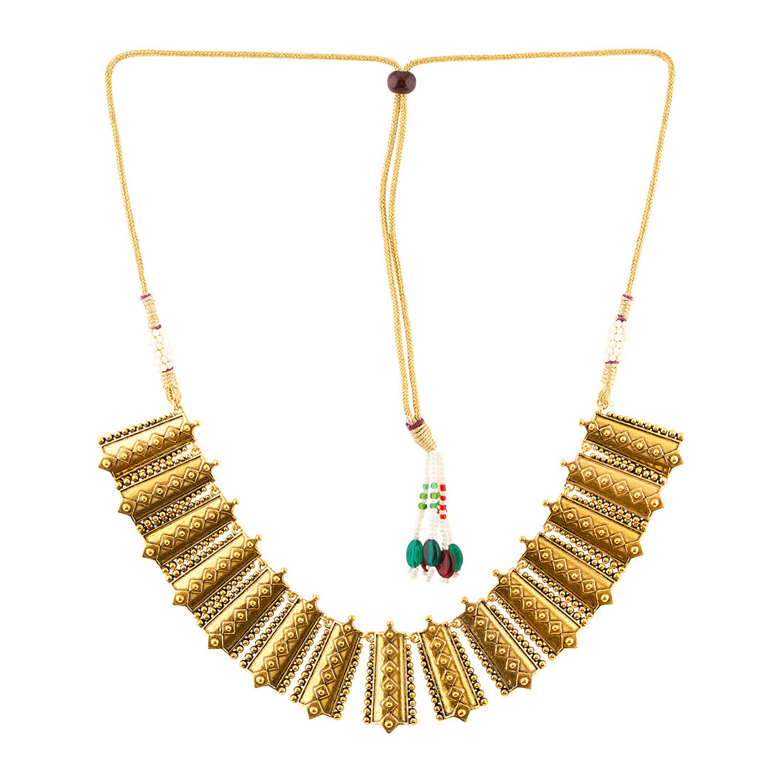 Adorn your beautiful personality with this exquisitely designed oxidized gold necklace in brass Pair it up with any casual, semi formal, or formal attire for that traditional yet contemporary look.Weight (Gms): 52Size (LxW)(Inch): 15.5*8Material: BrassPlating: Oxidized GoldColor: GoldSales Package: 1...