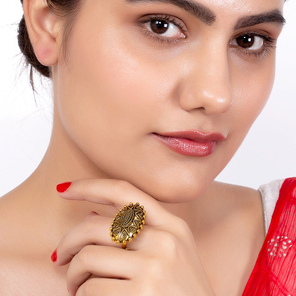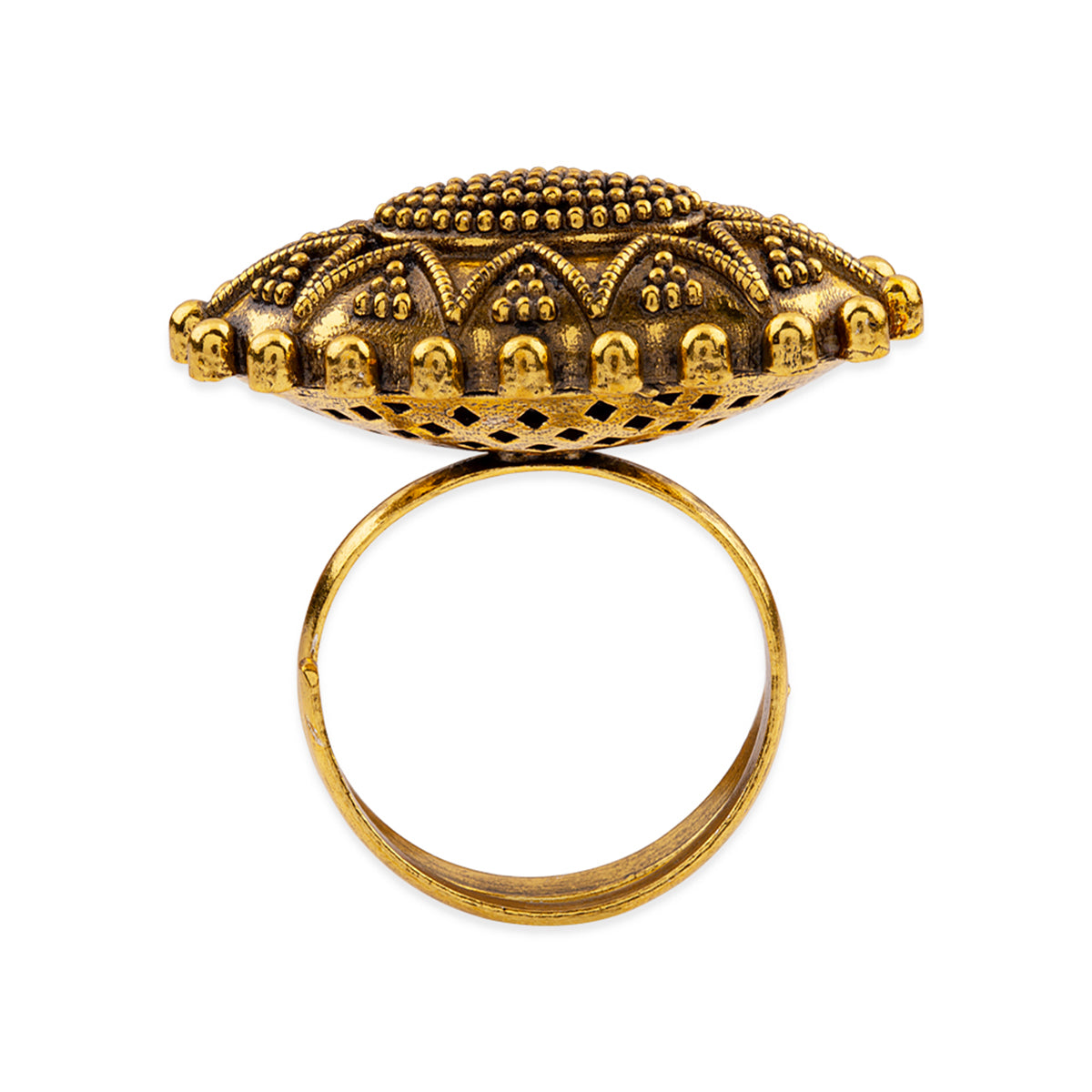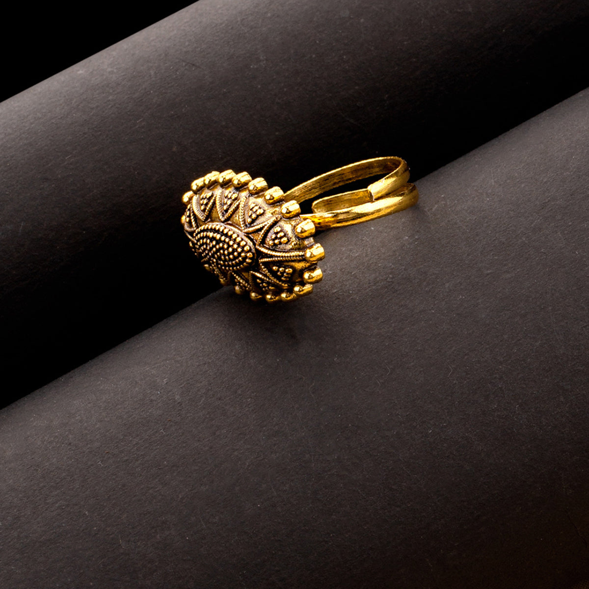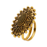 This adjustable statement ring is a perfect piece to add charm to your traditional look. This brass ring has given an excellent oxidized gold finish with intricate details. Pair it with your Indian attire.