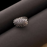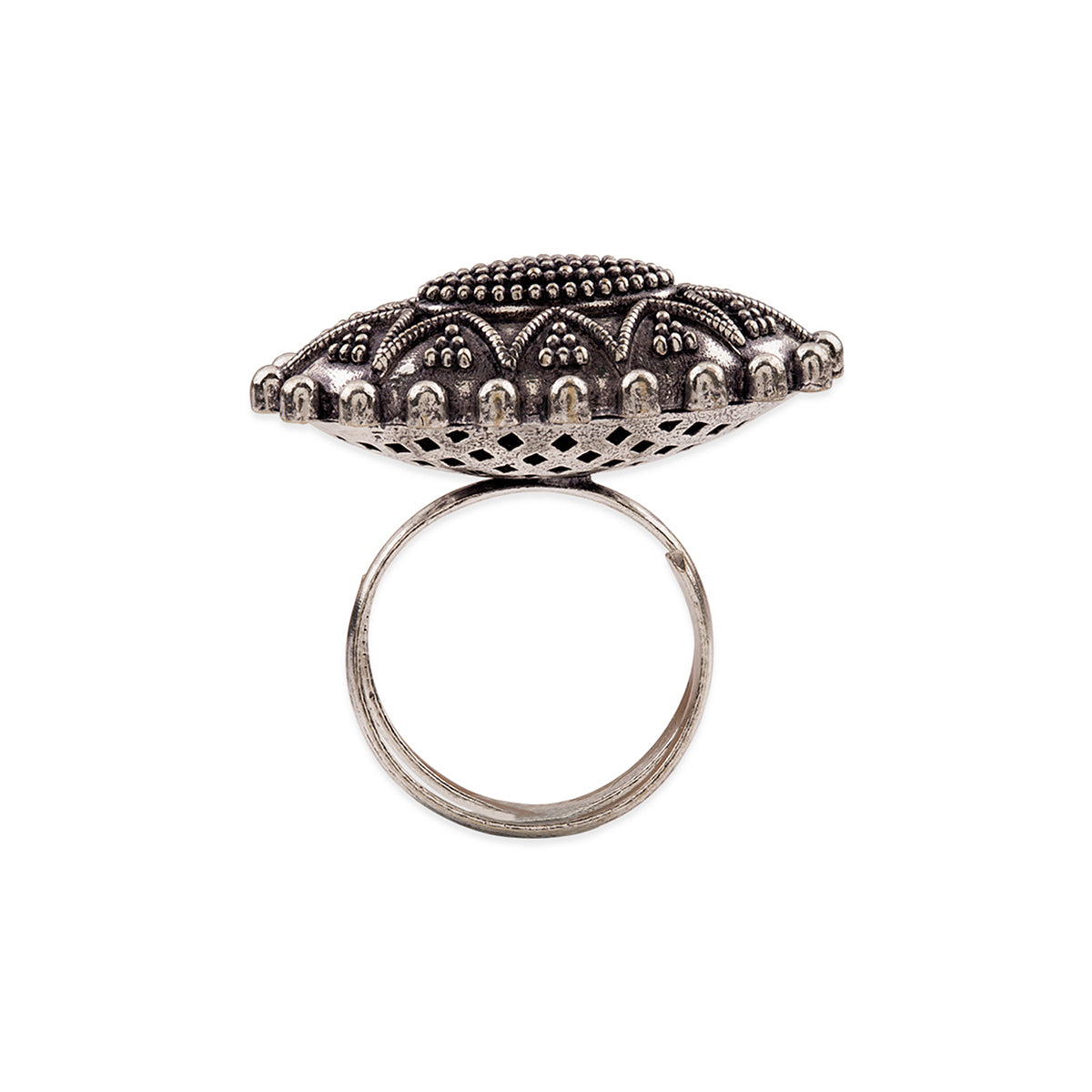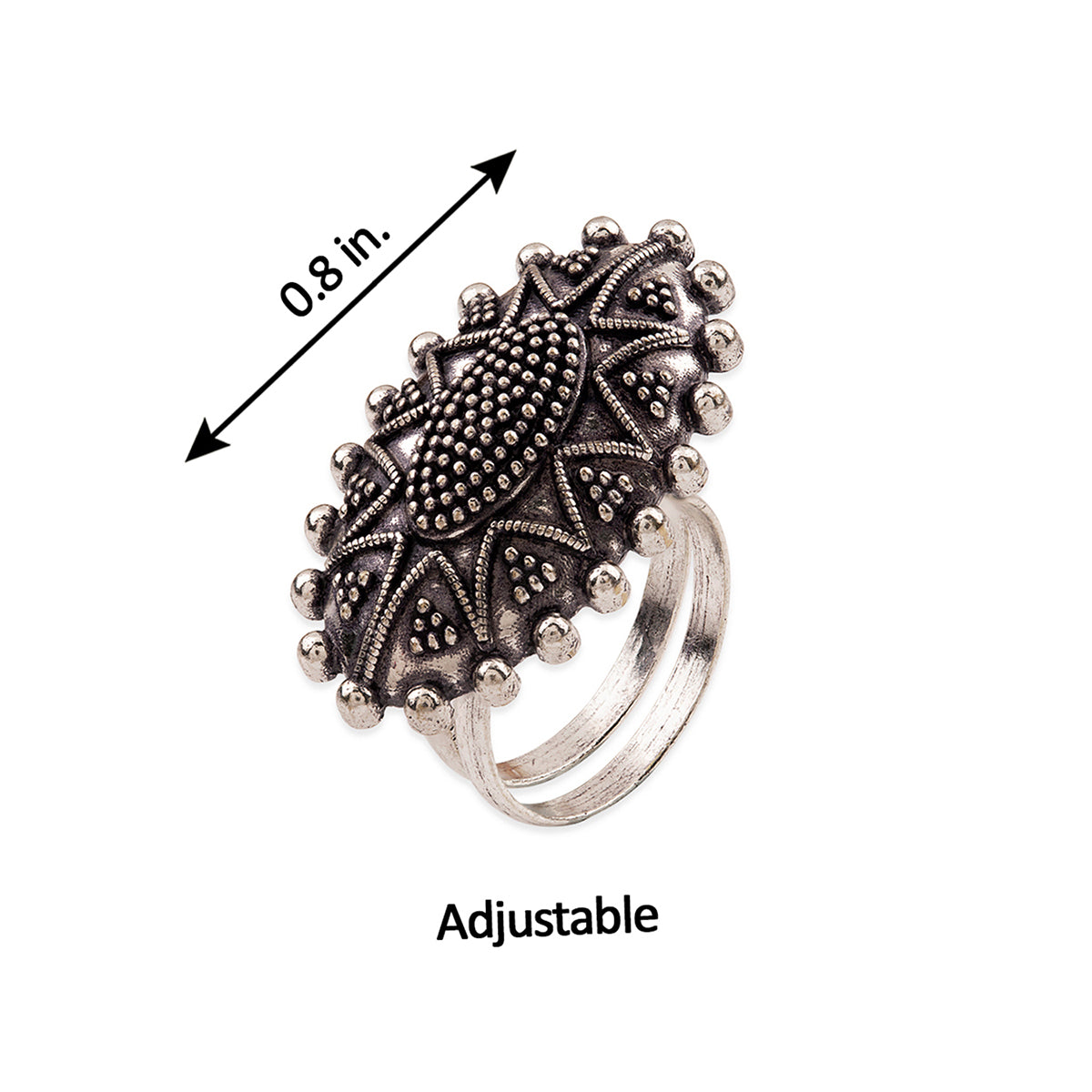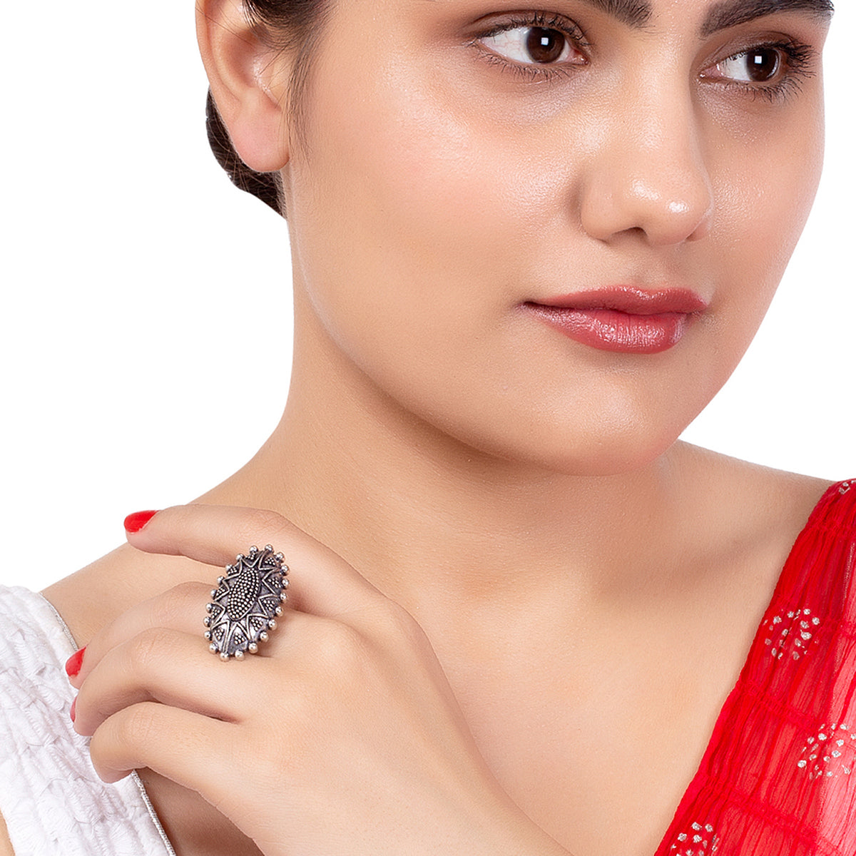 This adjustable statement ring is a perfect piece to add charm to your traditional look. This brass ring has given an excellent silver oxidized finish with intricate details. Pair it with your Indian attire.