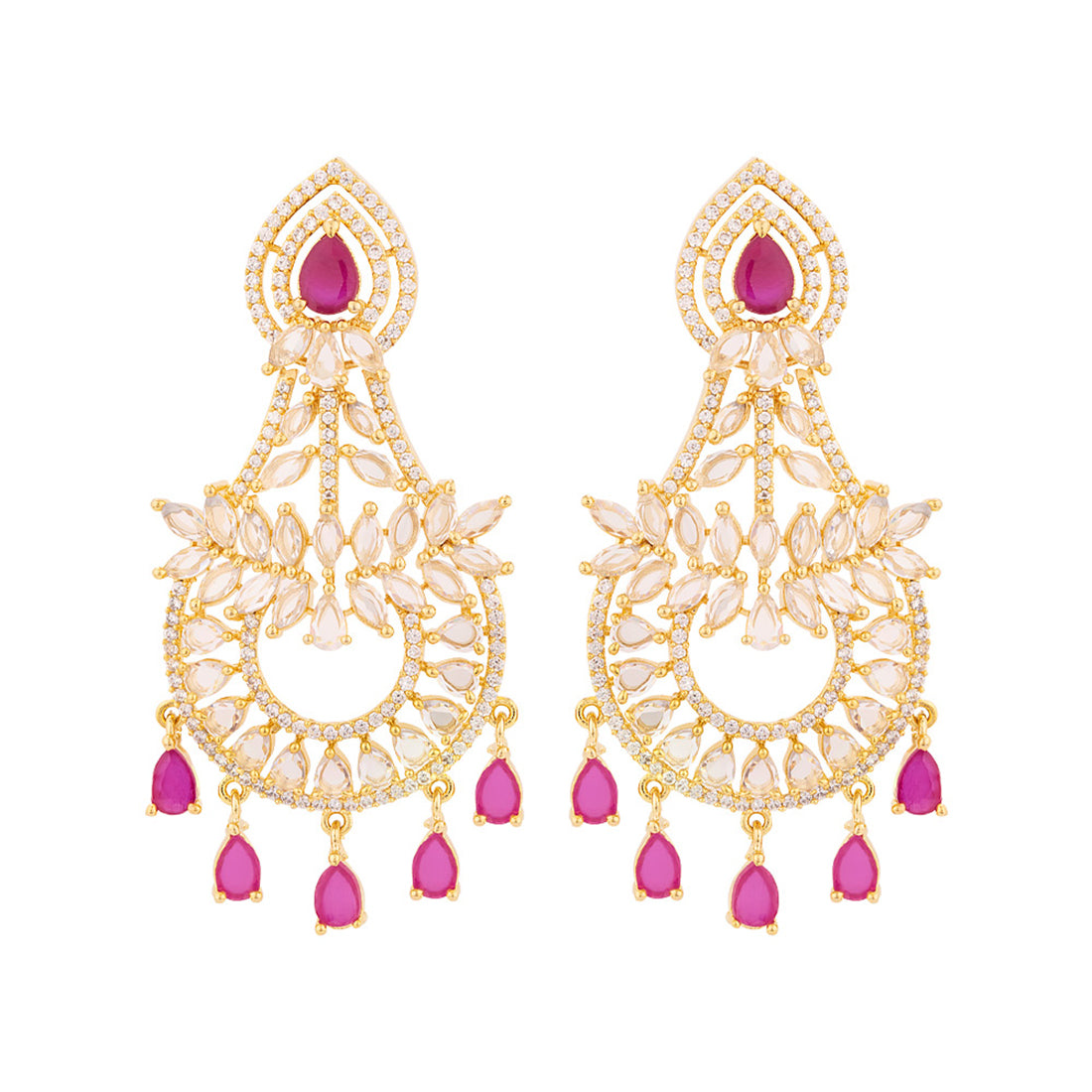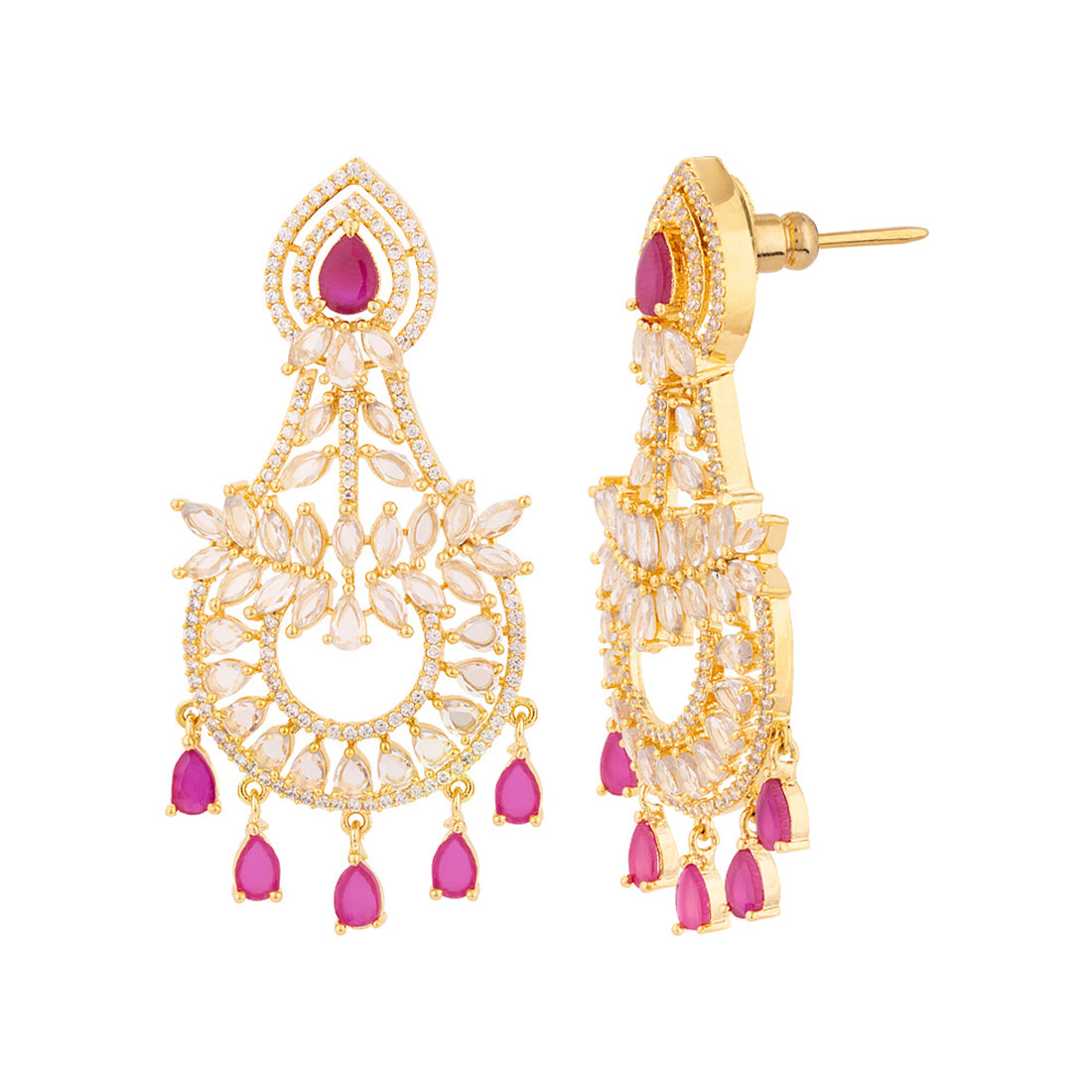 Red and white cubic zircons have been used in the embellishments of these brass earrings. Yellow gold plated, comfortable and versatile.