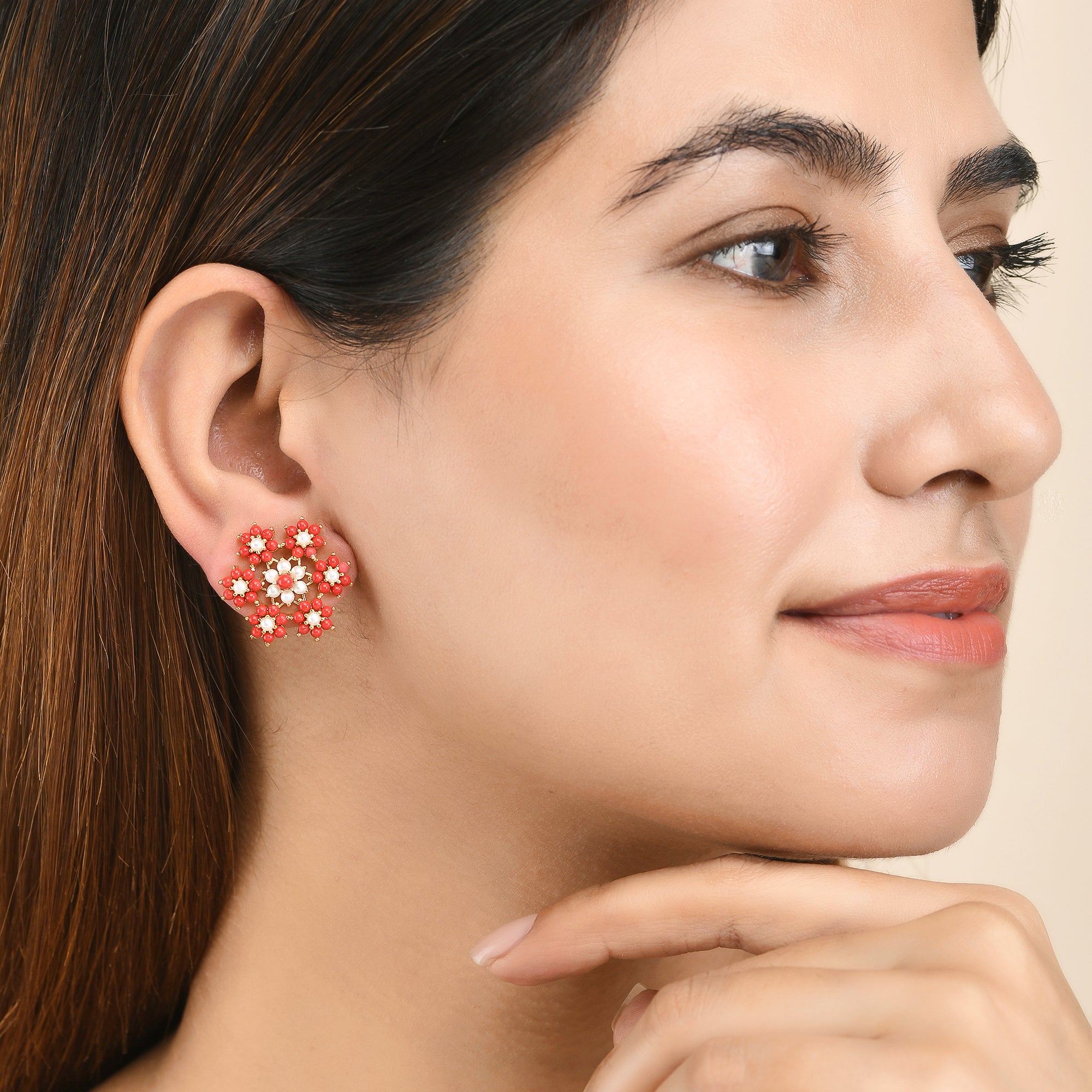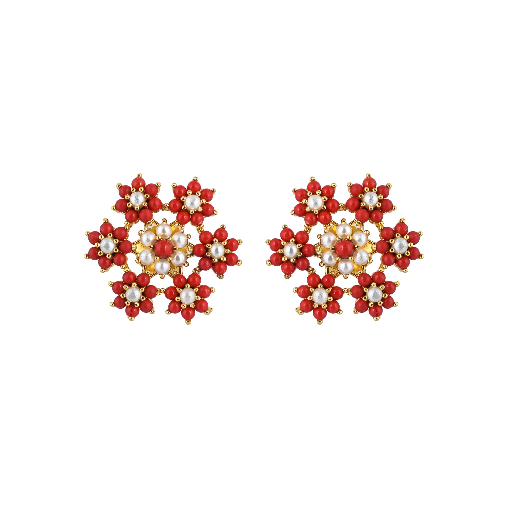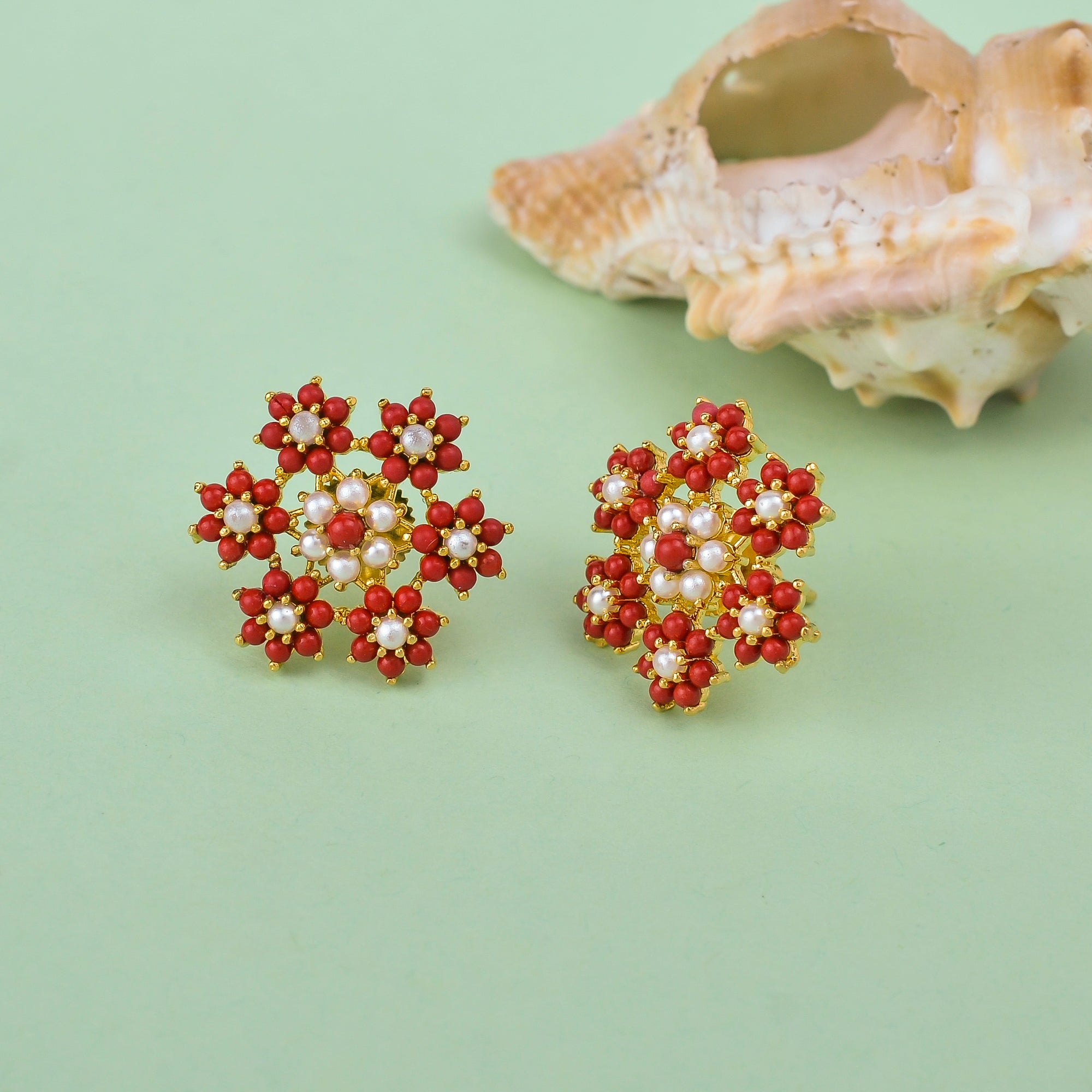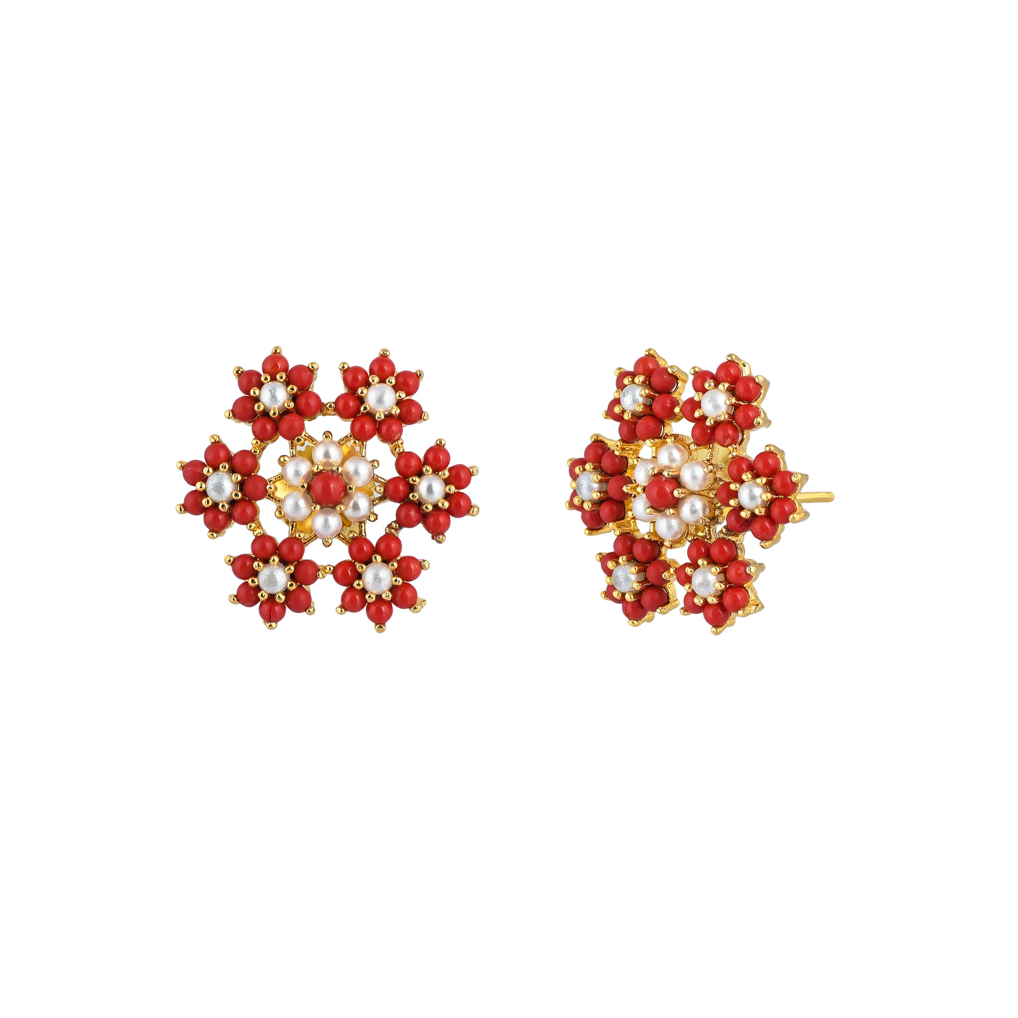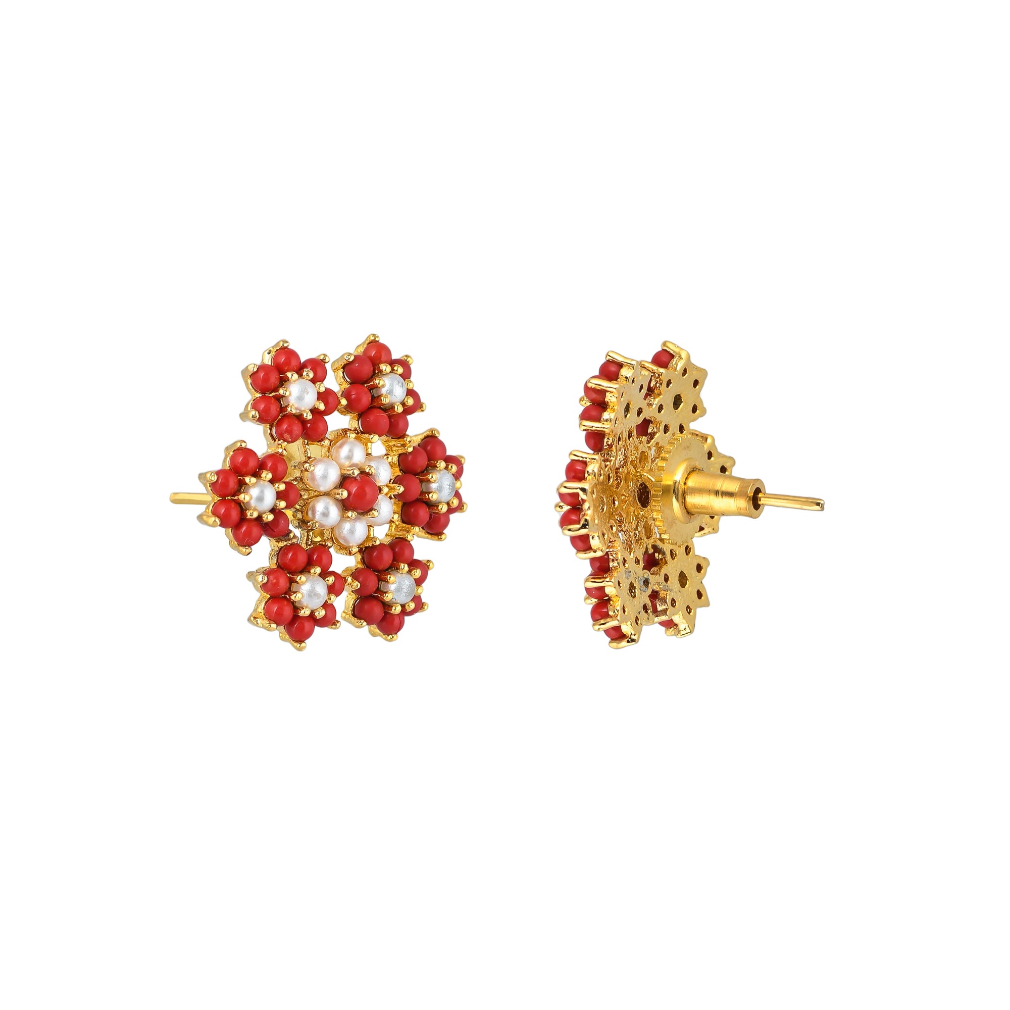 Brass pearl beaded floral bunch pattern stud earrings with red CZ gemstones. Gold plated for added charm. Pair with everyday attire.