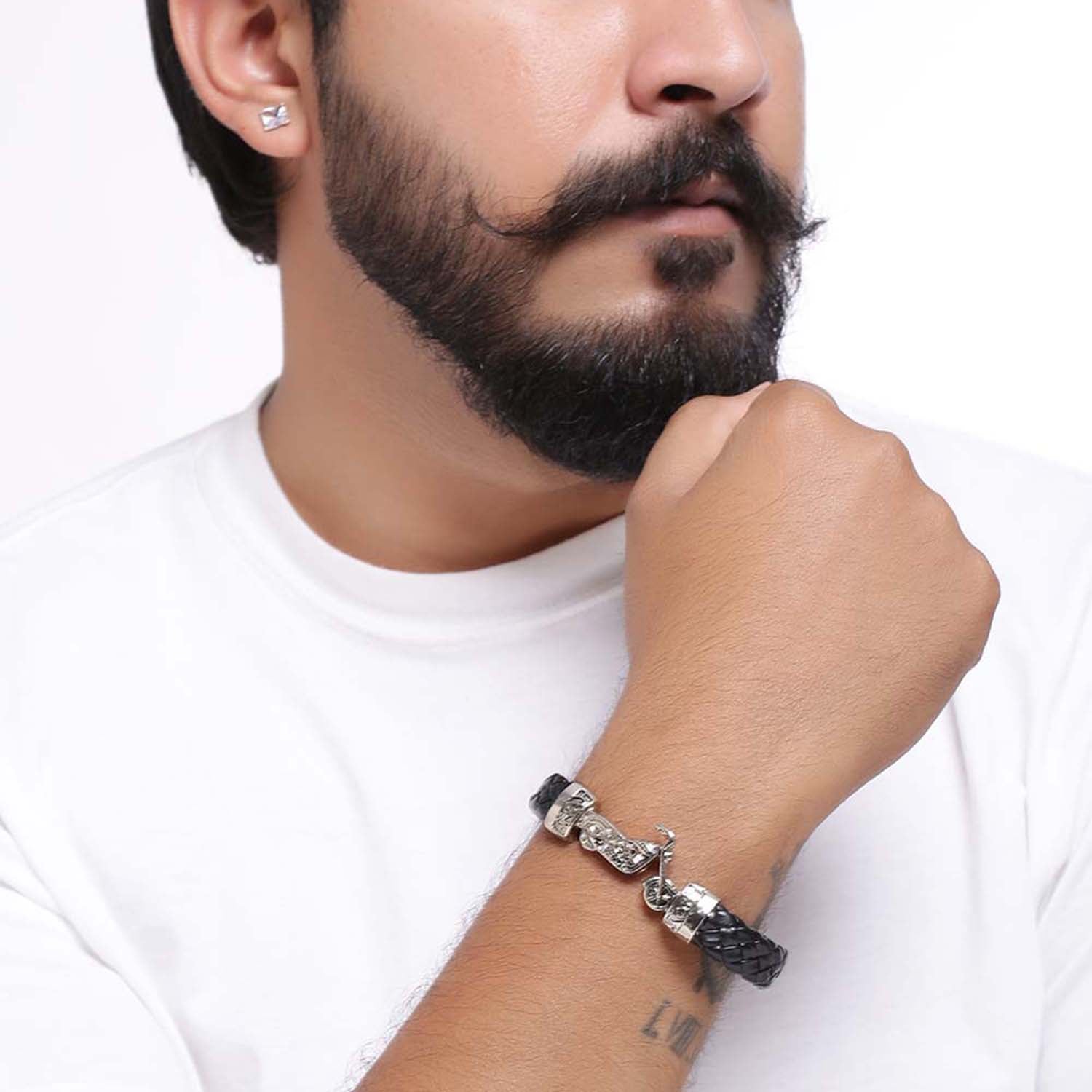 Designer inspired stainless steel bracelet for men. Silver plated and a good match for casual looks. To make your accessories last longer avoid harsh chemicals and moisture. Keep dry, clean with dry cloth and wear with panache. "India?s largest fashion jewelry brand DARE, comes from the House of Voylla as a limited edition of handcrafted accessories for the modern Indian men. "