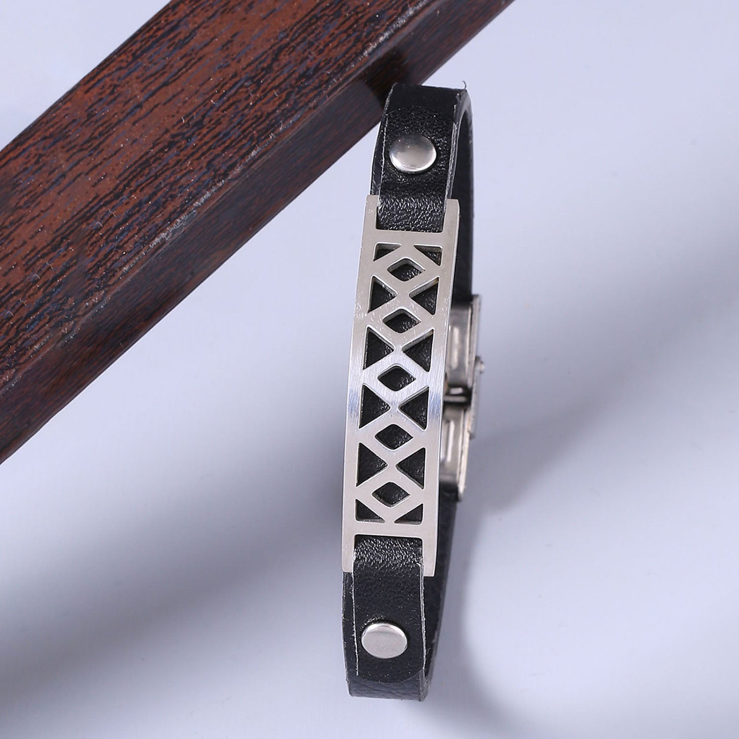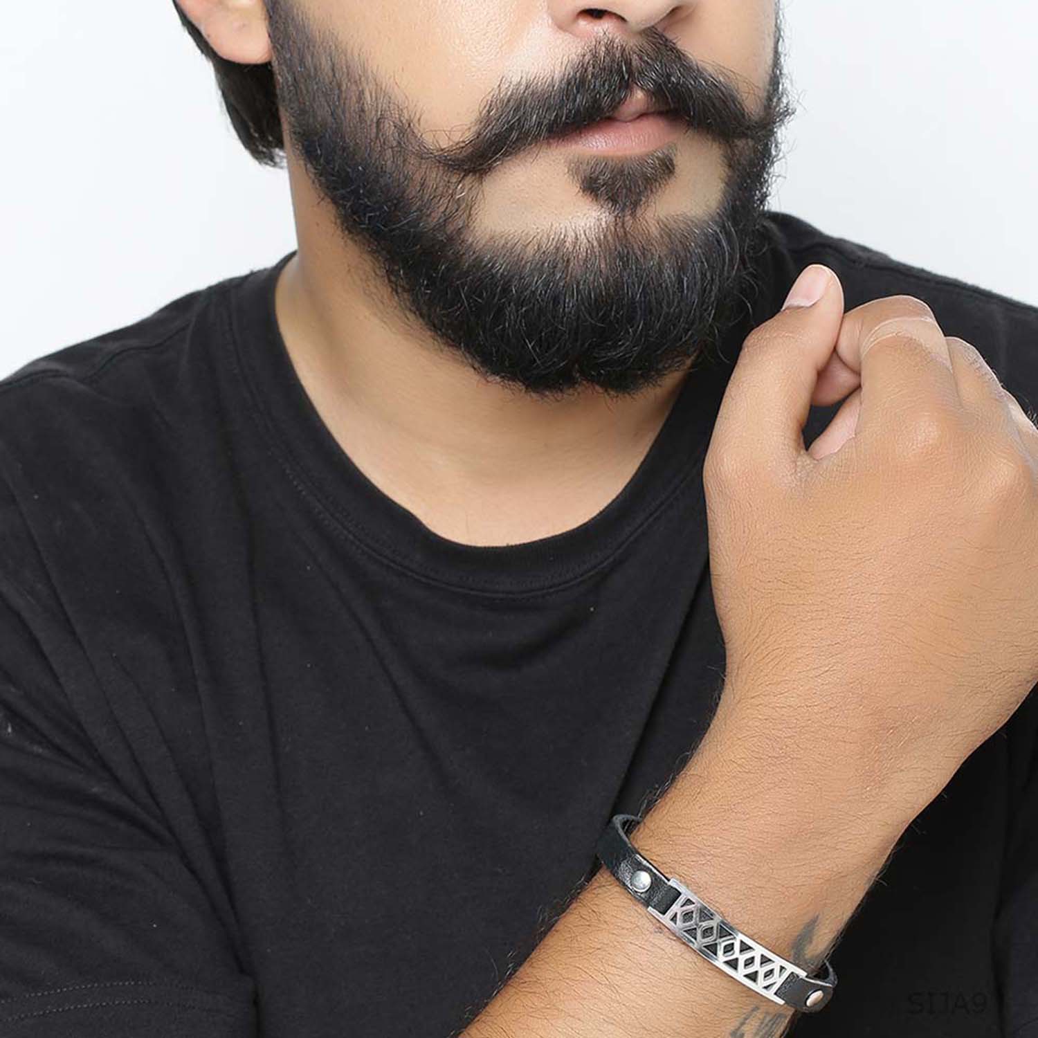 Lightly embellished bracelet for men. Made from stainless steel and silver plated. Good for casual wear.
