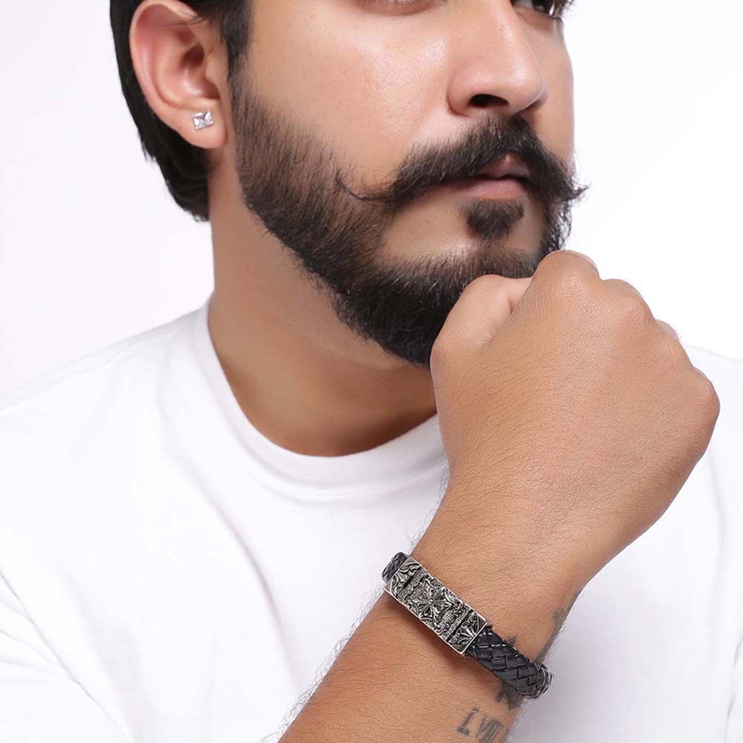 Tribal inspired men's bracelet. Made from stainless steel and silver plated. Wear with casual attire. To make your accessories last longer avoid harsh chemicals and moisture. Keep dry, clean with dry cloth and wear with panache. "India?s largest fashion jewelry brand DARE, comes from the House of Voylla as a limited edition of handcrafted accessories for the modern Indian men. "