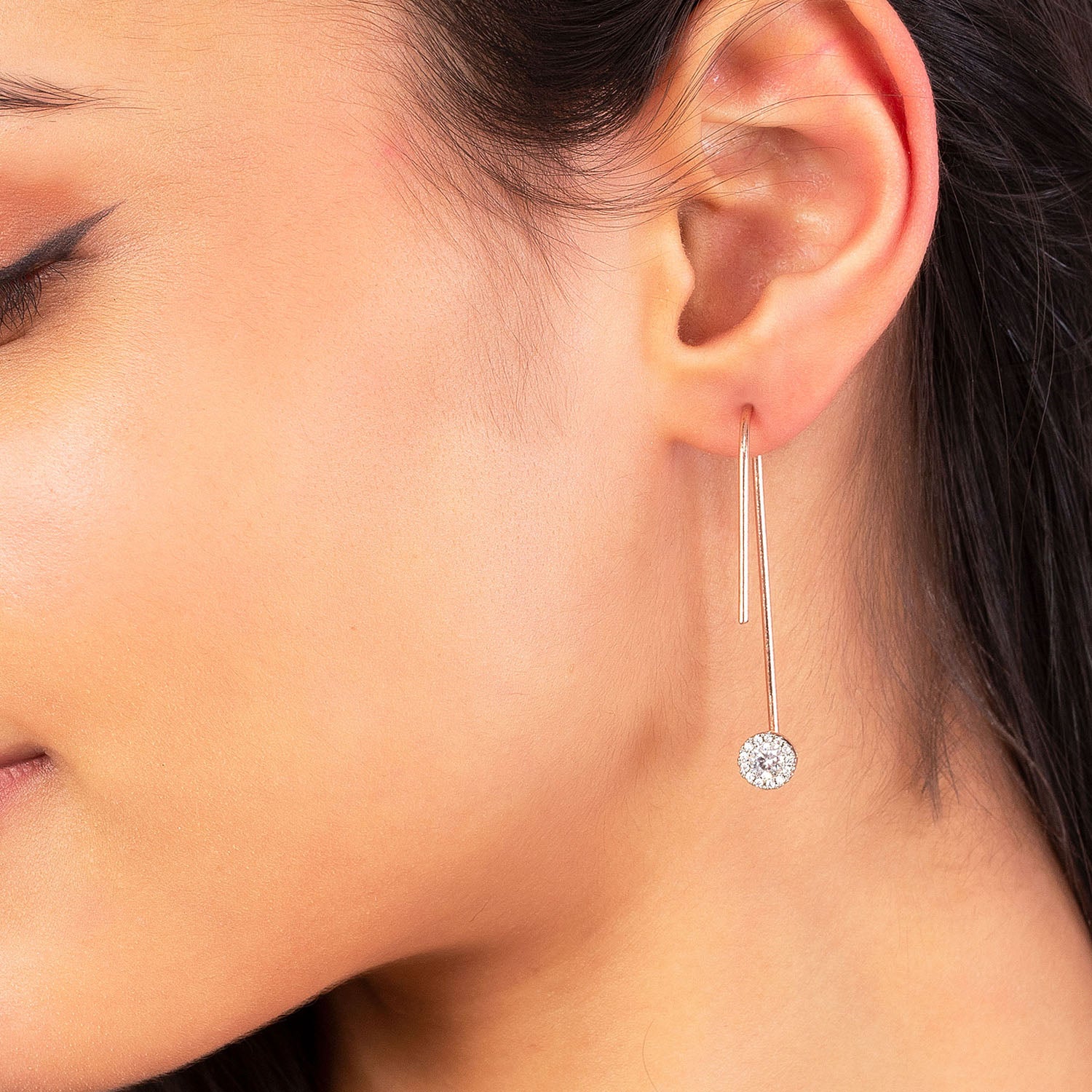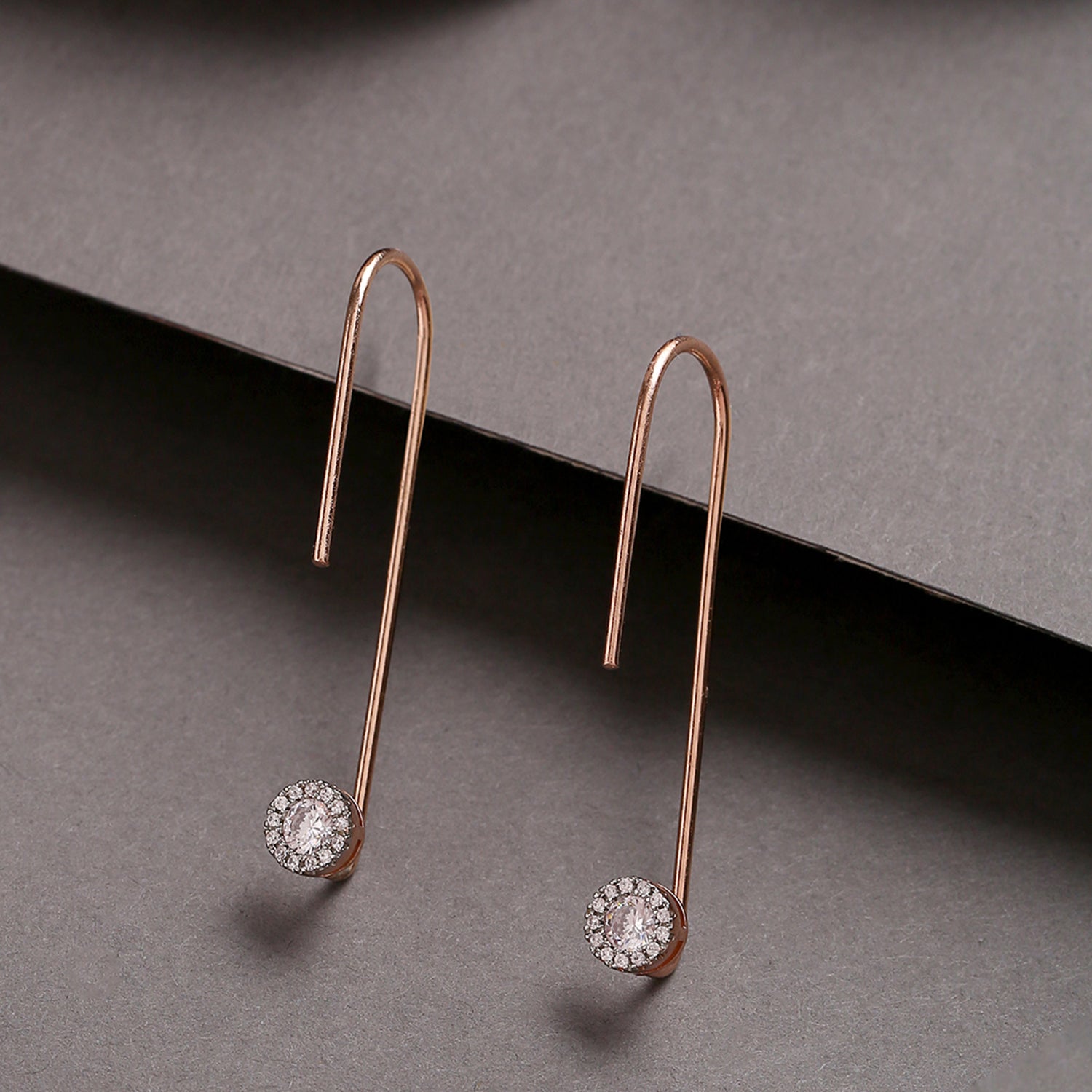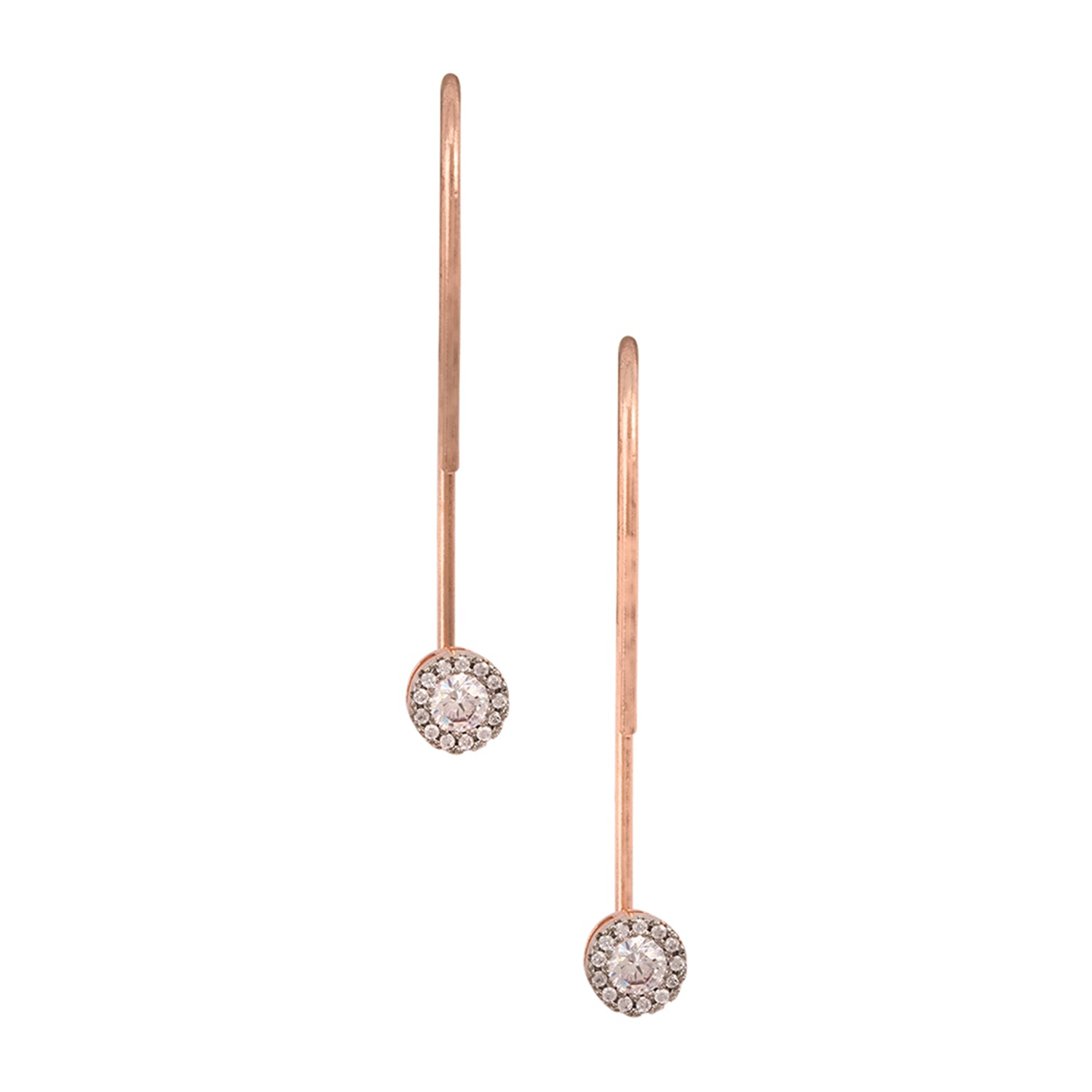 When you want your natural beauty to glow, simplicity is the way to go. These long pair of earrings are simple and luxurious that highlight the beauty in you. The high-quality American Diamond stones and rose gold plating add the right balance of sophistication to these gorgeous danglers.
