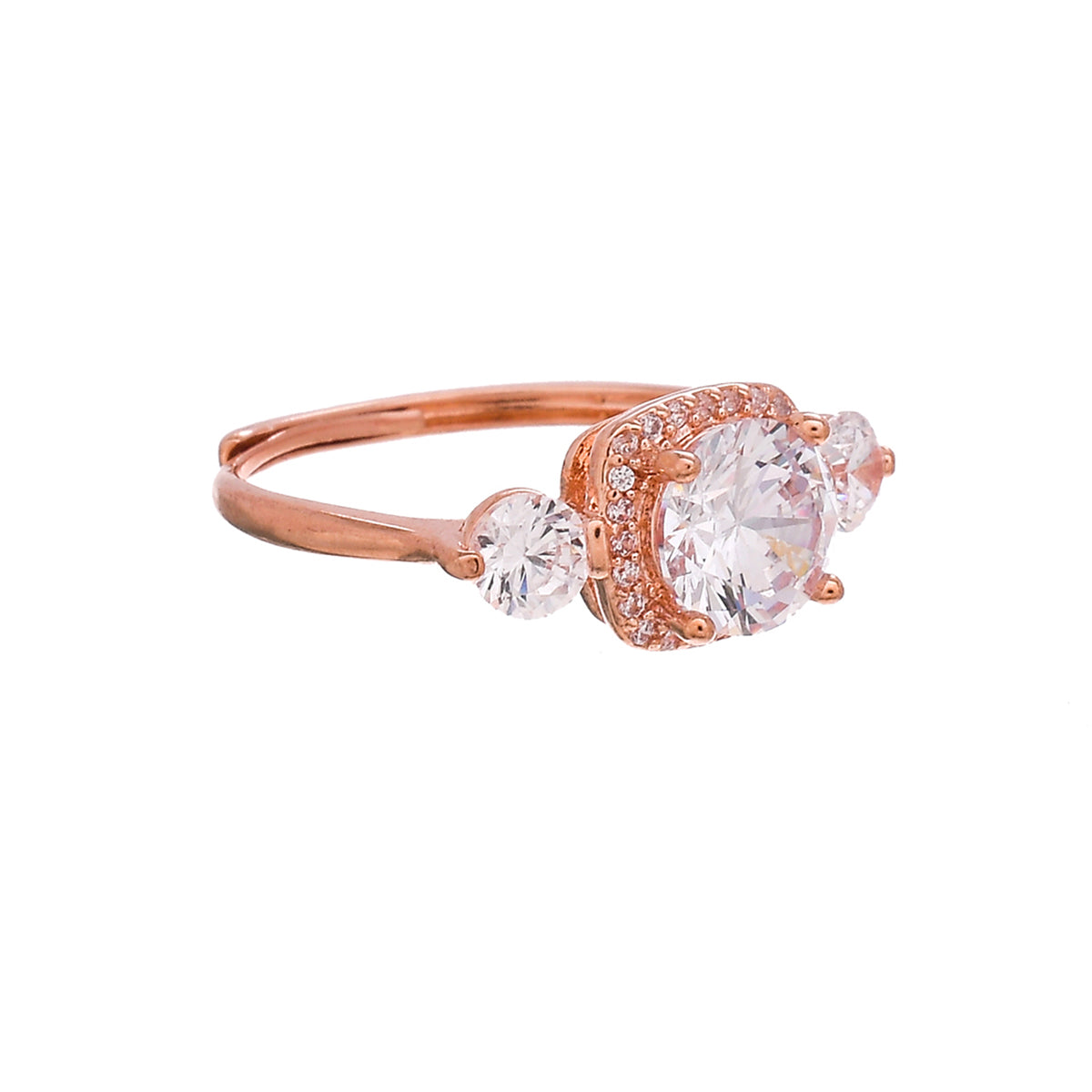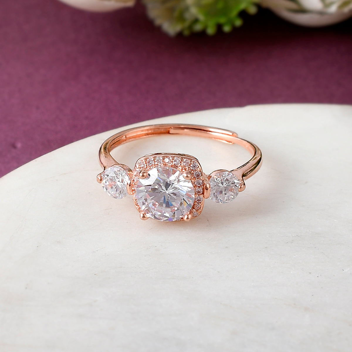 Embellished with a large emerald cut zircon and tinier round cut gemstones, this brass ring has been given an opulent rose gold plating. The ring is perfect for formal wear and can also be paired with casual, everyday looks.