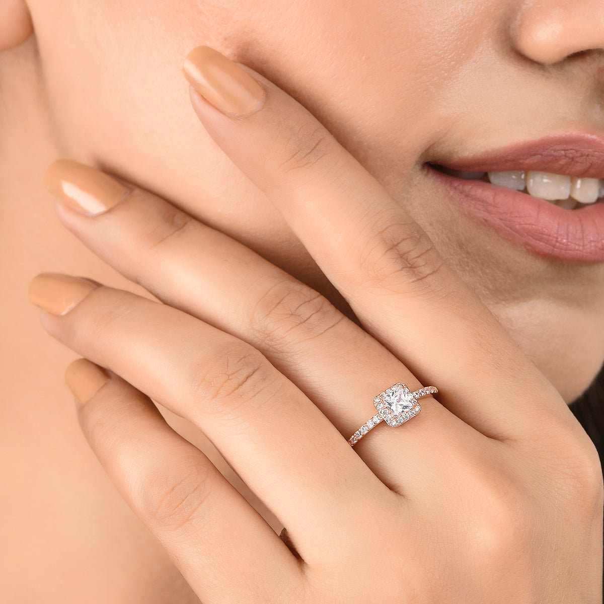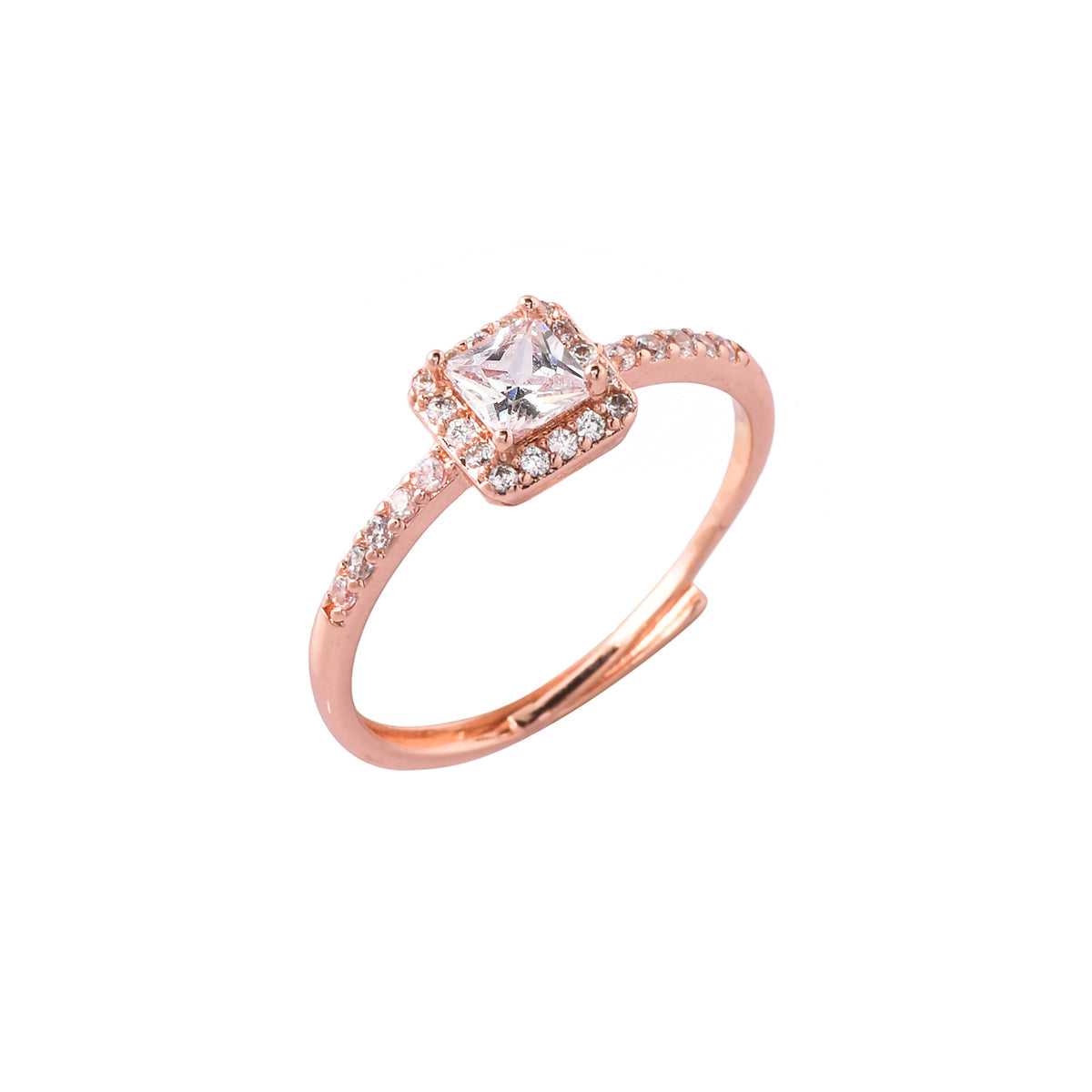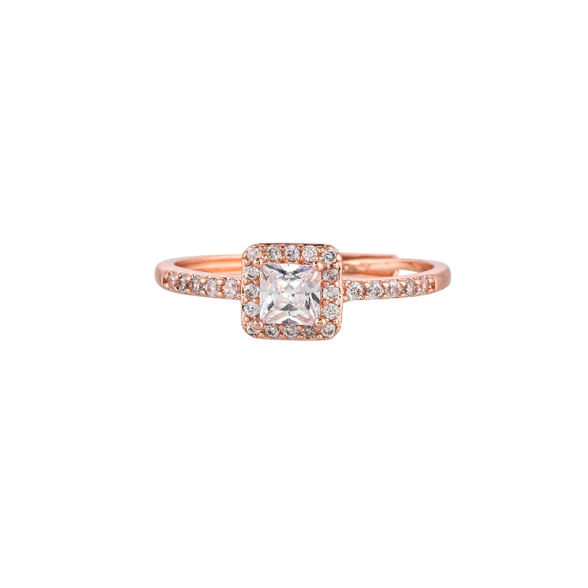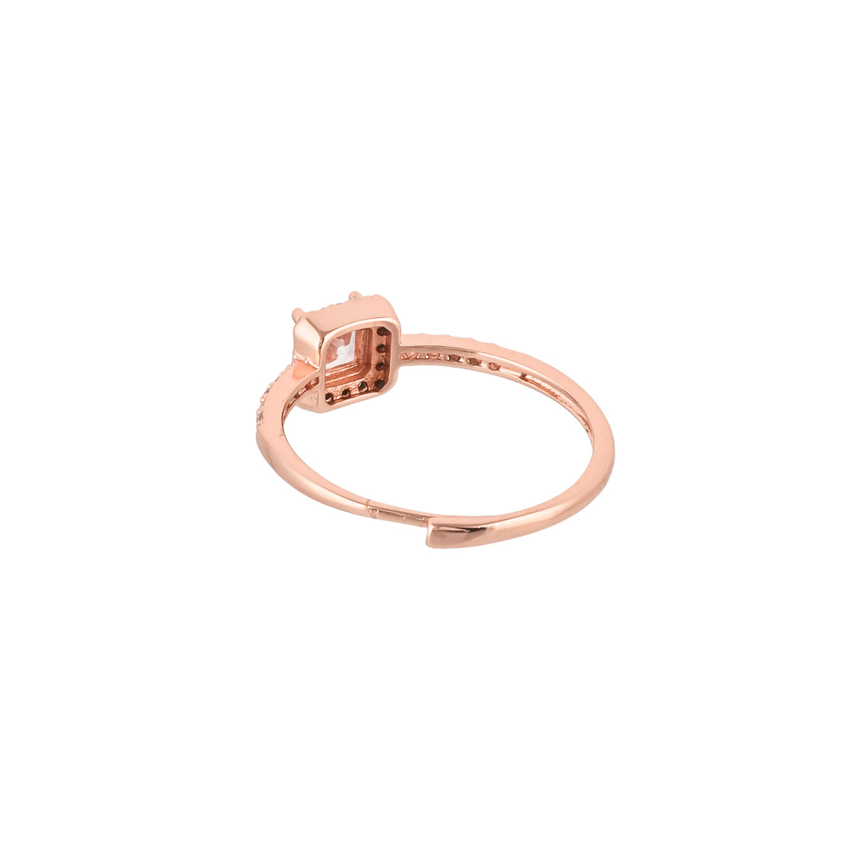Embellished with an emerald cut zircon gemstone in a classic cushion setting, this ring has been fashioned out of quality brass. Rose gold plating adds to the charm of this lightweight piece, which is versatile enough to be paired with everything.