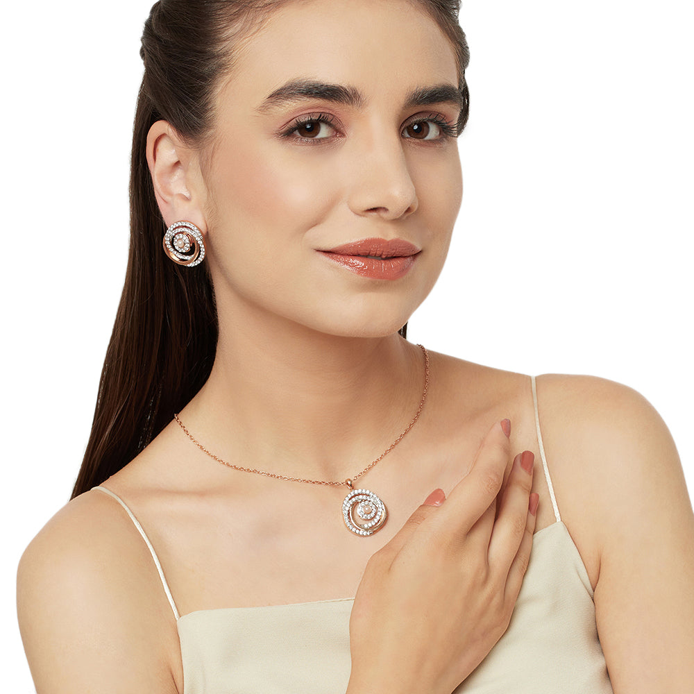 A charming, vintage inspired pendant set, fashioned out of brass and embellished with faux white pearls and zirconia gemstones in a round cut and cluster setting. Rose gold plating adds to the allure of this set, which is lightweight and comfortable. The pendant and earrings can be paired with cocktail dresses, designer sarees or even work wear.
