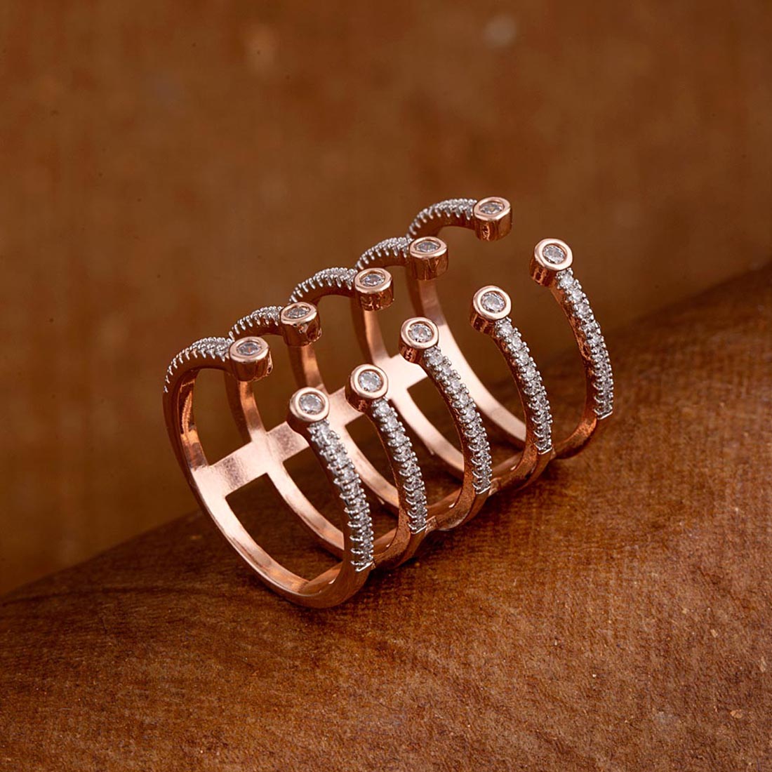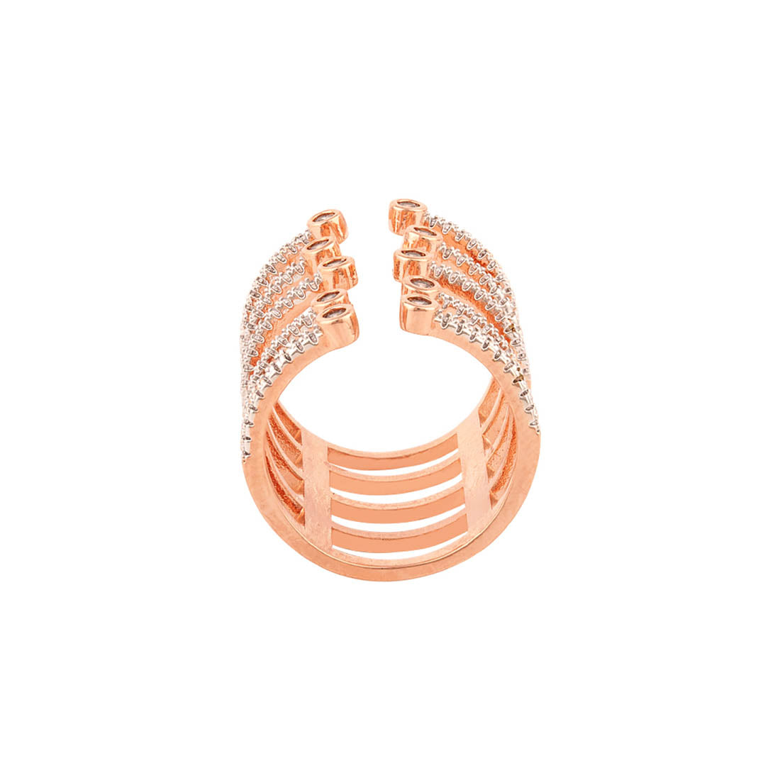 Rose gold plated layered style gems embellished ring. Made from brass. Good for formal looks.