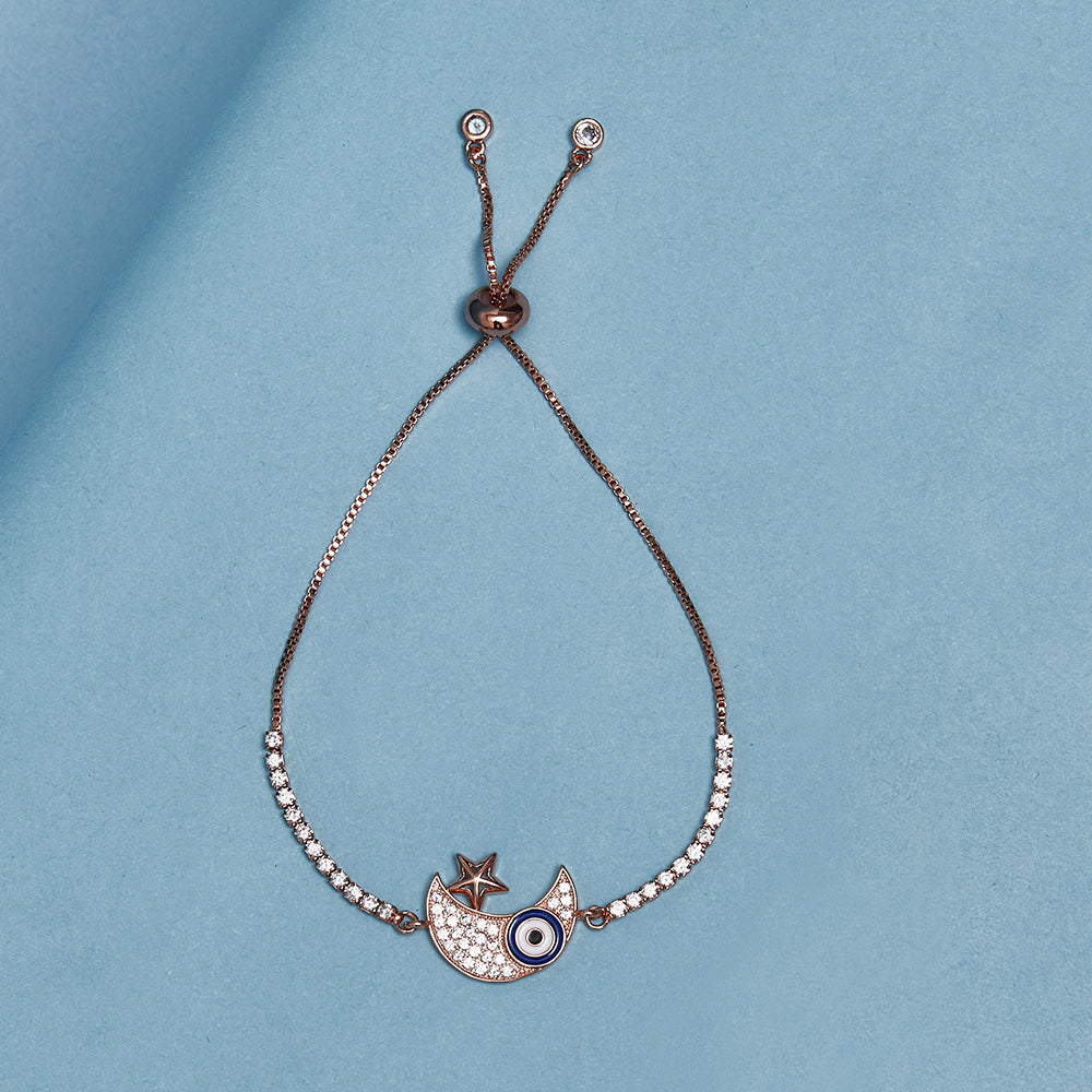 Rose Gold Plated Zircons Adorned Evil Eye Crescent and Star Charm Brass Bracelet