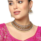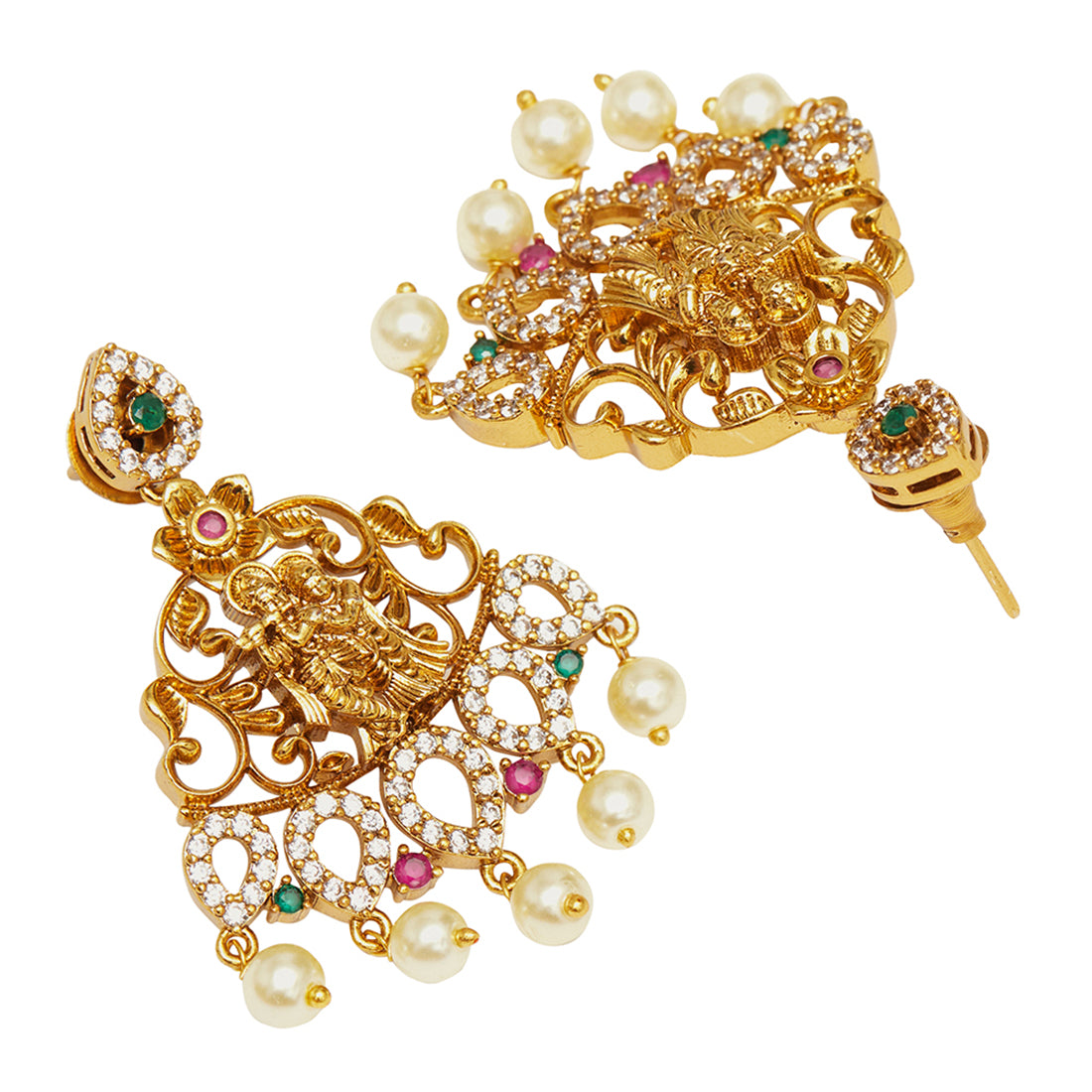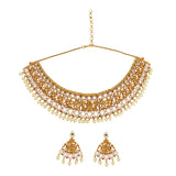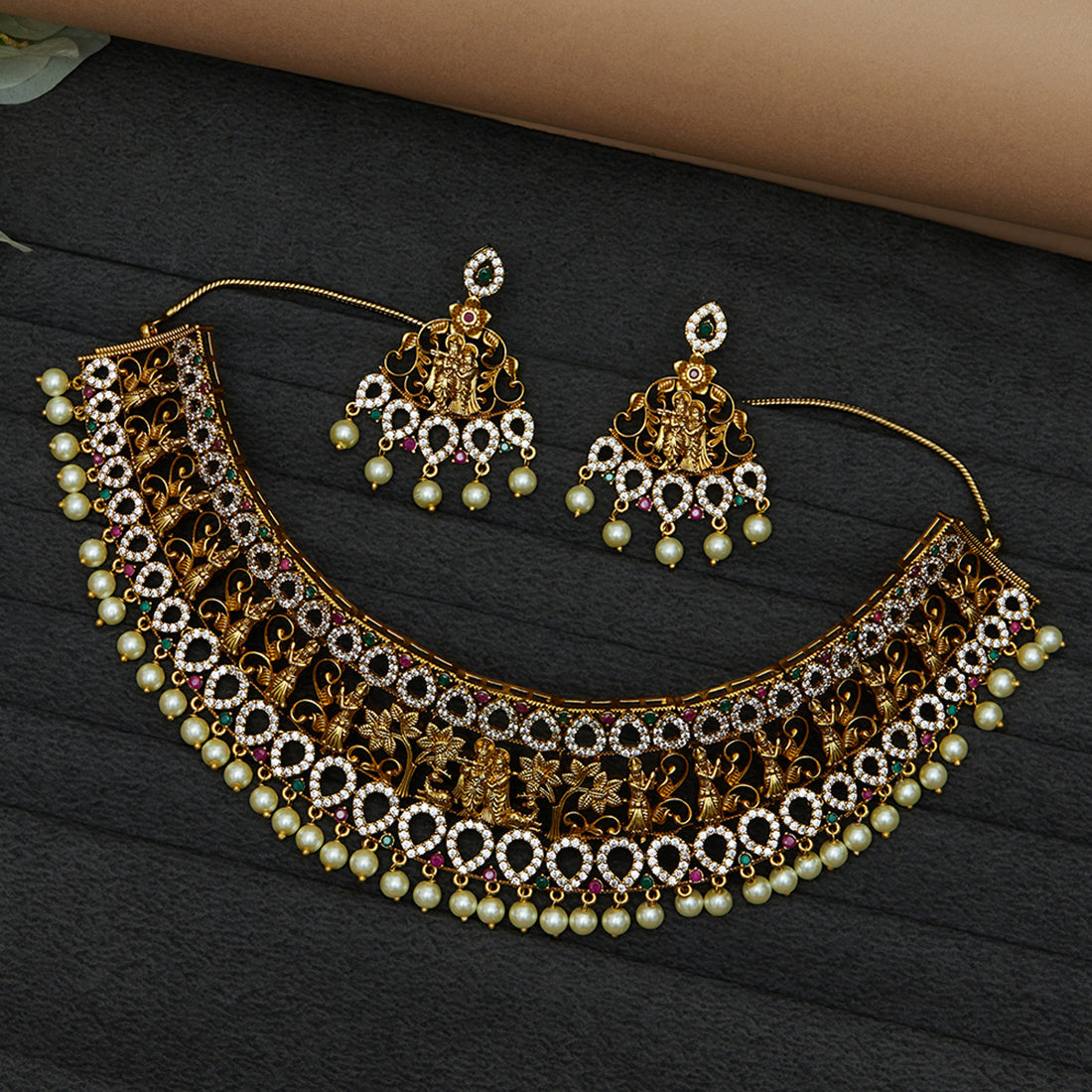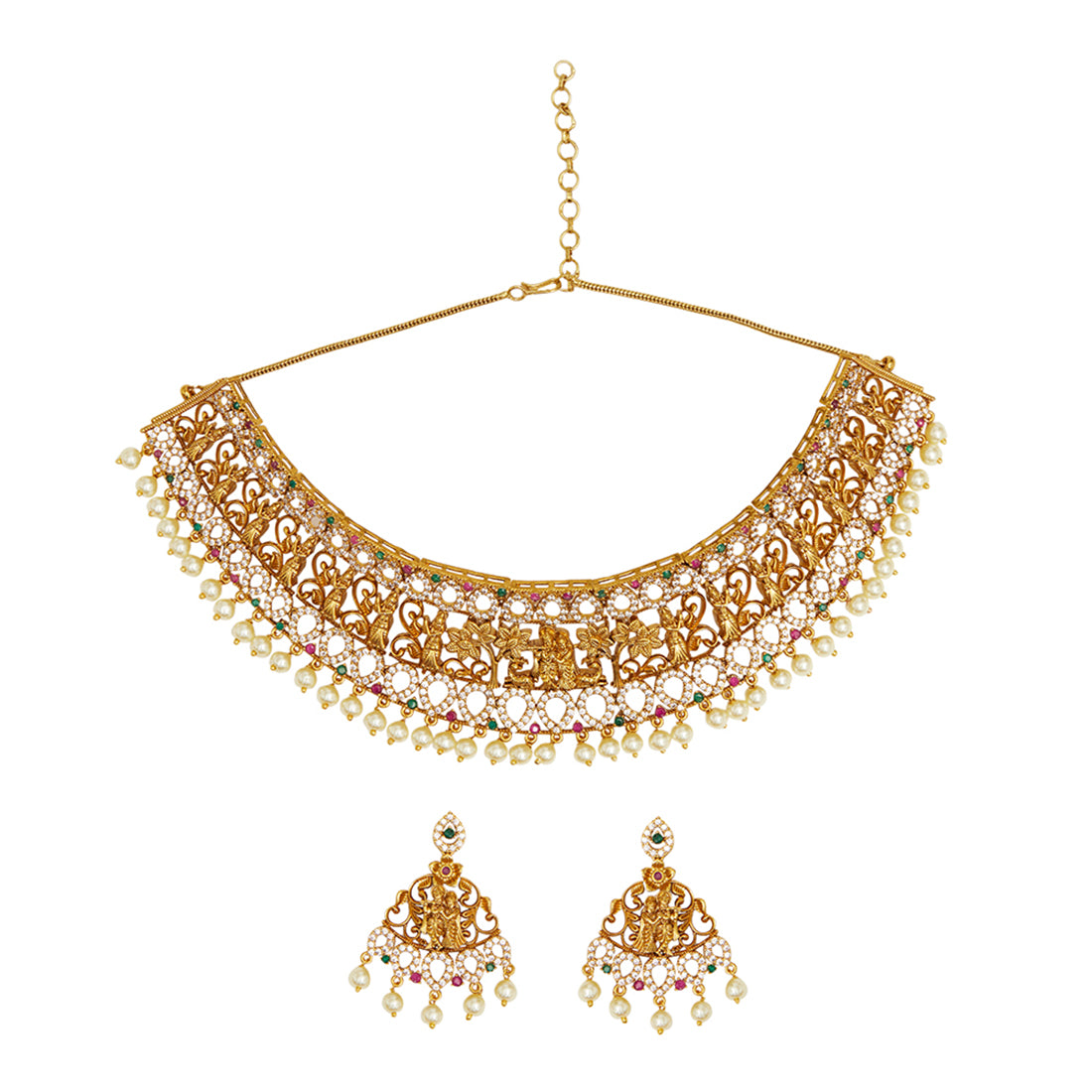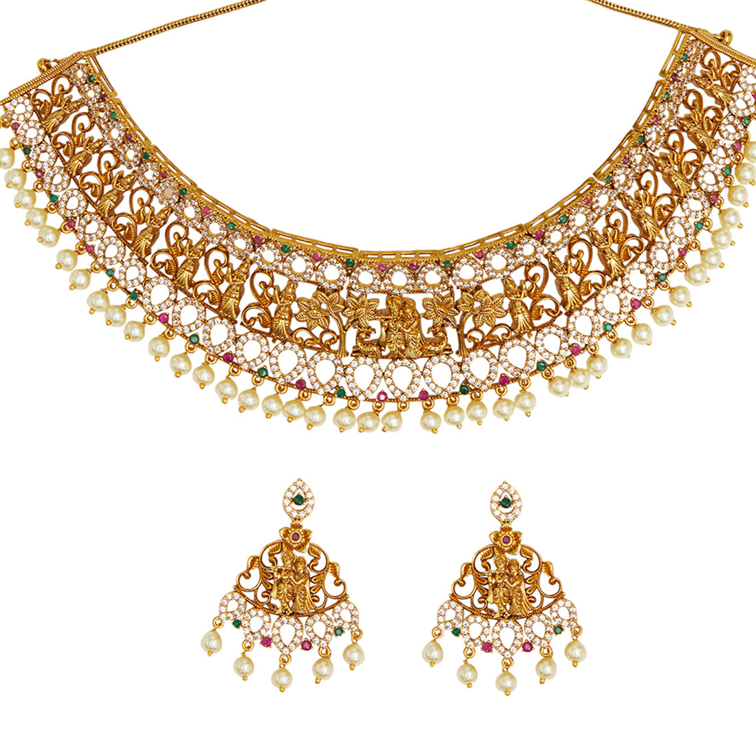 An opulent jewellery set, fashioned out of brass and embellished with round cut zirconia gemstones and faux pearls. The necklace and matching drop earrings have been given a yellow gold plating. Pair the set with a traditional silk saree.'