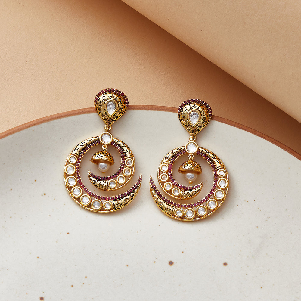 Round Cut Faux Kundan Gold Plated Brass Drop Earrings