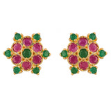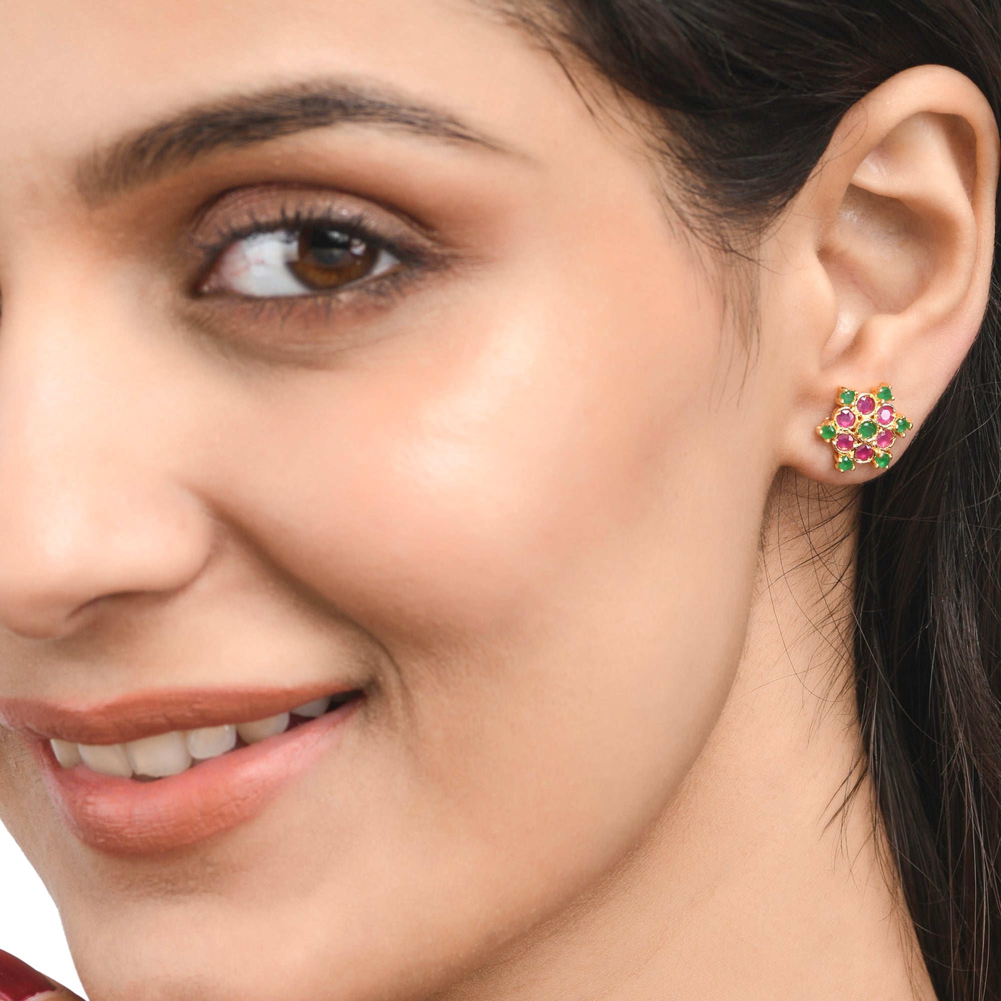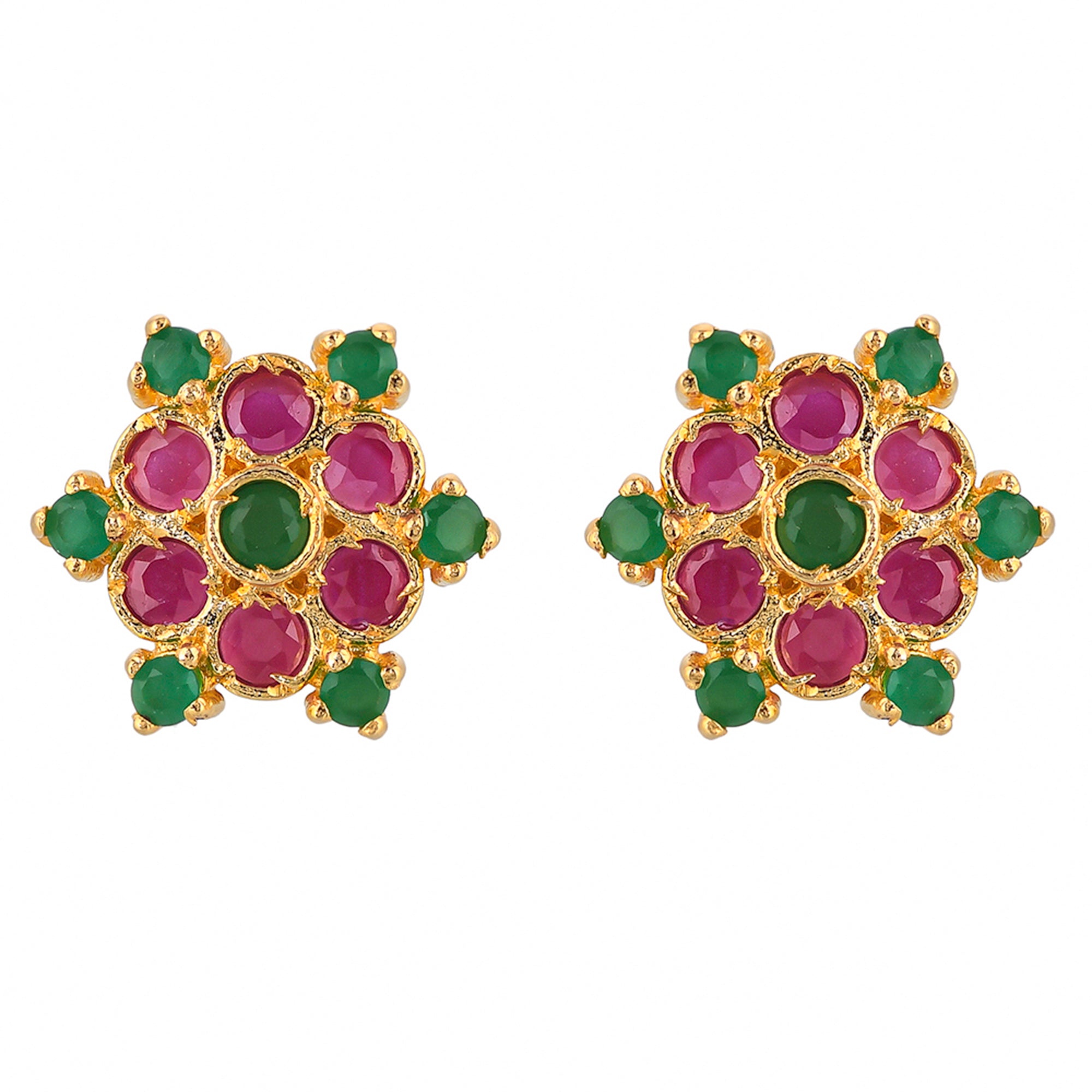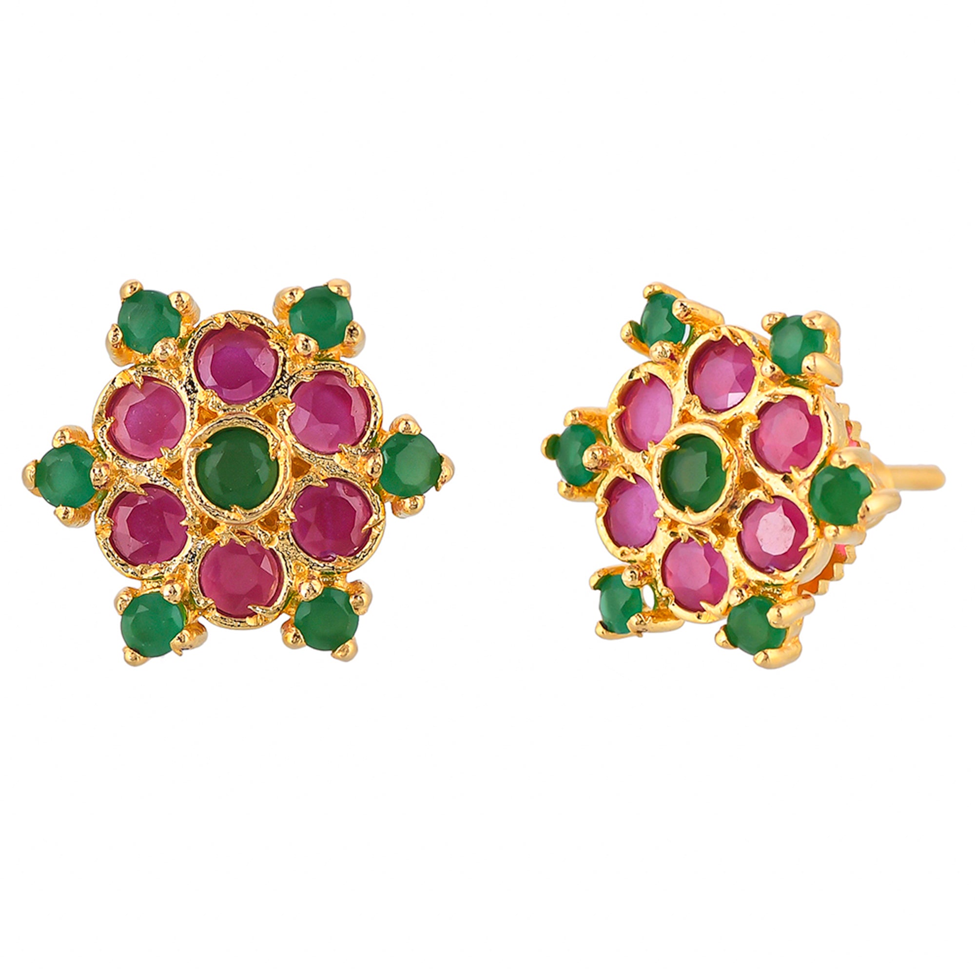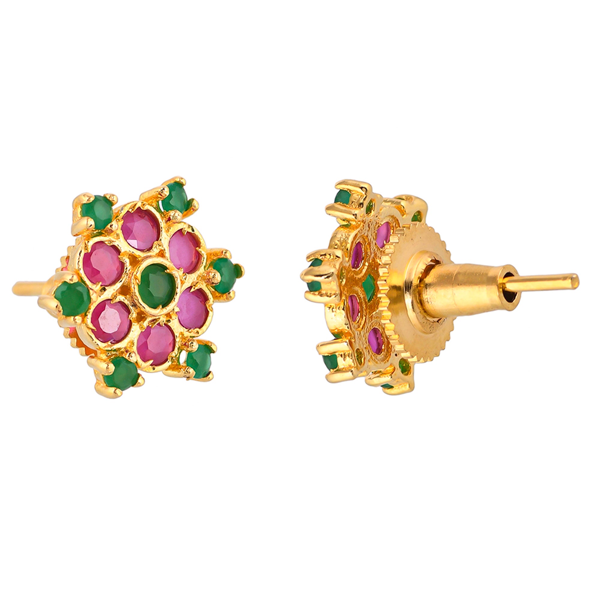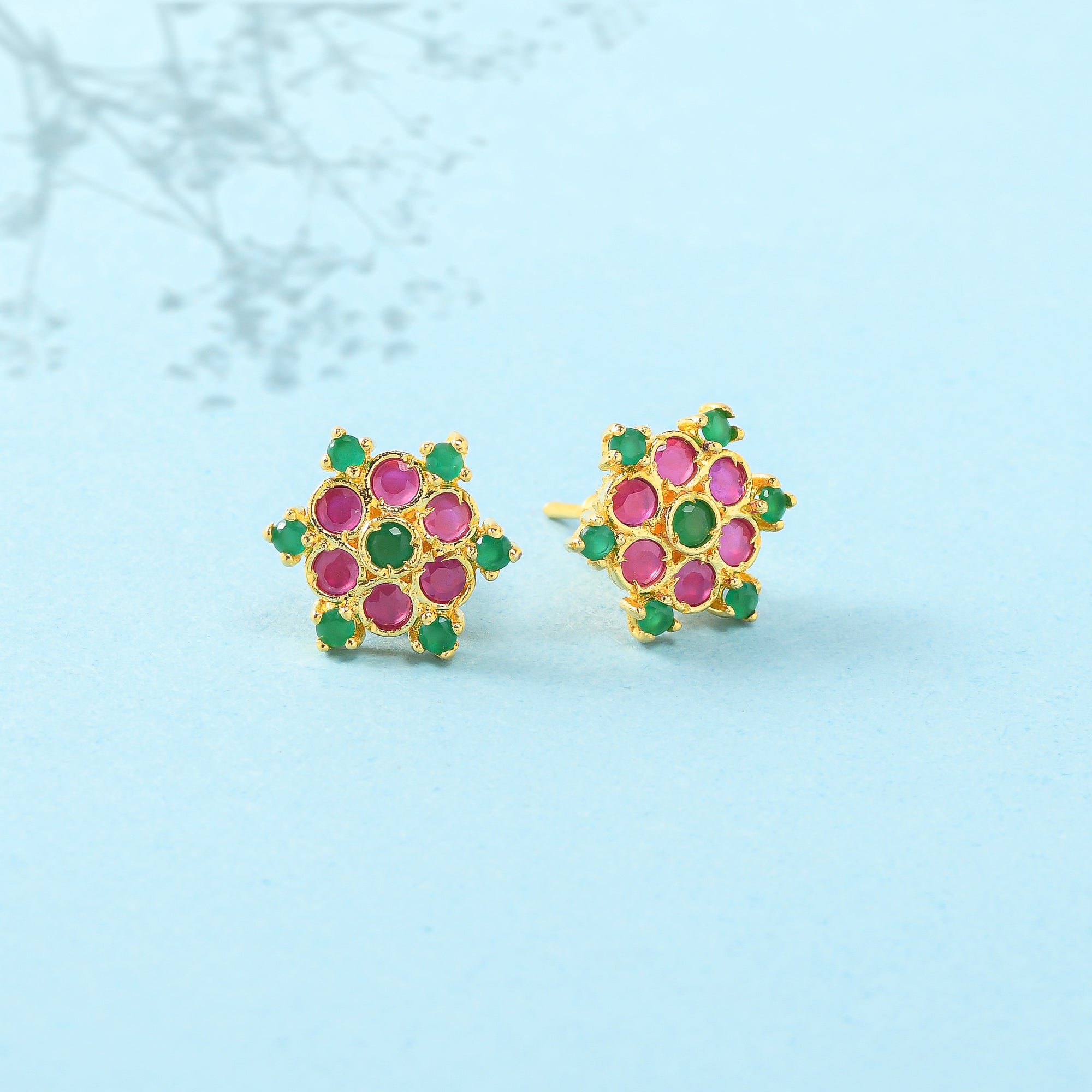 Round cut pink zirconia gemstones stud earrings with classic gold plating. Made from brass. Lightweight and versatile.