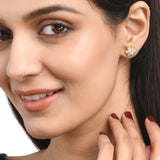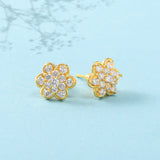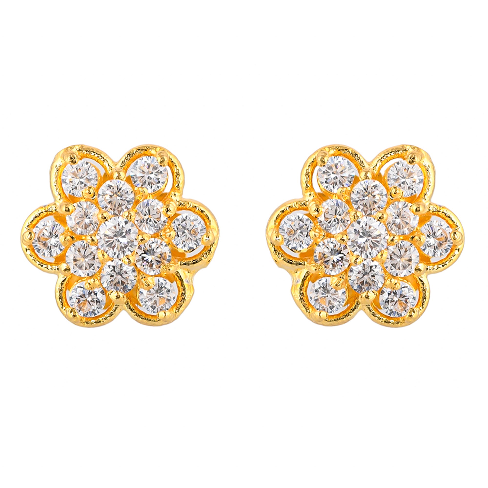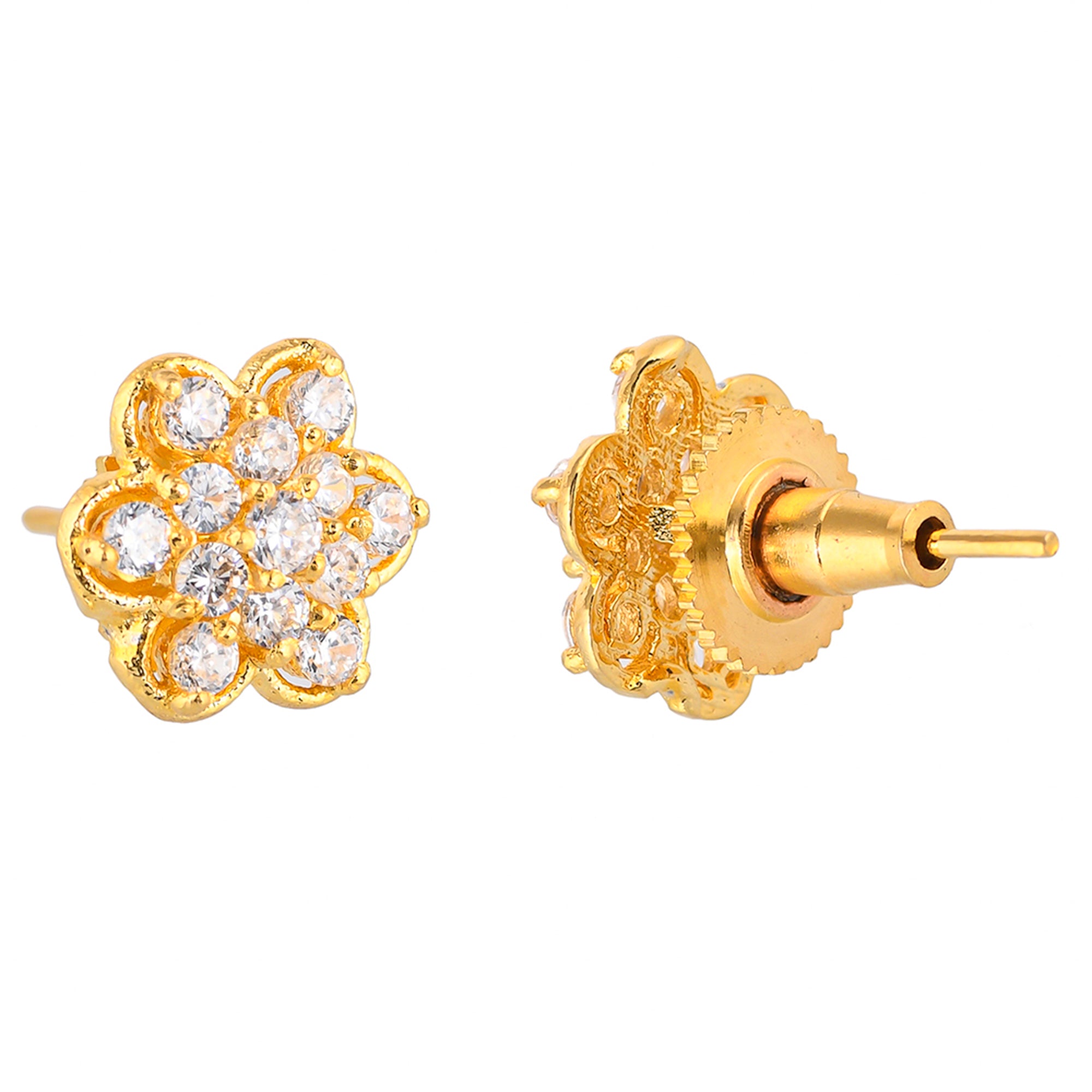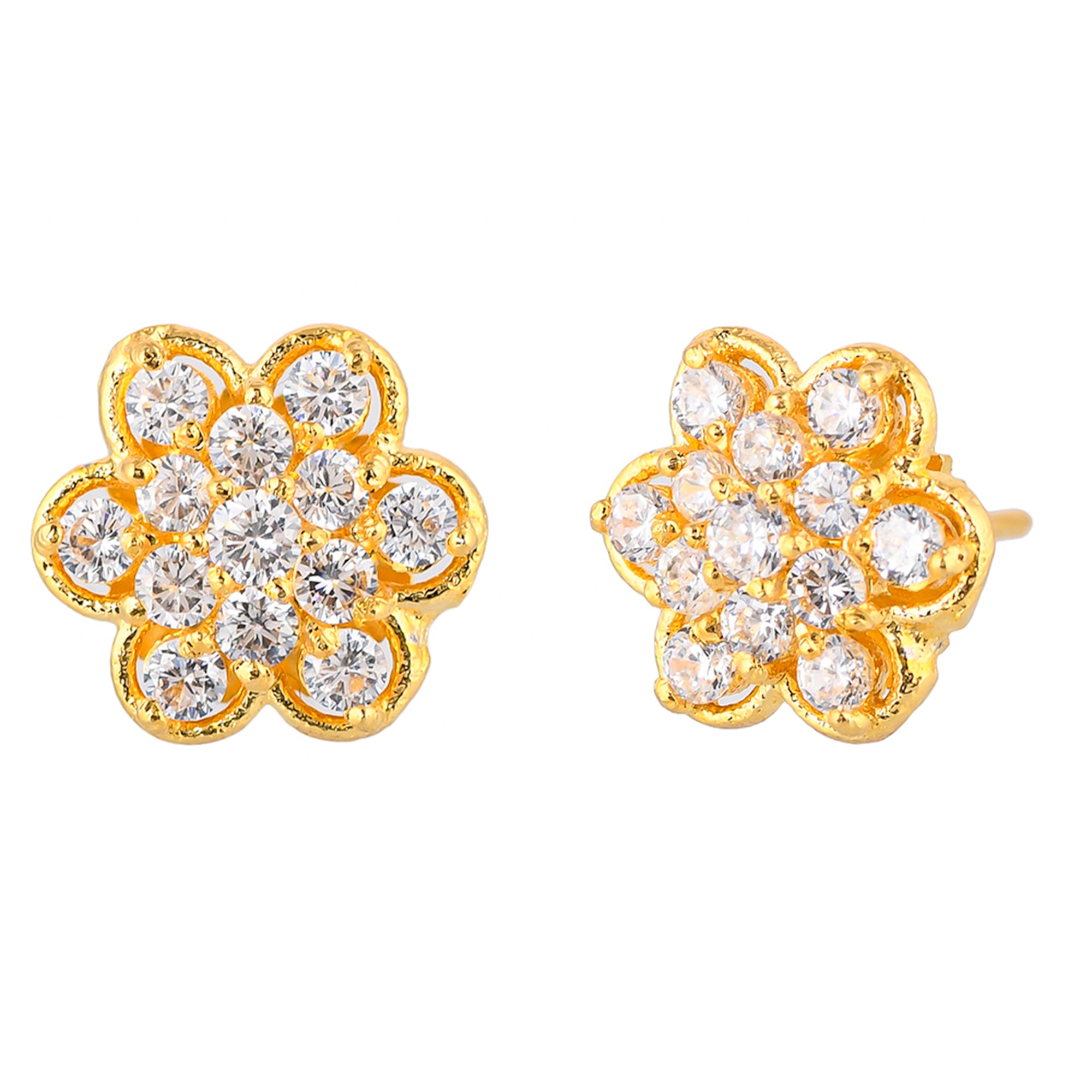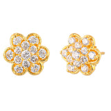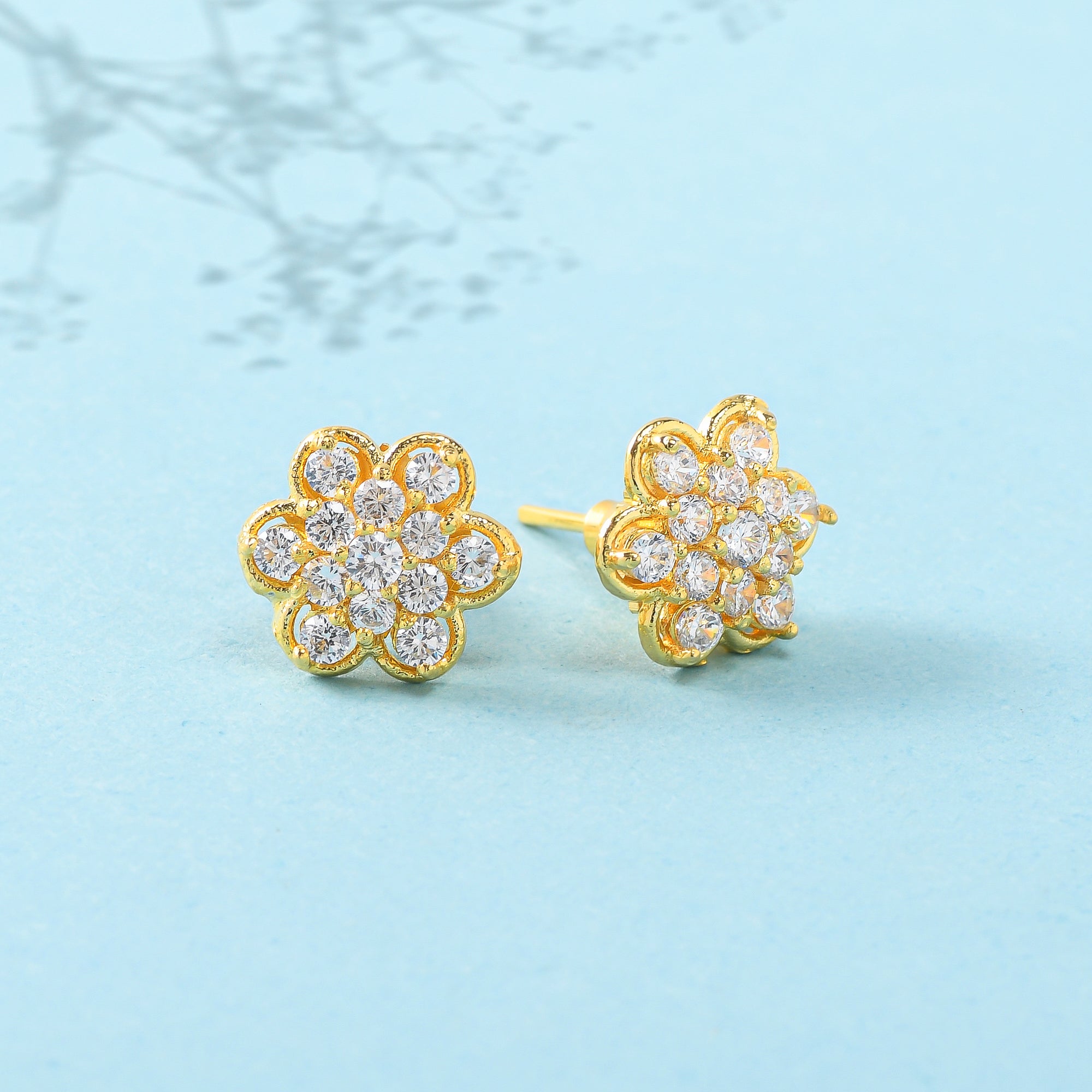Brass stud earrings with white round cut CZ gems, fashioned into a floral design. Gold plated, versatile and comfortable.