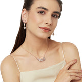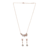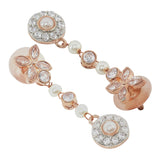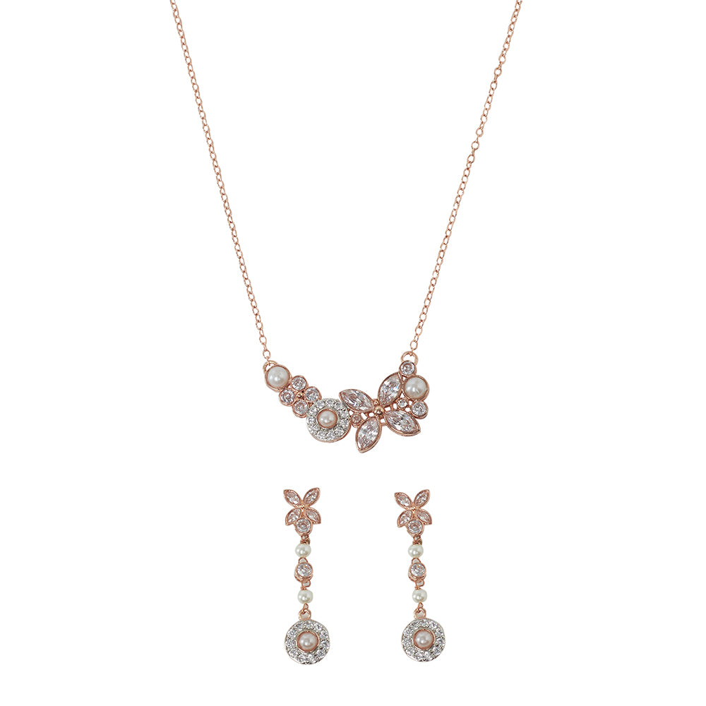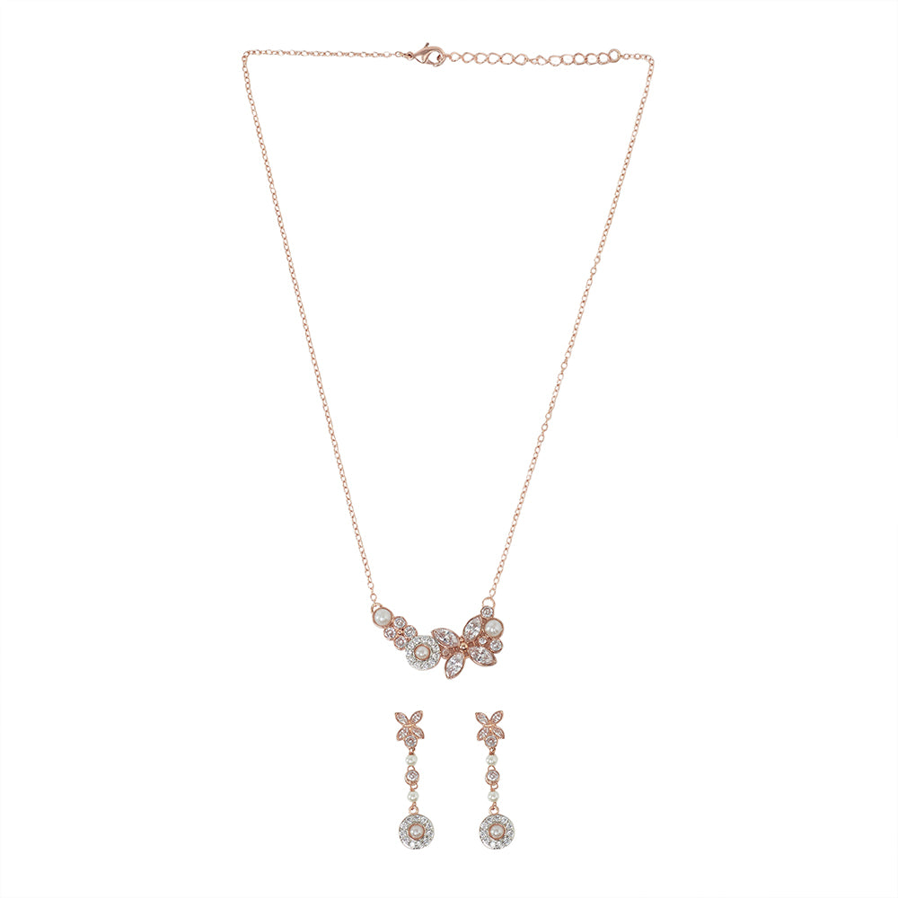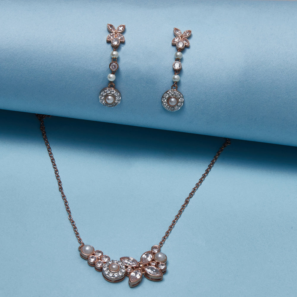 A delicate pendant set, made with brass and plated with yellow gold. The pendant, attached to a rope chain, and matching drop earrings have been embellished with faux pearls and round cut cubic zirconia gemstones. Pair the set with a designer saree or cocktail dress.
