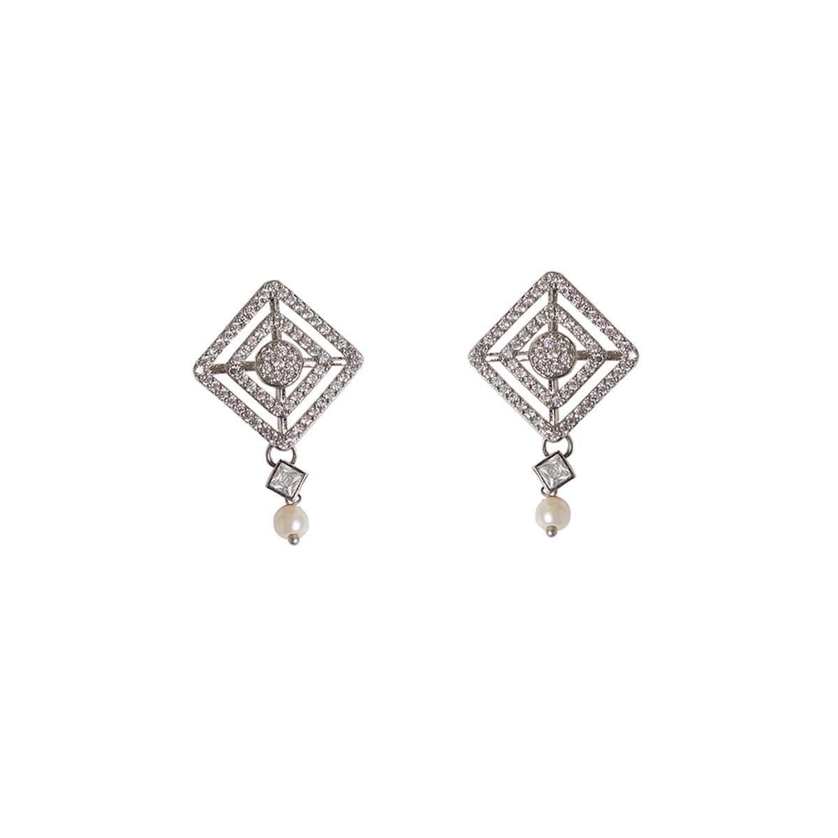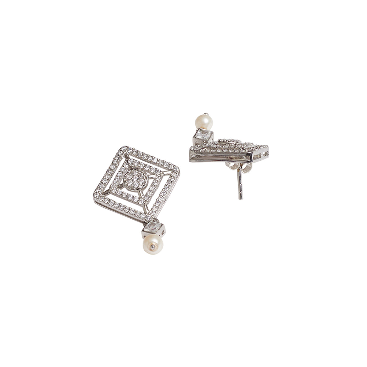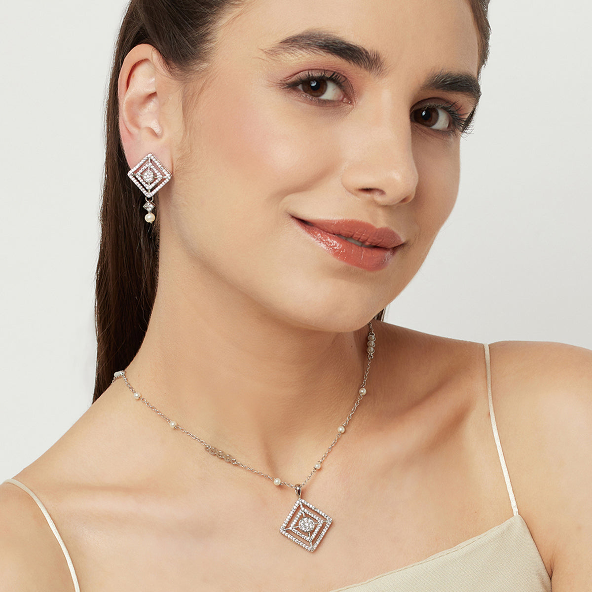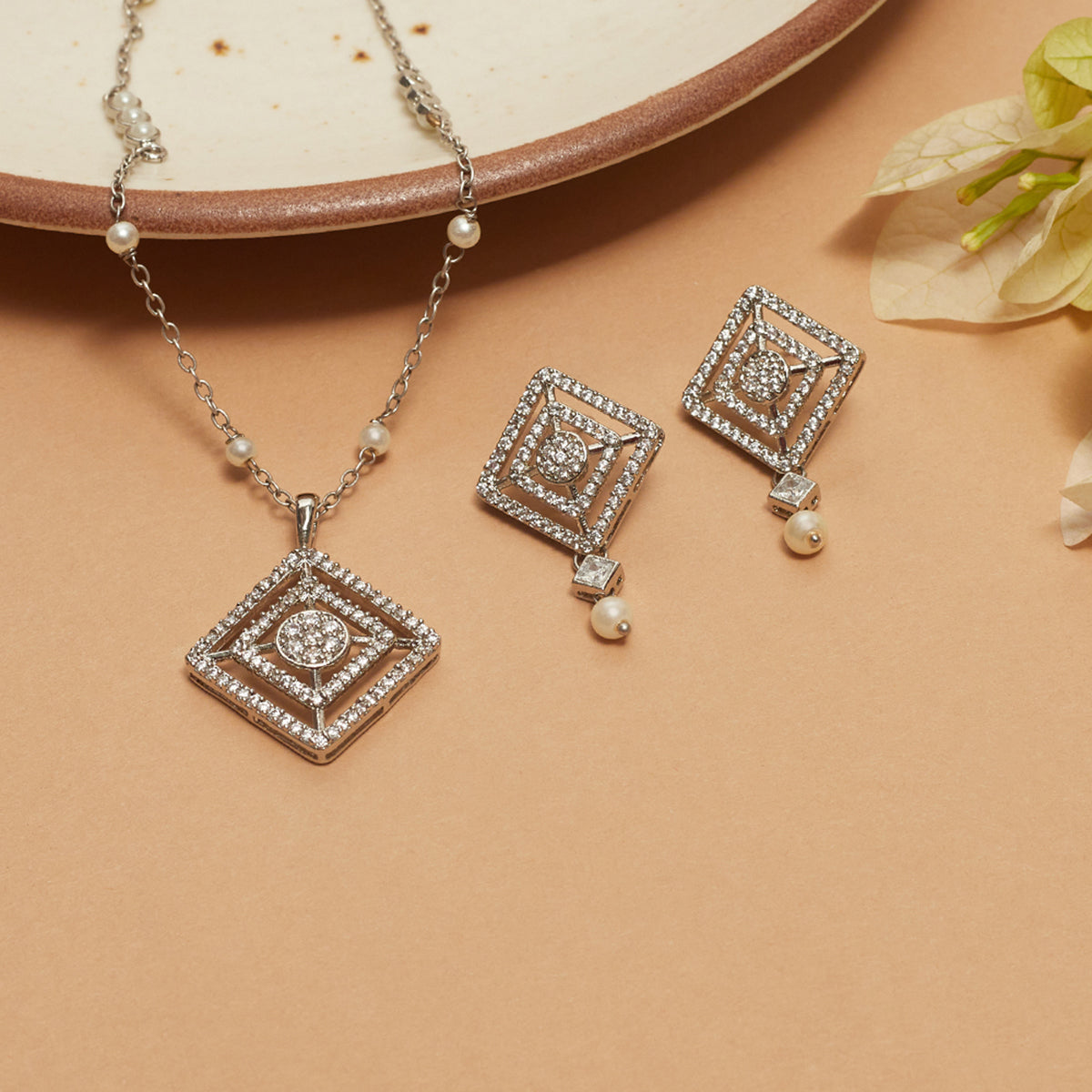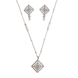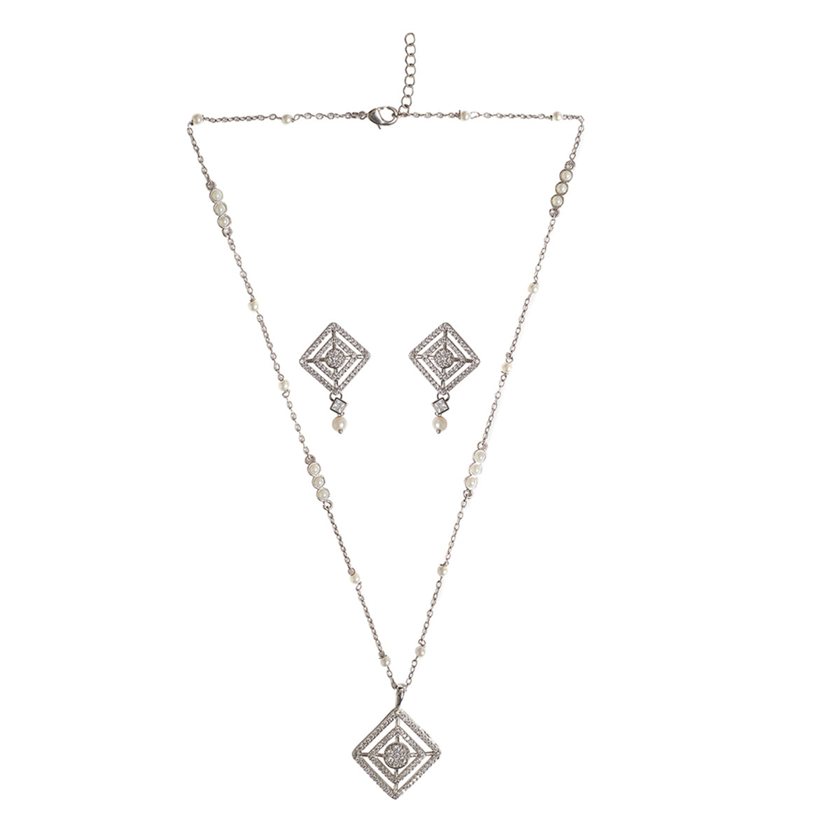 Charming and delicate, this sparkly pendant set has been fashioned out of brass and adorned with round cut zircon gemstones and lovely white faux pearls. Each piece has been given a white rhodium plating that adds to the classic allure of this set. Pair with formal outfits or even work wear.