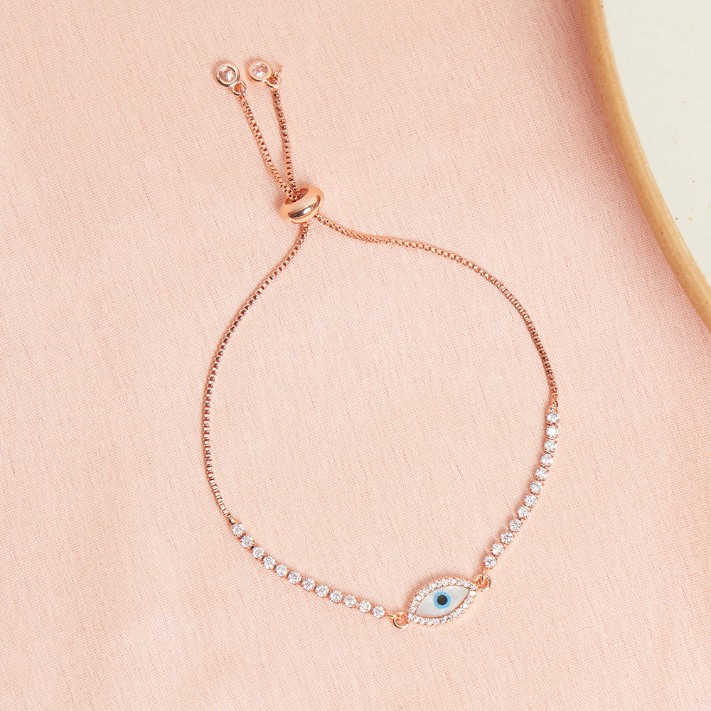 Featuring an evil eye charm, this chain bracelet has been fashioned out of quality brass. CZ gemstones embellished and rose gold plated, the bracelet is lightweight, comfortable and versatile enough to be paired with just about everything.