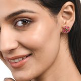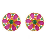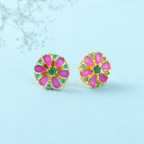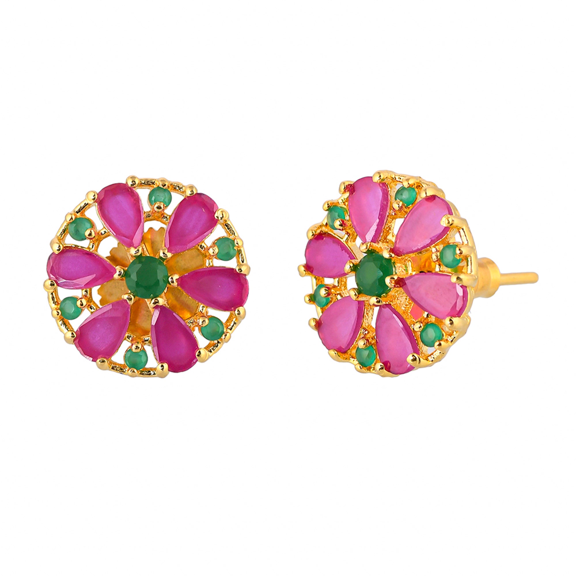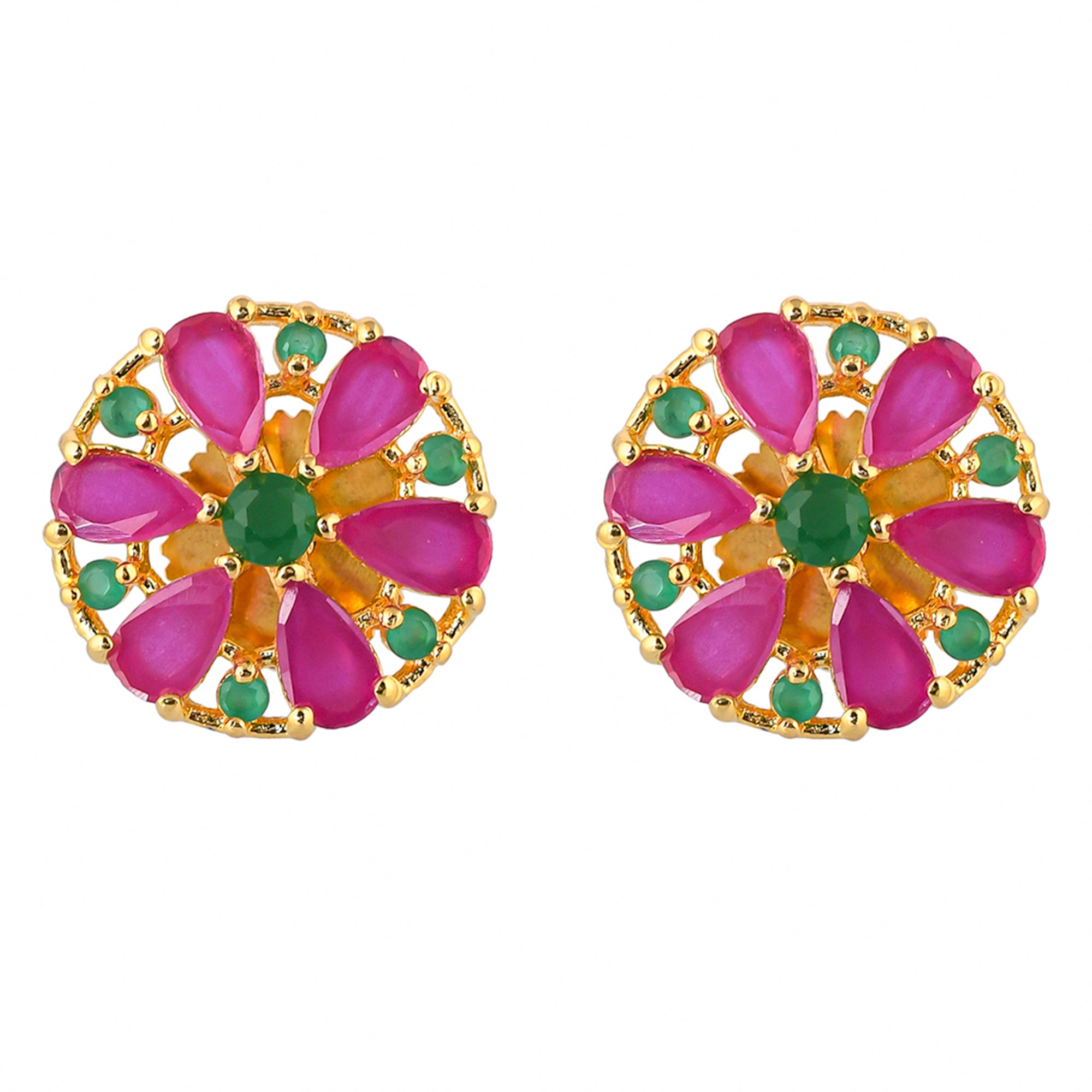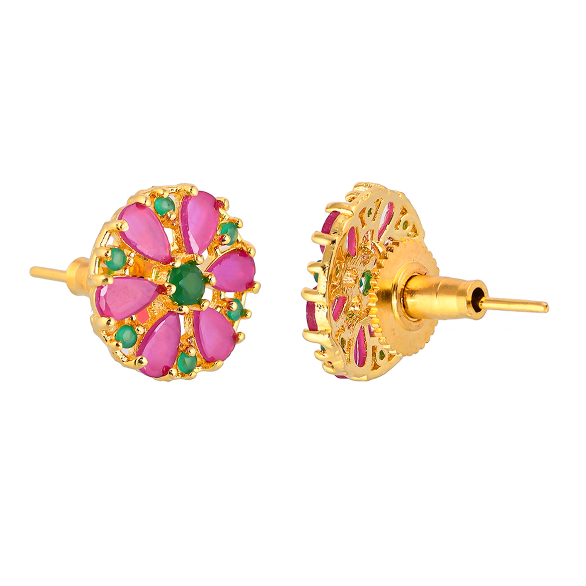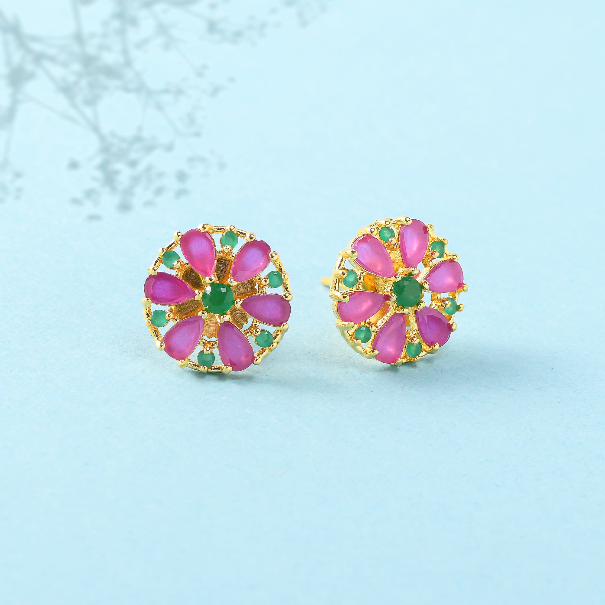 Round stud earrings with cluster setting pink and green zircon gems. Made from brass and gold plated. Good for casual looks.