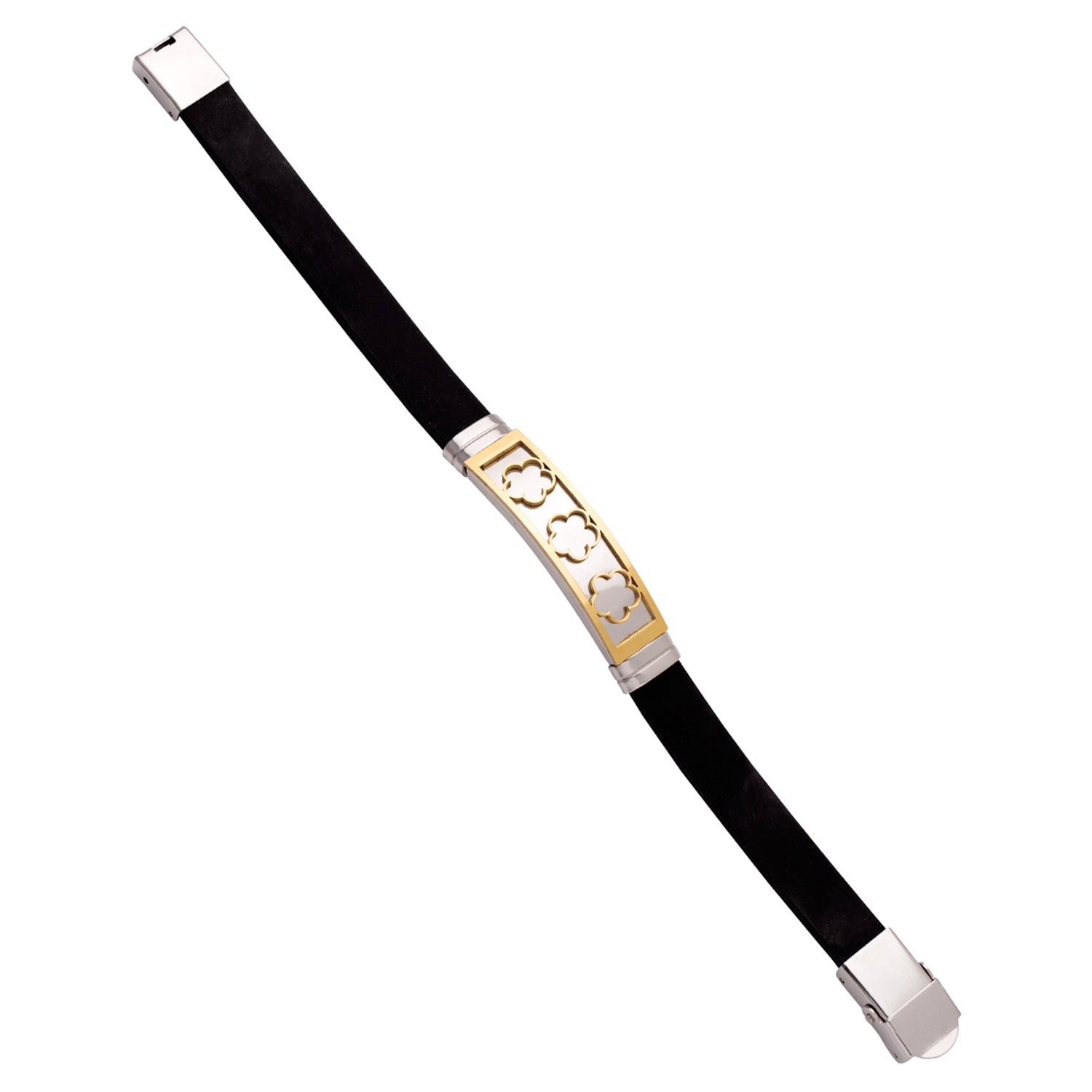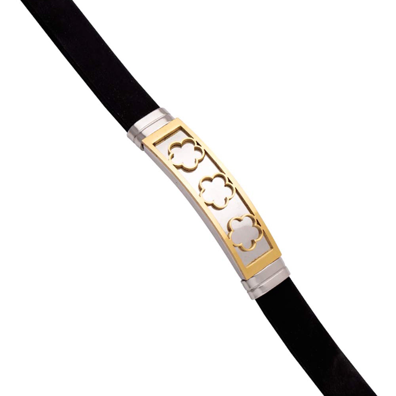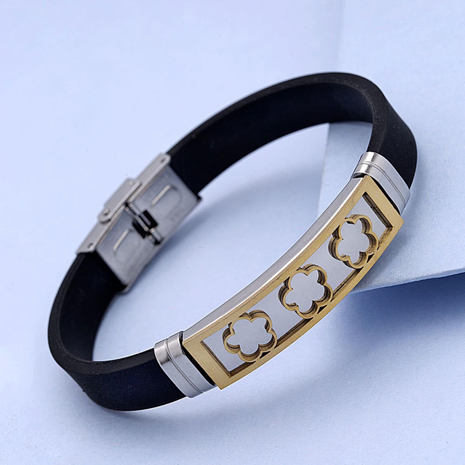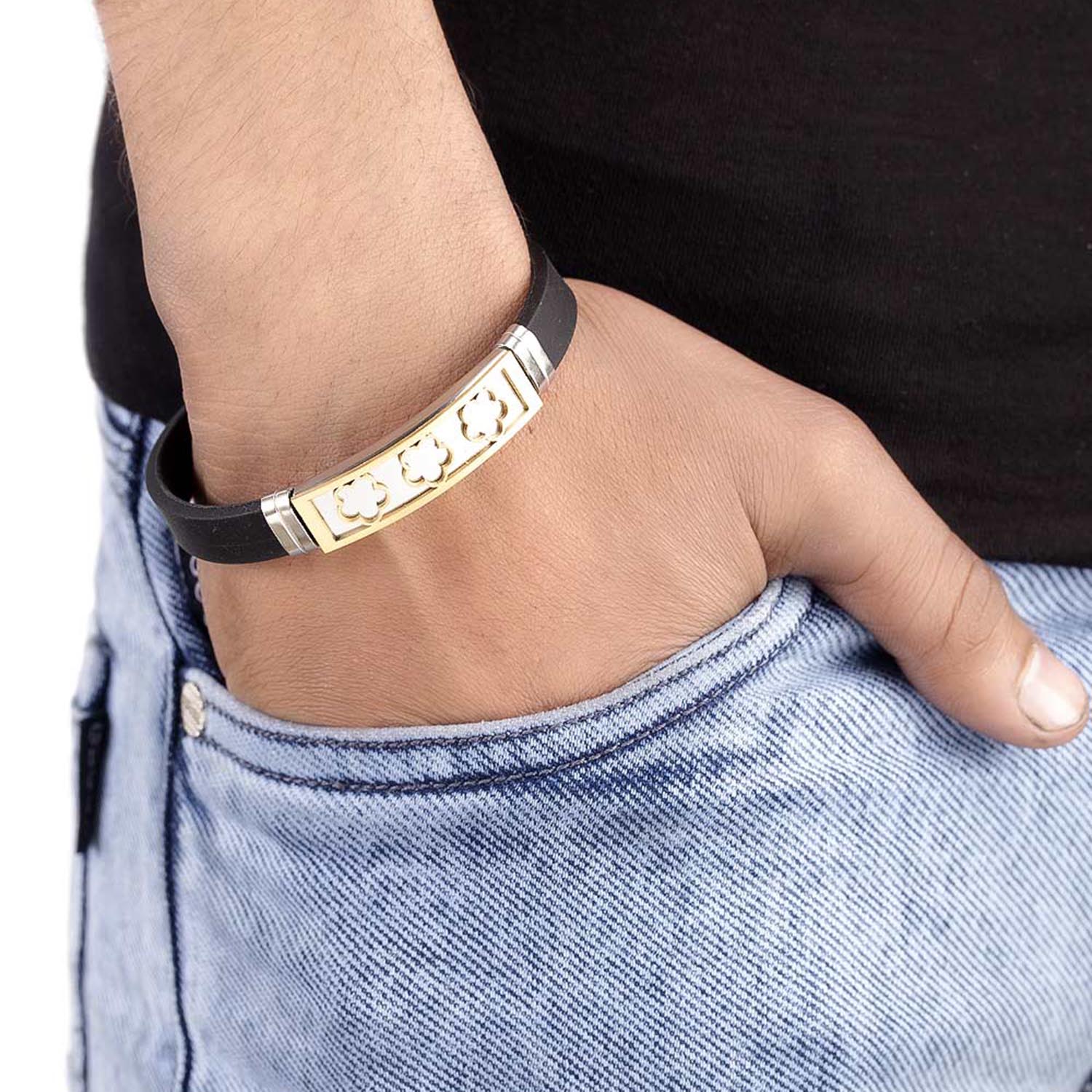 Clover leaves motifs bracelet made from stainless steel. Pair the two tone plated bracelet with a party outfit. To make your accessories last longer avoid harsh chemicals and moisture. Keep dry, clean with dry cloth and wear with panache. "India’s largest fashion jewelry brand DARE, comes from the House of Voylla as a limited edition of handcrafted accessories for the modern Indian men. "