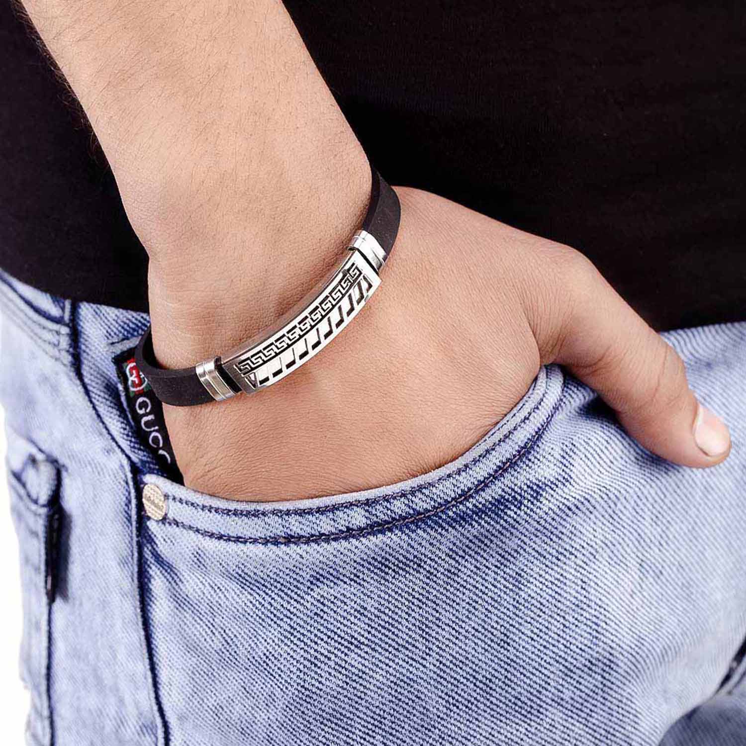 Cutwork pattern bracelet made from stainless steel and silver plated. Wear with a casual t-shirt. To make your accessories last longer avoid harsh chemicals and moisture. Keep dry, clean with dry cloth and wear with panache. "India’s largest fashion jewelry brand DARE, comes from the House of Voylla as a limited edition of handcrafted accessories for the modern Indian men. "