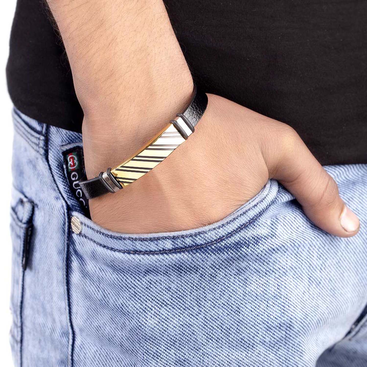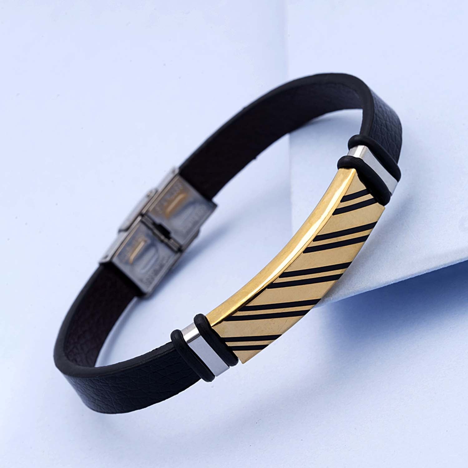 Cutwork pattern men's stainless steel bracelet. Two tone plated, lightweight and comfortable. To make your accessories last longer avoid harsh chemicals and moisture. Keep dry, clean with dry cloth and wear with panache. "India’s largest fashion jewelry brand DARE, comes from the House of Voylla as a limited edition of handcrafted accessories for the modern Indian men. "