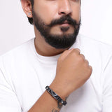 Men's leather bracelet with black rhodium plating. Wear with casual attire. To make your accessories last longer avoid harsh chemicals and moisture. Keep dry, clean with dry cloth and wear with panache. "India?s largest fashion jewelry brand DARE, comes from the House of Voylla as a limited edition of handcrafted accessories for the modern Indian men. "