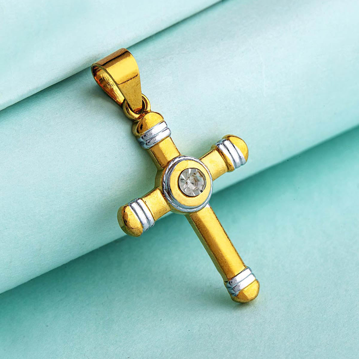 Cross motif pendant fashioned out of brass and two tone plated. Wear with casual attire. To make your accessories last longer avoid harsh chemicals and moisture. Keep dry, clean with dry cloth and wear with panache. "India’s largest fashion jewelry brand DARE, comes from the House of Voylla as a limited edition of handcrafted accessories for the modern Indian men. "
