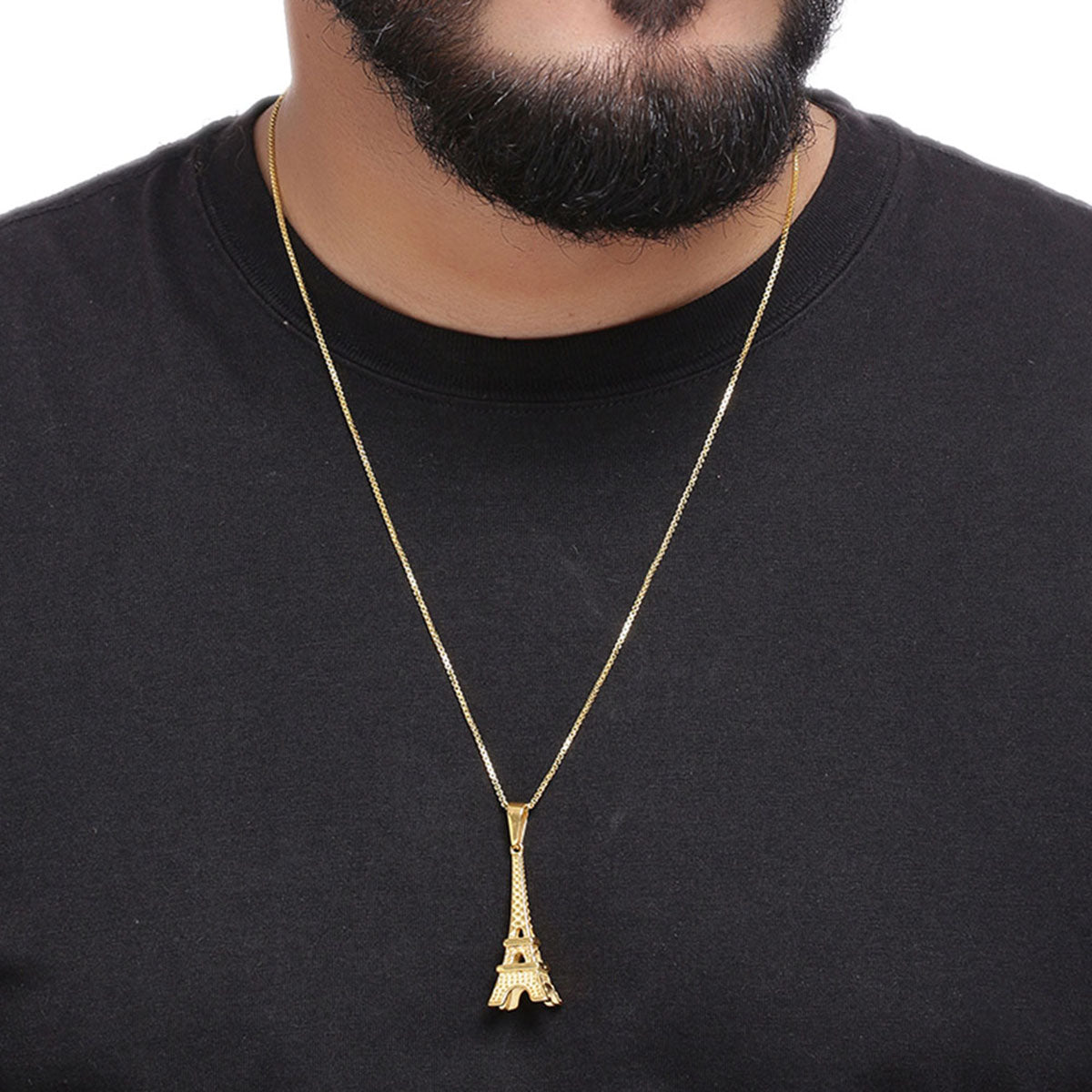 Eiffel Tower motif pendant crafted from stainless steel. Yellow gold plated. Wear with party attire. To make your accessories last longer avoid harsh chemicals and moisture. Keep dry, clean with dry cloth and wear with panache. "India’s largest fashion jewelry brand DARE, comes from the House of Voylla as a limited edition of handcrafted accessories for the modern Indian men. "