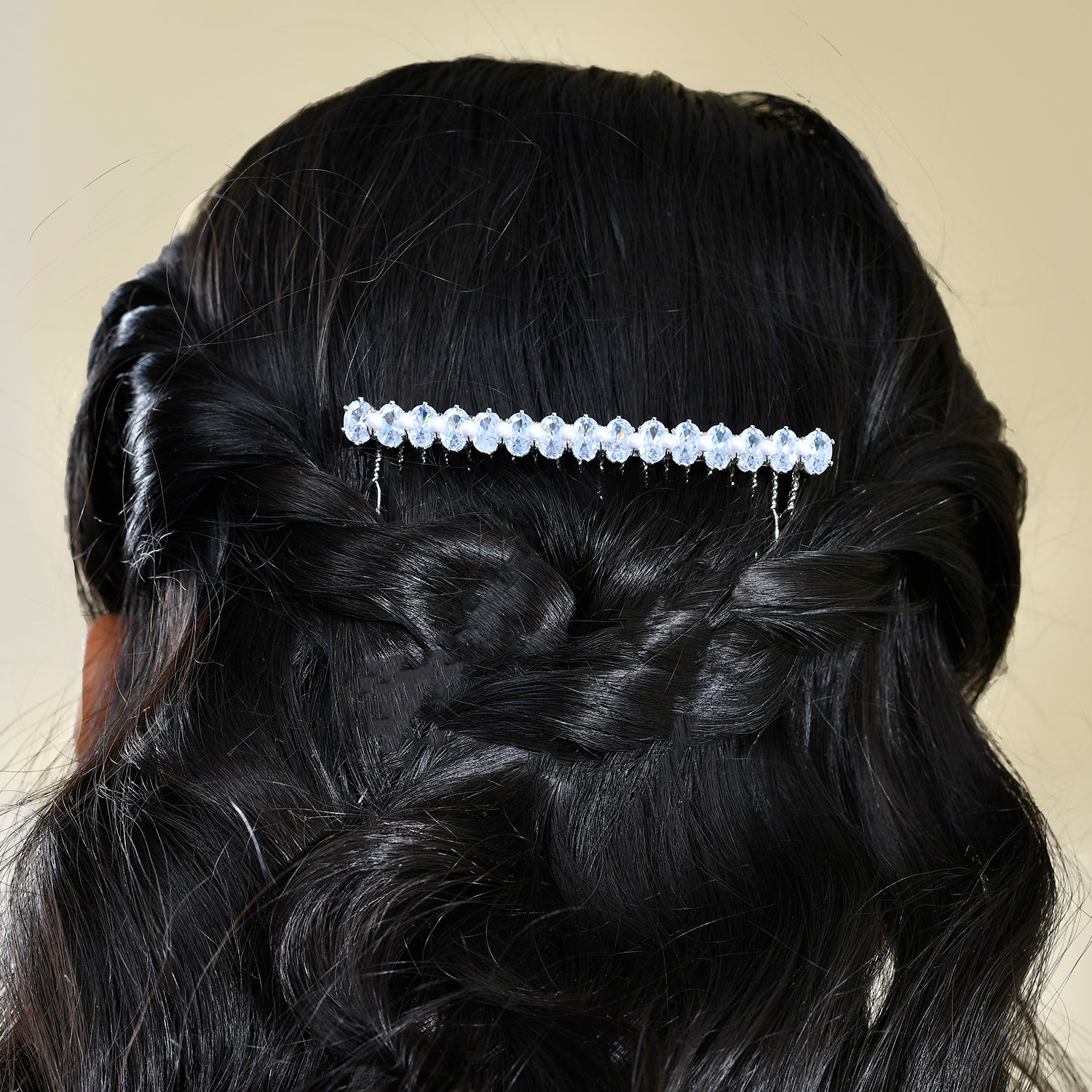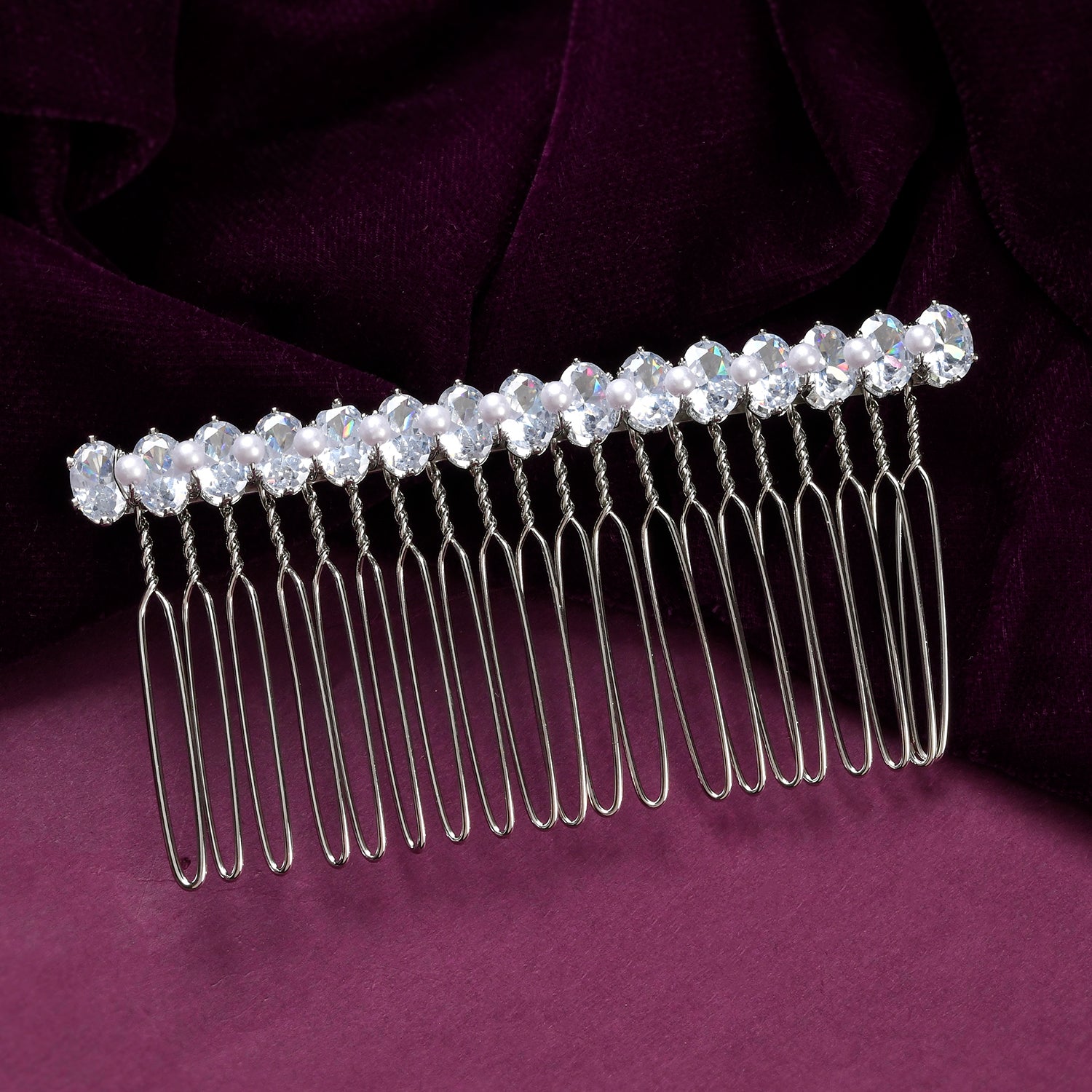 The Royal Romance Blossom Comb Pin Hair Accessory is a stunning piece crafted from high-quality Alloy and plated with white rhodium, ensuring durability and a luxurious finish. This exquisite comb features a row of sparkling American diamonds, meticulously set to create a dazzling effect that catches the light beautifully. Part of the Royal Romance collection, this accessory embodies timeless elegance and opulent craftsmanship, making it perfect for special occasions such as weddings, festive celebrations, and cocktail parties. The versatile design allows it to complement various hairstyles, adding a touch of sophistication and glamour. Ideal as a gift for women, whether for Valentine's Day, Diwali, Raksha Bandhan, or Christmas, this comb pin is a thoughtful choice for a wife, girlfriend, mother, or sister. Its intricate design and premium quality make it a cherished addition to any jewelry collection.