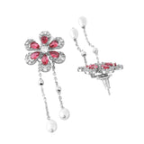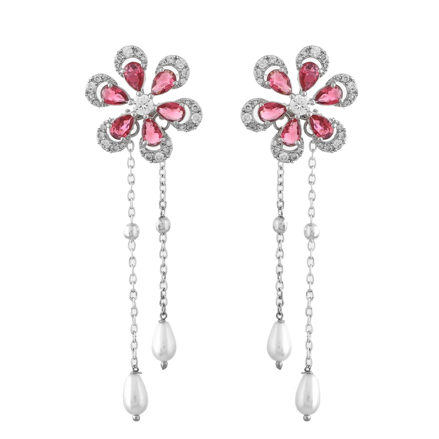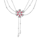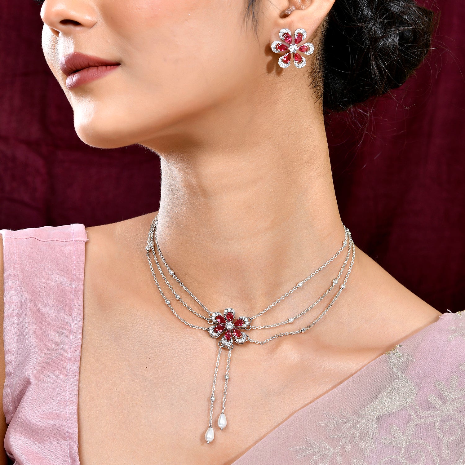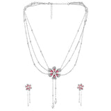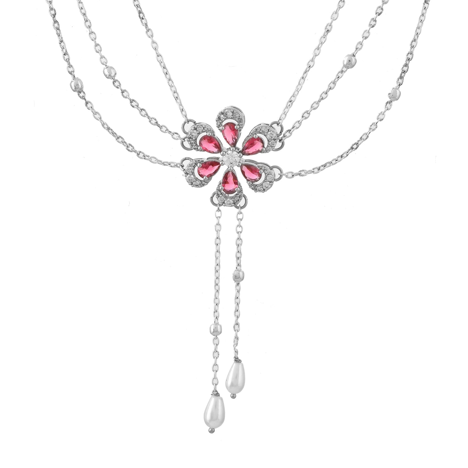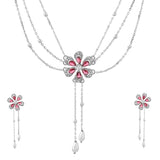 The Royal Romance Fleur Necklace Set is a stunning women's necklace set made from high-quality brass and plated with white rhodium for a luxurious finish. This American diamond necklace set features a multi-layered necklace with a central floral motif adorned with vibrant pink stones and sparkling American diamonds, exuding elegance and sophistication. The intricate design and delicate chains make it perfect for festive occasions, weddings, parties, and even cocktail events. Part of Voylla’s Royal Romance Collection, which celebrates timeless elegance and opulent craftsmanship, this set is an ideal gift for women on special occasions like Valentine's Day, Diwali, Raksha Bandhan, Christmas, and New Year. Whether for a girlfriend, wife, mother, or sister, this stone necklace set adds a regal touch to any outfit, making every occasion unforgettable.