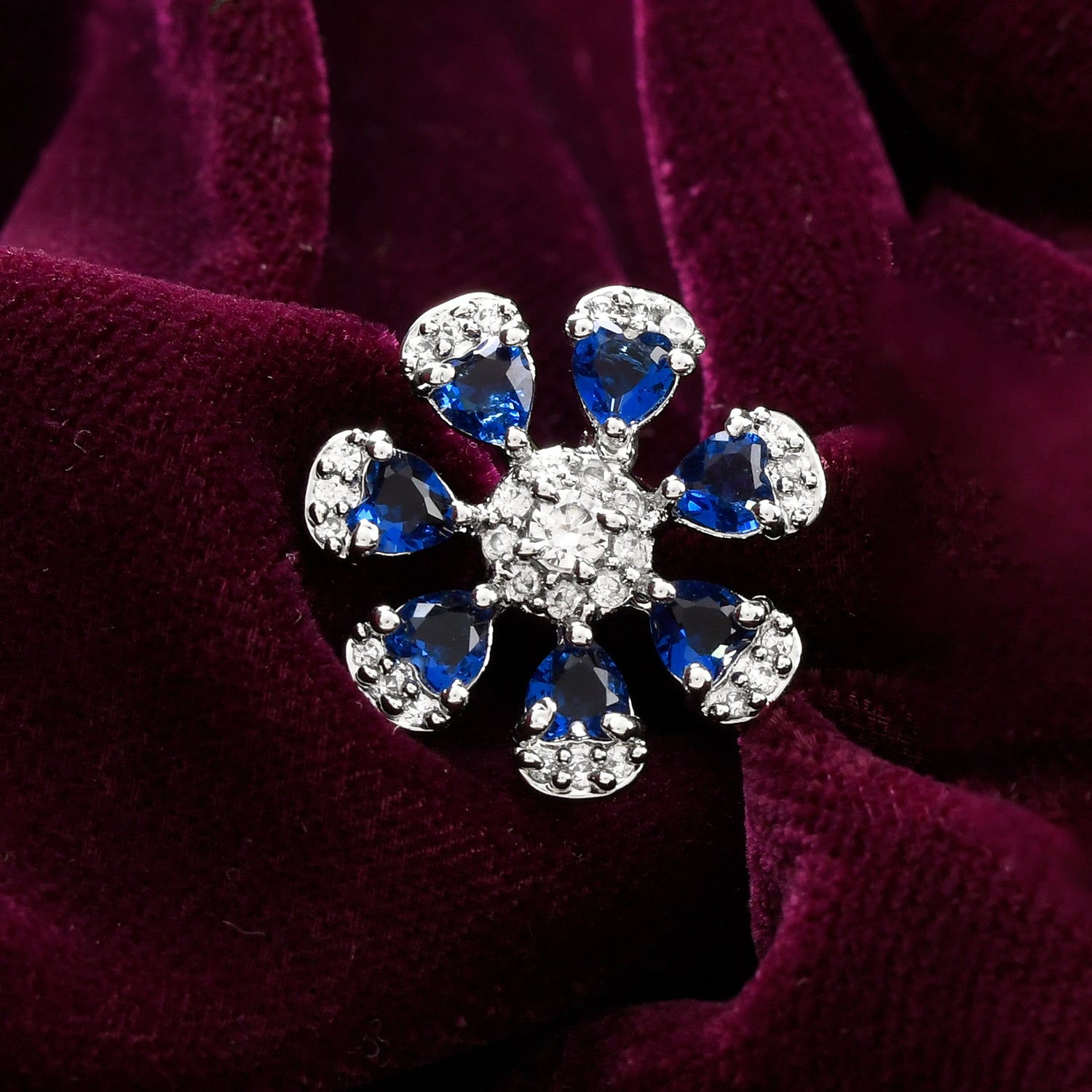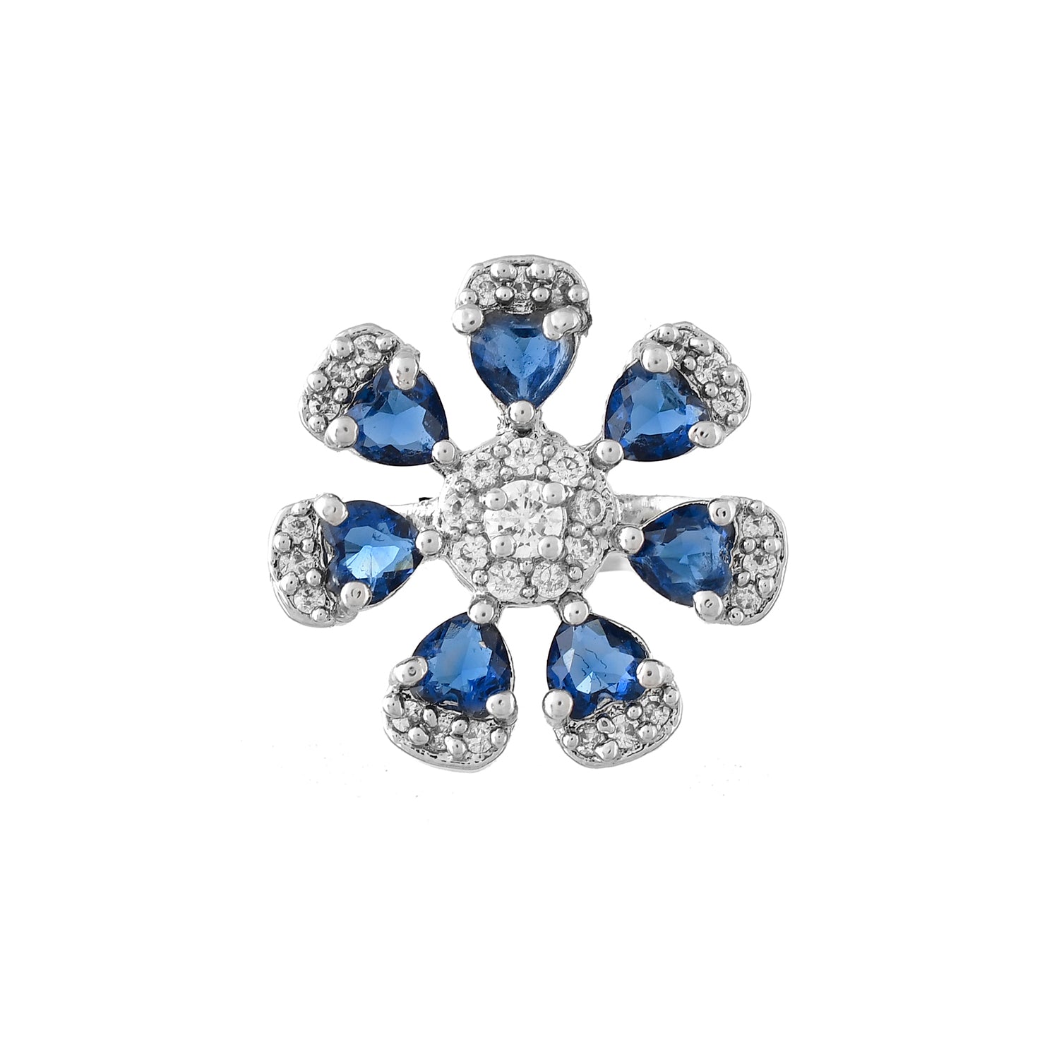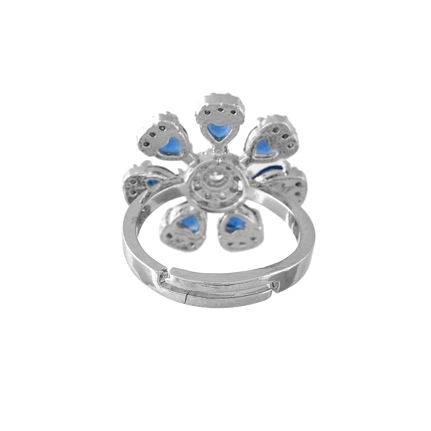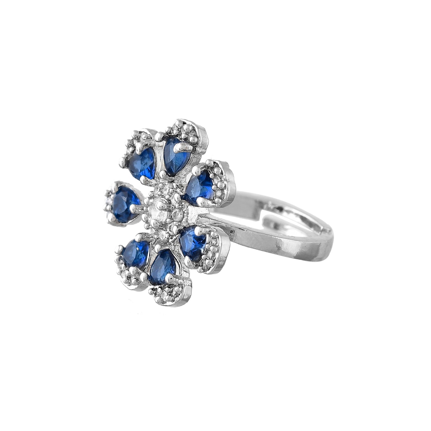 The Royal Romance Hazel Statement Ring is an exquisite piece of jewelry crafted from high-quality brass and plated with white rhodium for a luxurious finish. This elegant ring showcases a floral design, adorned with vibrant blue stones and sparkling American diamonds, exuding a captivating charm. Part of the Royal Romance collection, this ring embodies timeless elegance and opulent craftsmanship. Perfect for special occasions like weddings, parties, and festive celebrations, it adds a regal touch to any outfit. This versatile ring is a thoughtful gift for women, whether for Valentine's Day, Diwali, Raksha Bandhan, Christmas, or New Year, making it an ideal choice for gifting to sisters, girlfriends, wives, mothers, and lovers. The intricate detailing and premium materials ensure lasting quality and brilliance, making this ring a standout accessory in any jewelry collection.