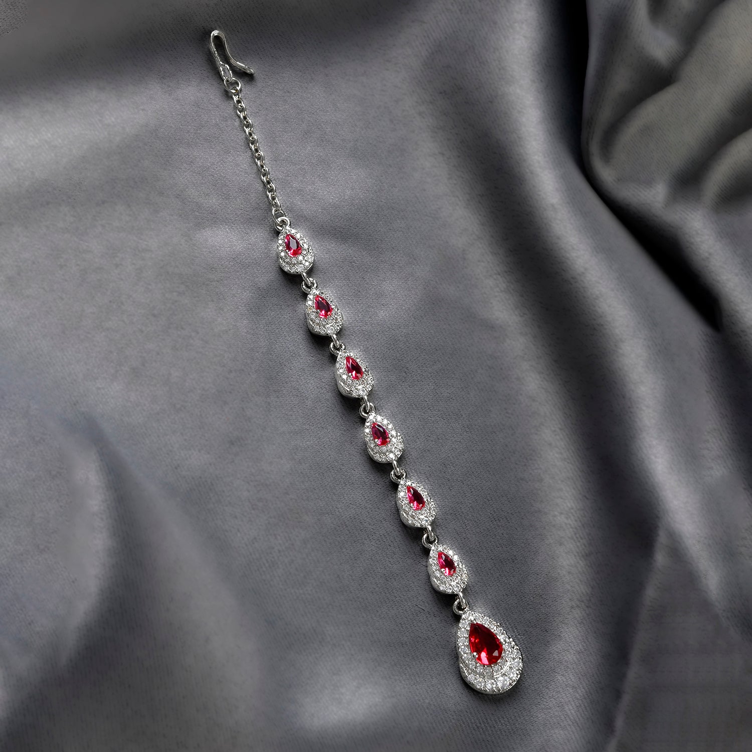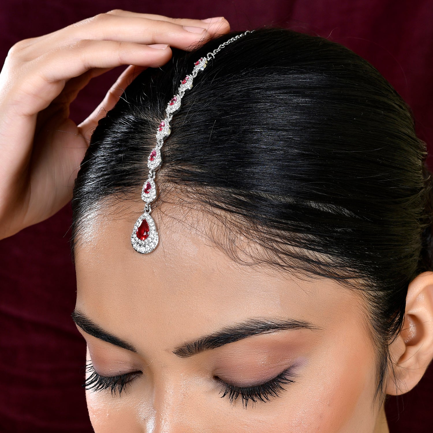The Royal Romance Inanna Maangtika is a luxurious piece of jewelry crafted from high-quality brass and plated with white rhodium, ensuring a long-lasting, lustrous finish. This exquisite maangtika is adorned with sparkling American diamonds set in intricate teardrop designs, accented by vibrant red stones that add a regal touch. Part of the Royal Romance collection, inspired by timeless elegance and opulent craftsmanship, this piece perfectly blends heritage charm with contemporary style. Ideal for festive occasions, weddings, and parties, it can be styled with traditional attire or a cocktail dress for a sophisticated look. This maangtika makes a perfect gift for women on special occasions such as Valentine’s Day, Diwali, Raksha Bandhan, Christmas, and more, and is sure to be cherished by mothers, sisters, girlfriends, wives, and lovers alike.