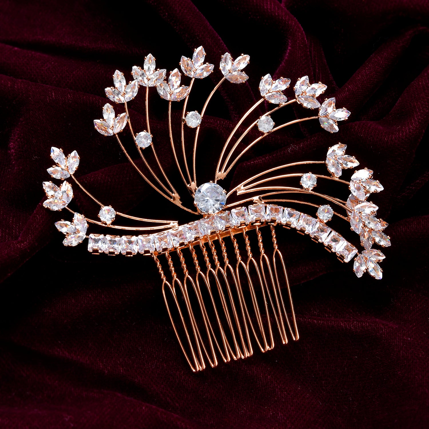 The Royal Romance Jasmine Comb Pin Hair Accessory is a breathtaking piece made from high-quality Alloy with an elegant rose gold plating. This exquisite accessory features an intricate floral design adorned with sparkling American diamonds, reflecting superior craftsmanship and timeless beauty. Part of Voylla's Royal Romance collection, this comb pin is perfect for adding a regal charm to festive outfits, wedding ensembles, or party attire. The luxurious rose gold and dazzling stones make it an exquisite gift for women on special occasions like Valentine's Day, Diwali, Raksha Bandhan, or Christmas. Embrace the sophistication and heritage charm of Regencycore and regal florals with this versatile piece, ideal for celebrating love, family, and tradition.
