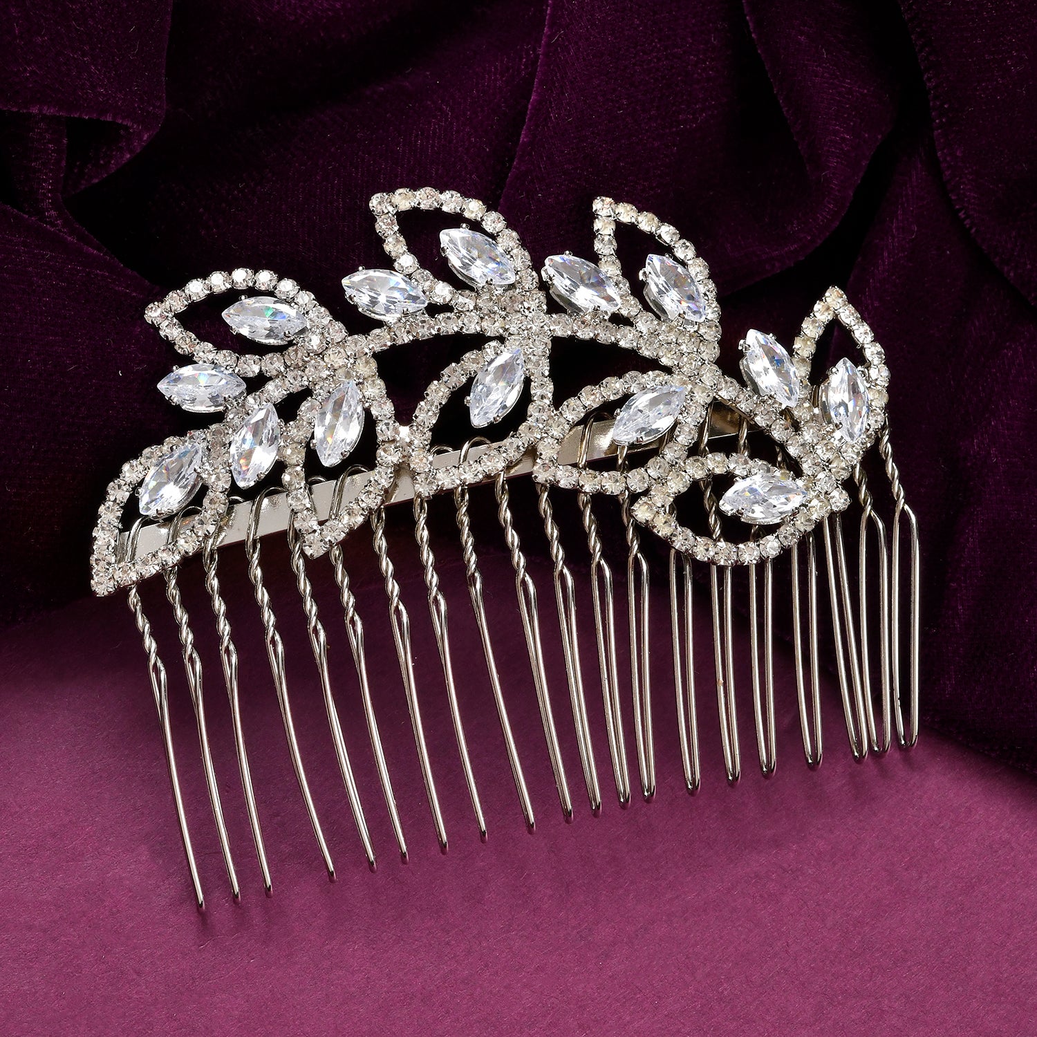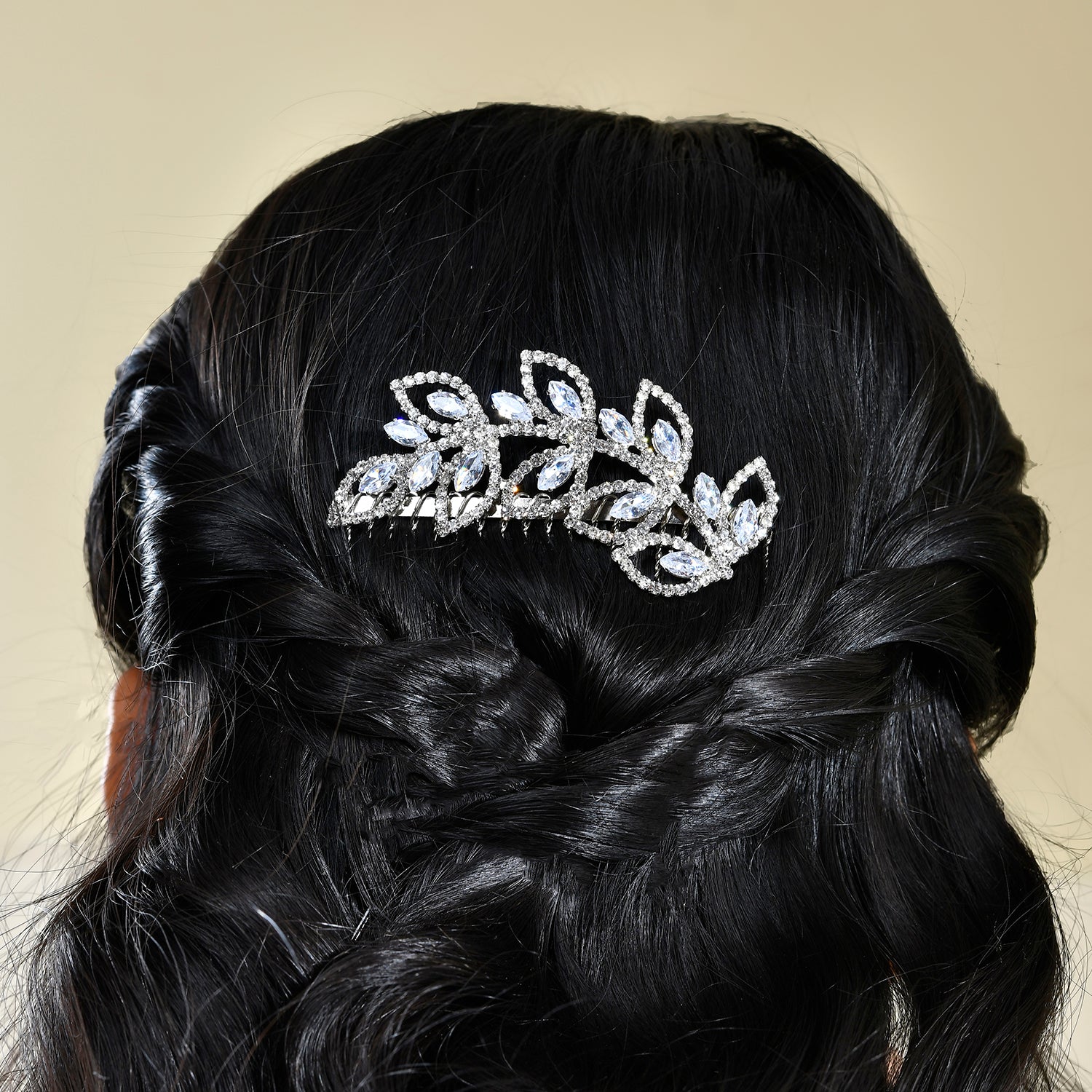 The Royal Romance Maitea Comb Pin Hair Accessory is a stunning piece crafted from high-quality Alloy and plated with white rhodium, ensuring both durability and a luxurious finish. This exquisite comb features an intricate design adorned with sparkling American diamonds, arranged in a delicate floral pattern that exudes elegance and sophistication. Perfect for special occasions such as weddings, festive celebrations, and cocktail parties, this accessory adds a touch of glamour to any hairstyle. The versatile design makes it an ideal gift for women, whether for Valentine's Day, Diwali, Raksha Bandhan, or Christmas. The Royal Romance collection, inspired by Regencycore and regal florals, celebrates timeless elegance and opulent craftsmanship, making this comb a must-have for those who appreciate fine jewelry.