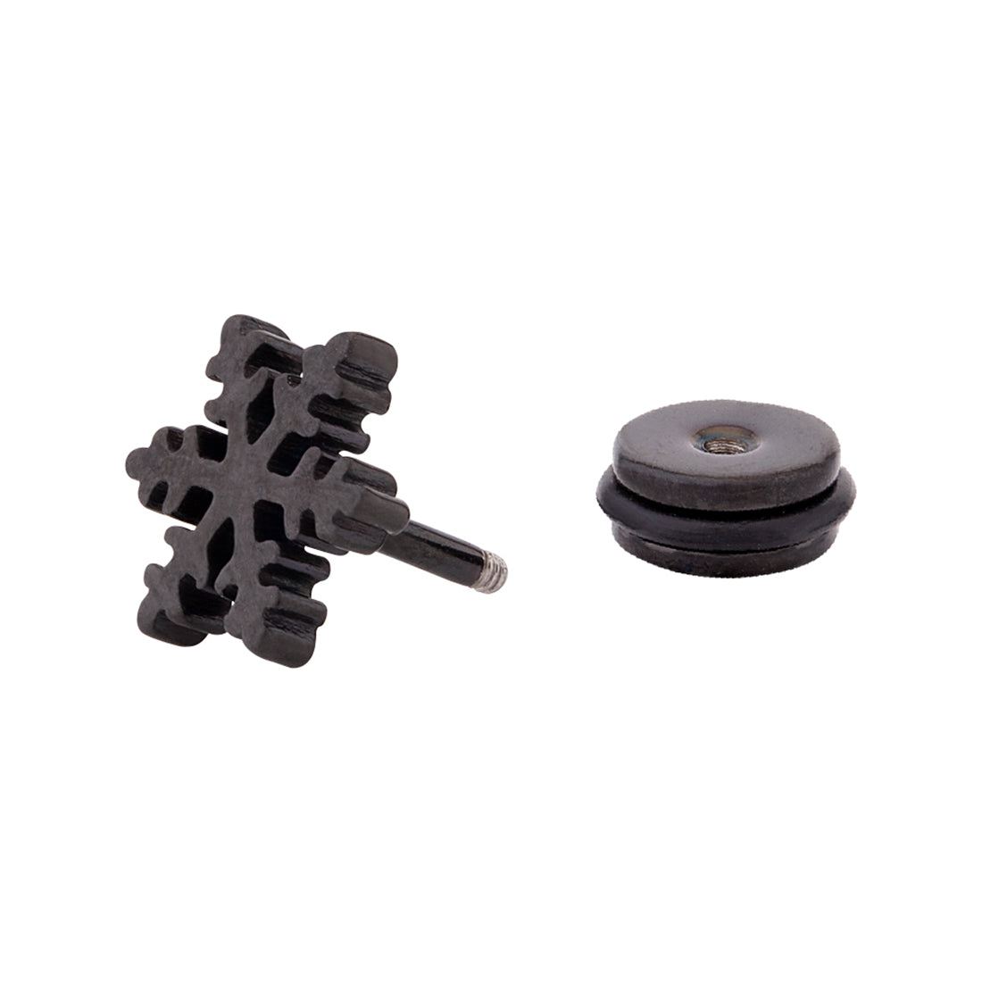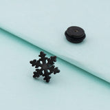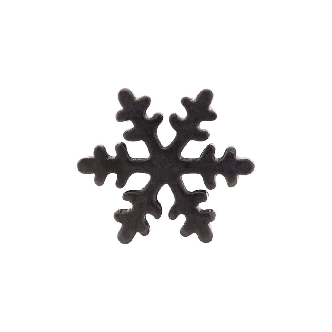 Snowflake earring with black rhodium plating. Made from stainless steel. Wear with a casual outfit.