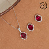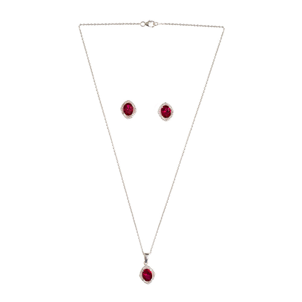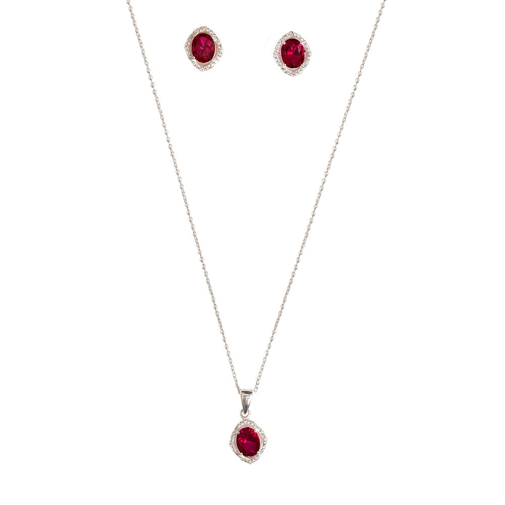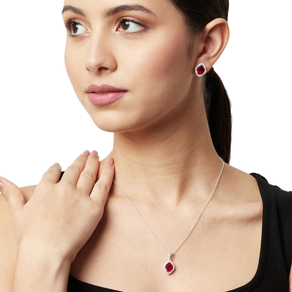 Crafted with the color of love this pretty necklace and earring pair is made in 925 Sterling Silver and Cubic Zirconia to enhance the beauty. . If you prefer timeless glamour, this cut is meant for you. Iconically fiery, red is one of the most eye-catching colors perfect for those who are looking to turn heads wherever they go.