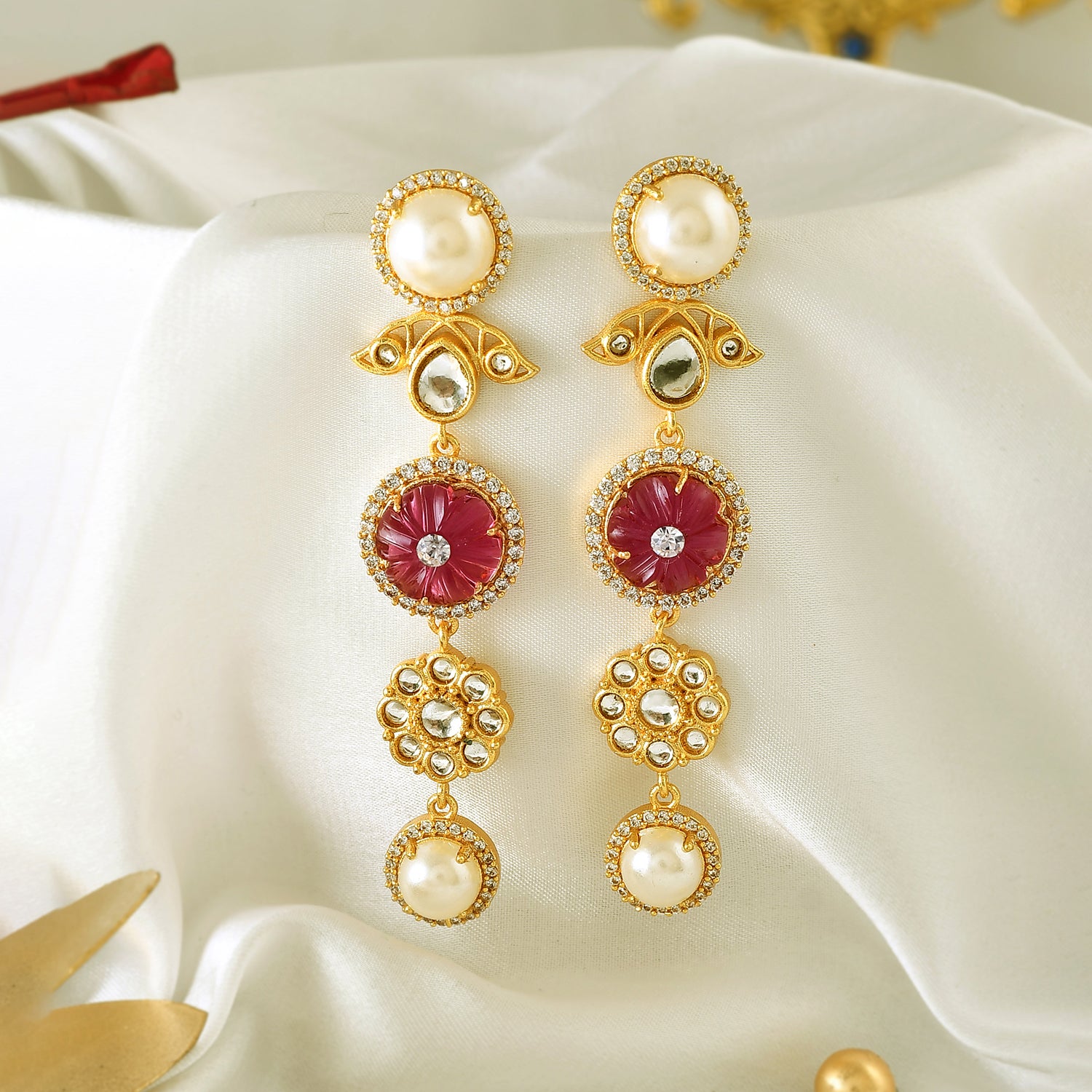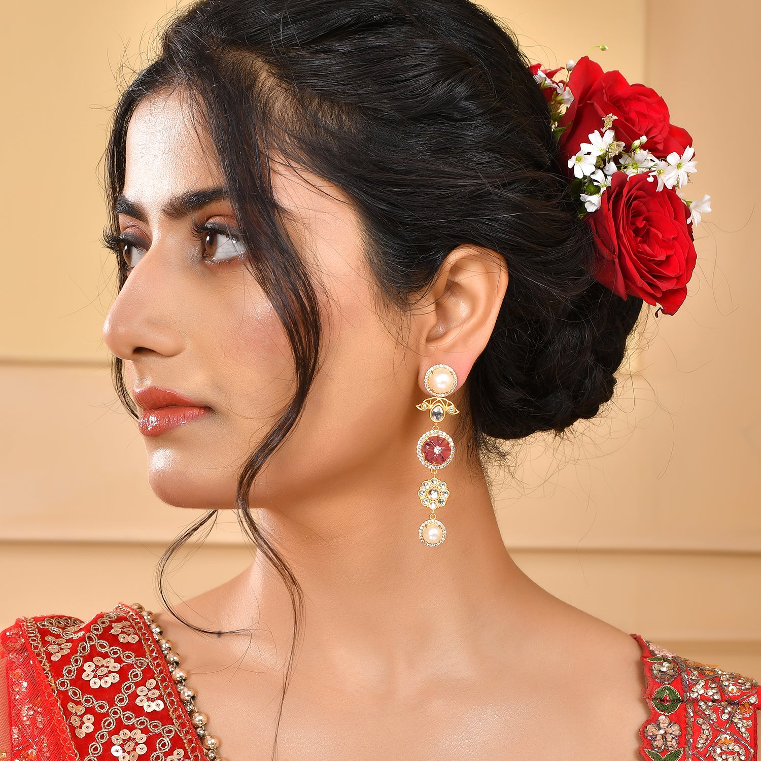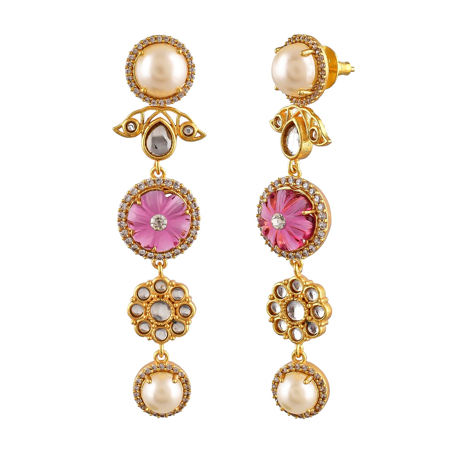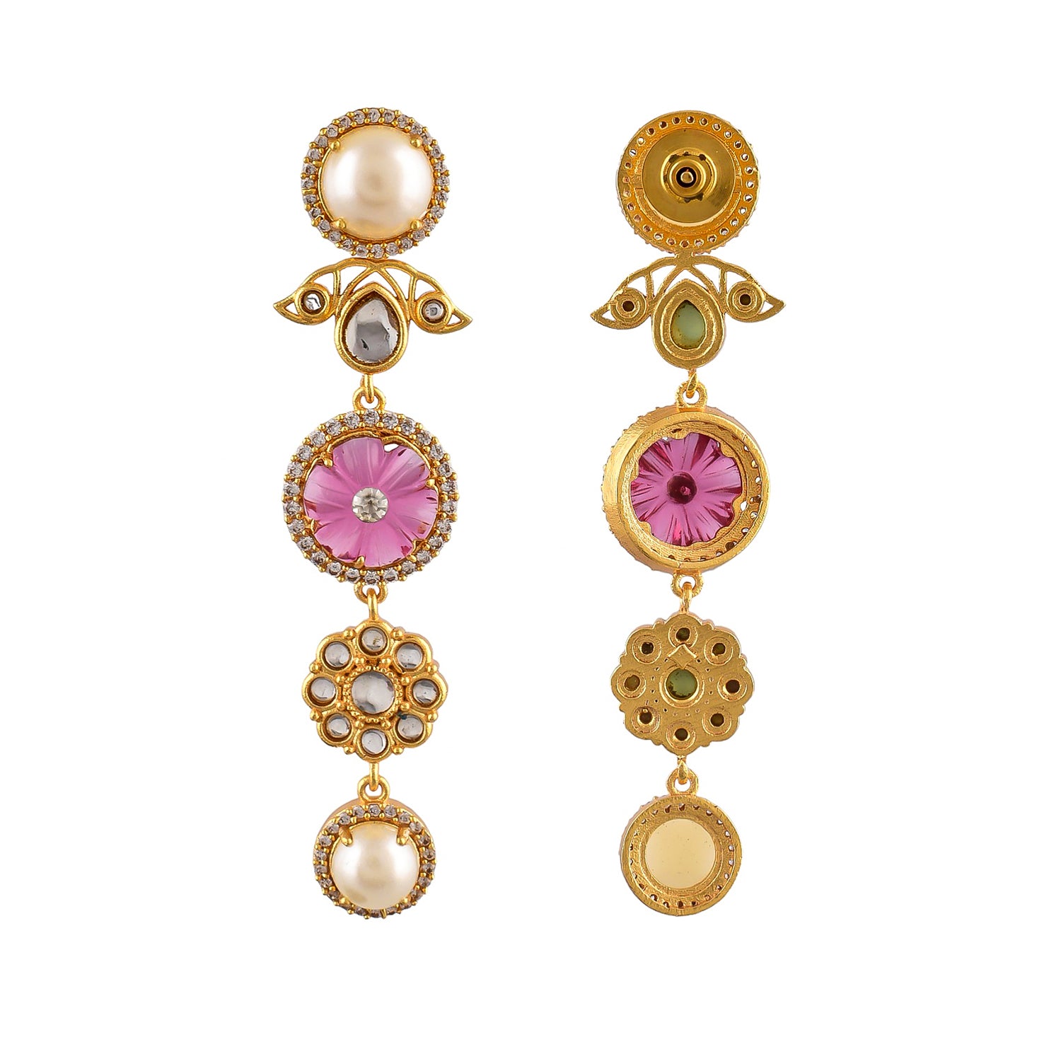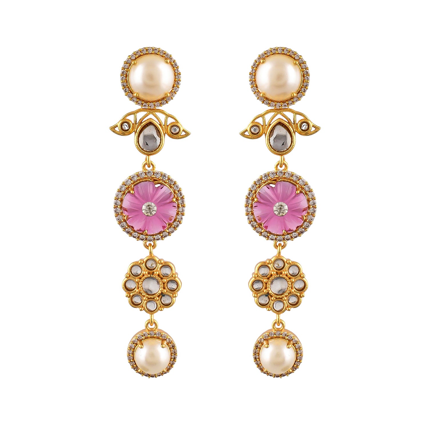 Inspired by the timeless beauty of a Rose Garden, this collection seamlessly blends the intricate patterns and classic silhouettes of Kundan Polki jewelry with a contemporary twist. Adorned with a mesmerizing combination of Polki, CZs, carved stones, and pearls, each piece tells a story of grace and sophistication.