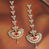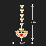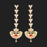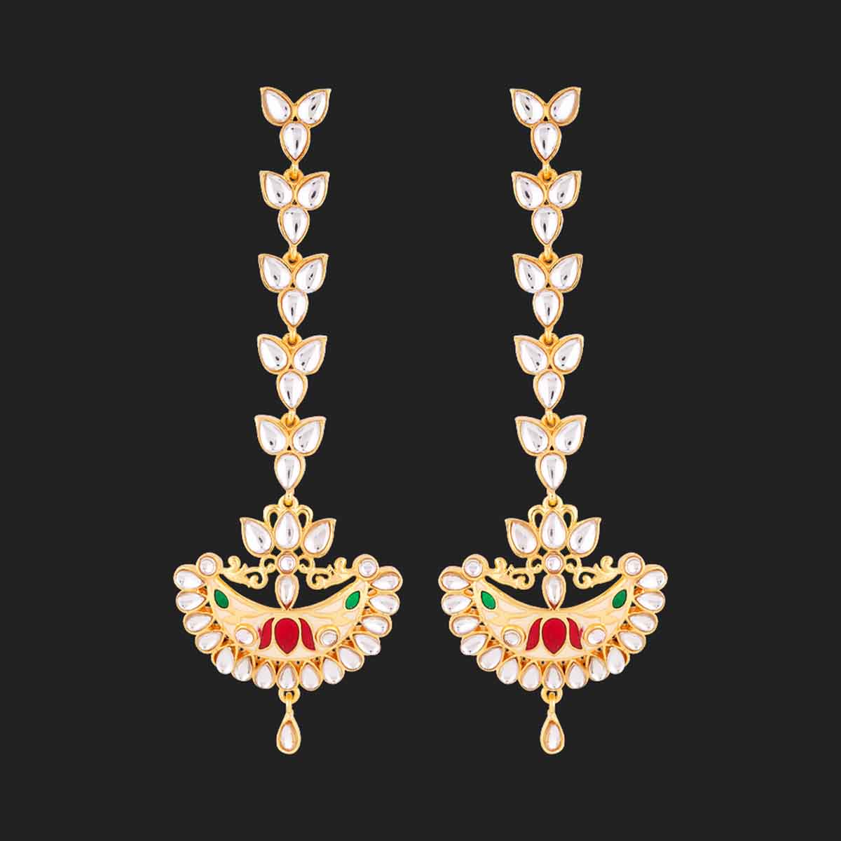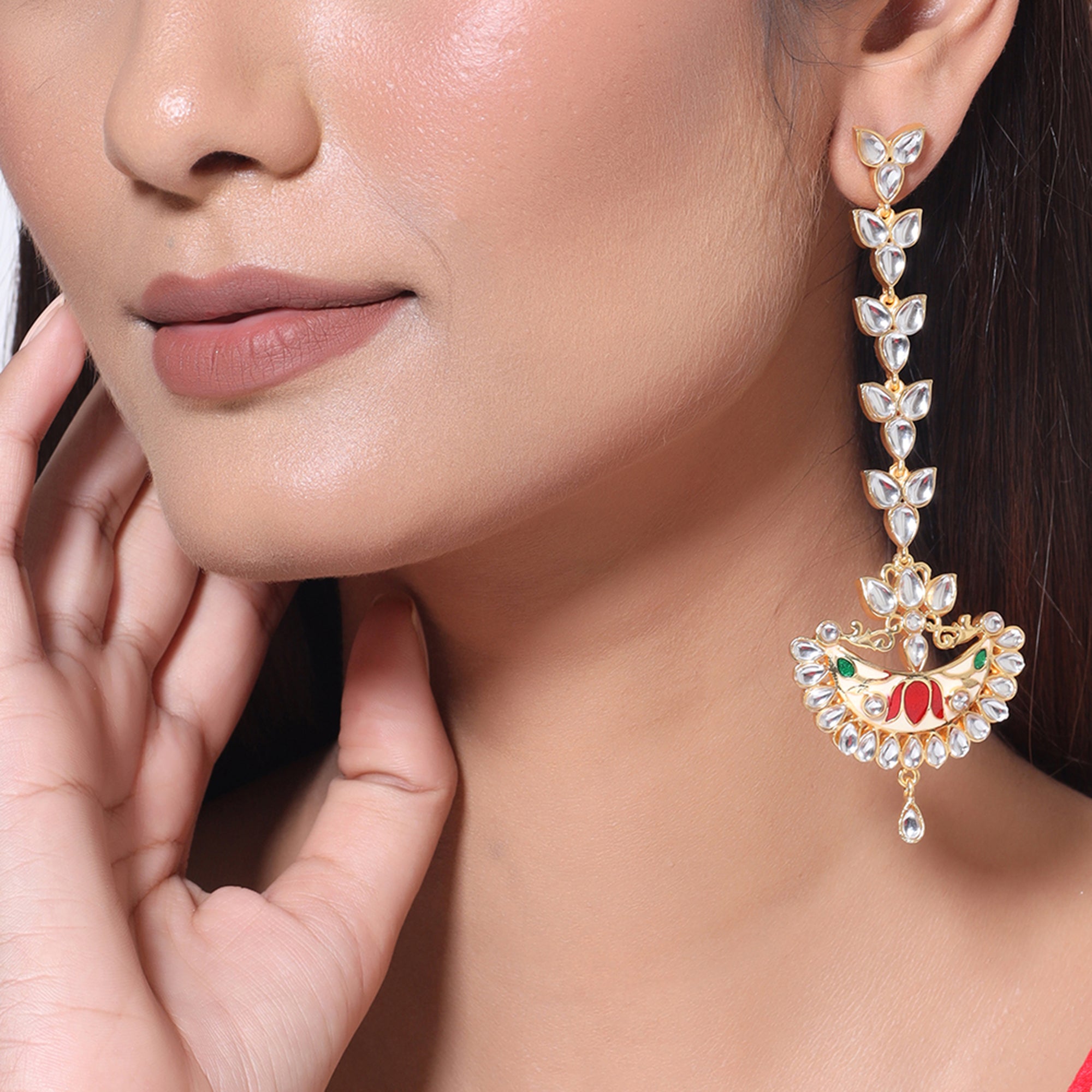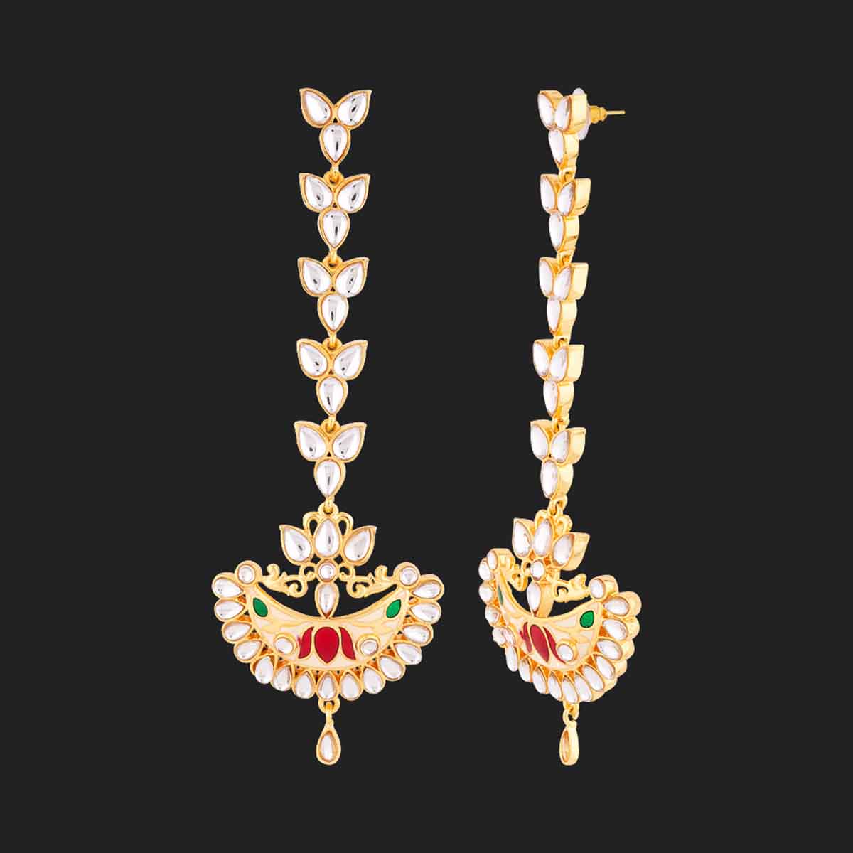 The inlay patterns and graceful designs found on the walls of the Taj Mahal have inspired these enameled drop earrings, featuring lotus motifs. Faux kundan gemstones adorned, the brass pair has been given a yellow gold plating. Wear with a traditional saree.
