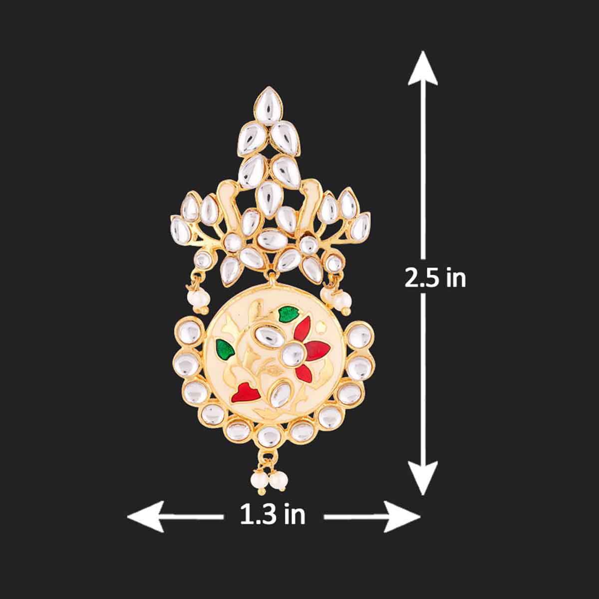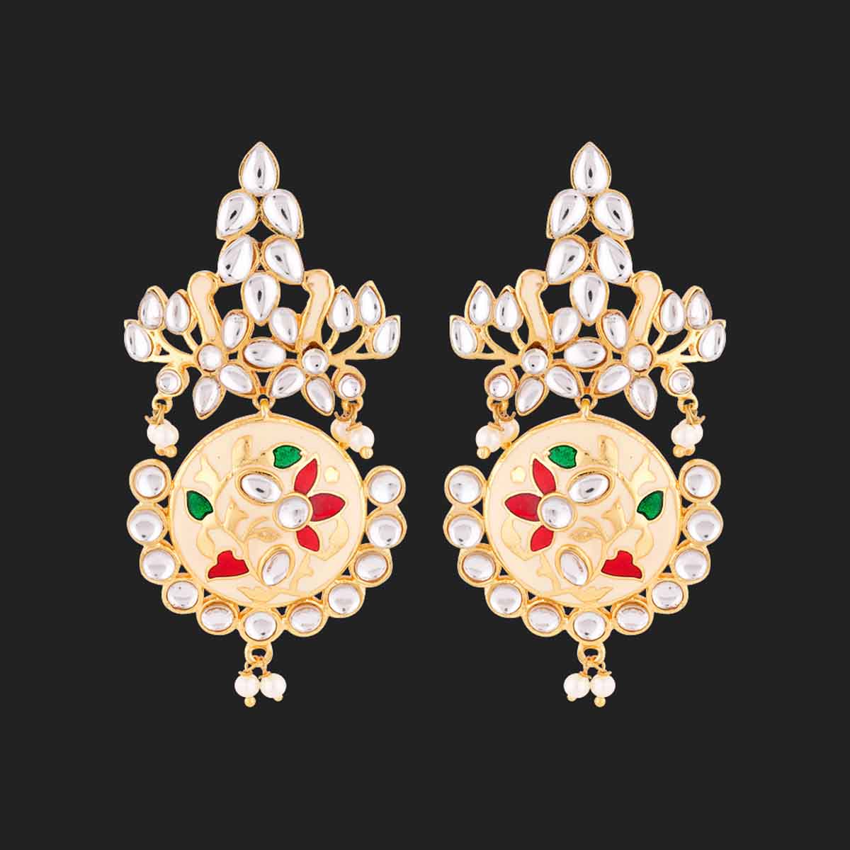 Heavily embellished with faux kundan gemstones, these drop earrings, featuring floral motifs, have been designed as an ode to the grace, architecture and inlay patterns of the Taj Mahal. Brass has been used in the making of this yellow gold plated pair. Enameled and good for formal ethnic looks. This piece of jewelry comes with the Voylla assurance of quality and durability.