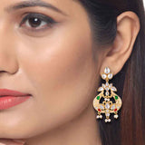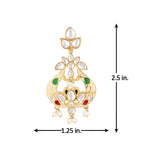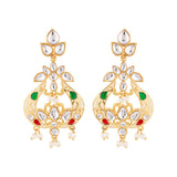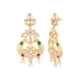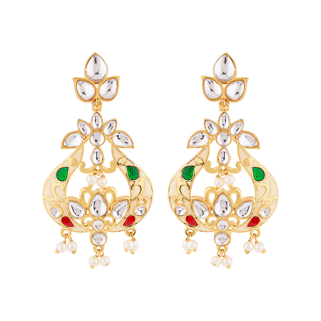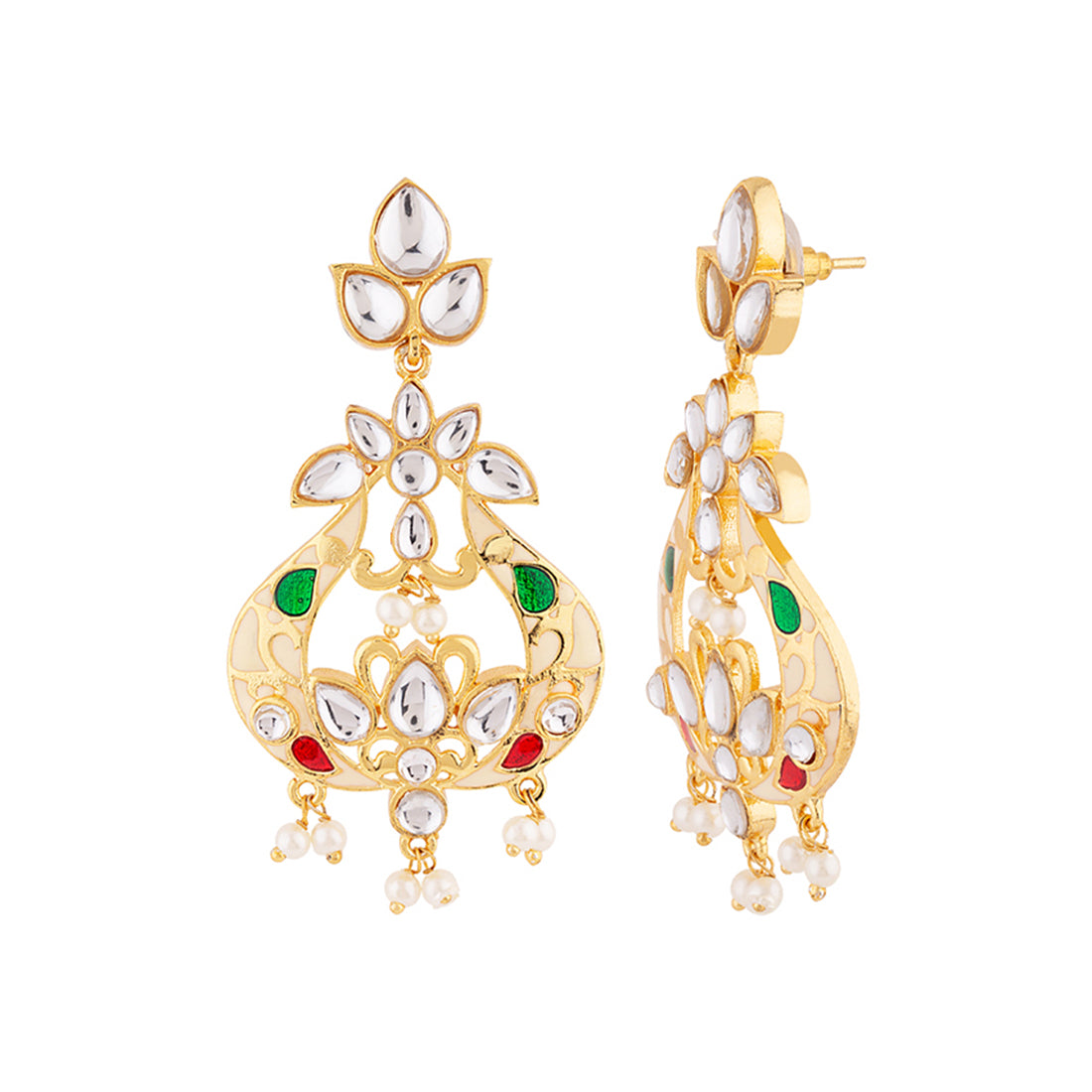 Inspired by the beautiful inlay work found on the Taj Mahal, these drop earrings have been fashioned out of brass. Featuring floral mosaic patterns, the yellow gold plated, enameled pair has been embellished with faux pearls and kundan gemstones. Pair with formal ethnic looks.