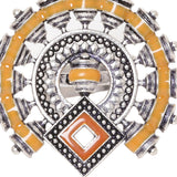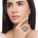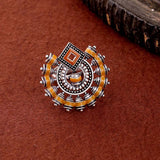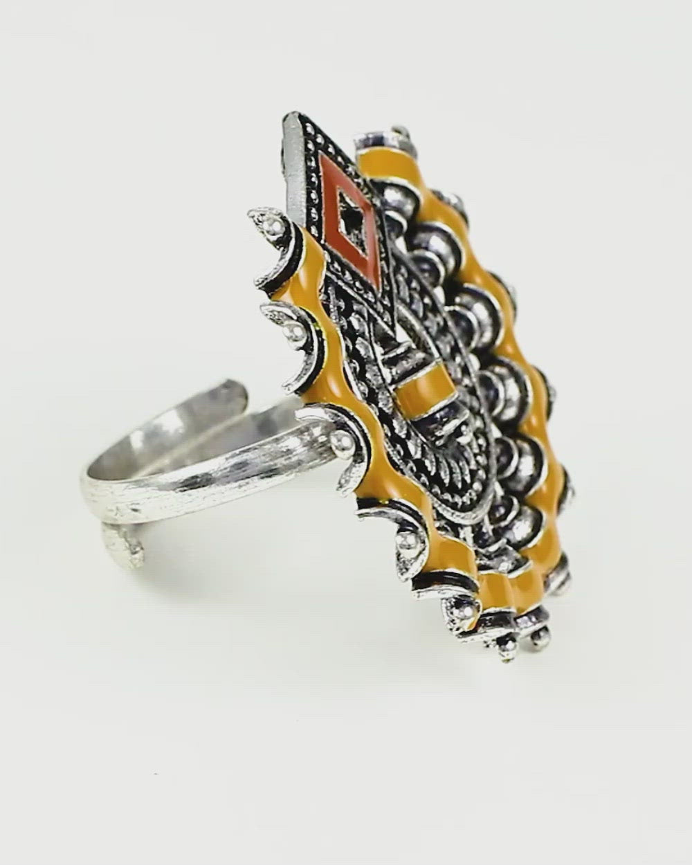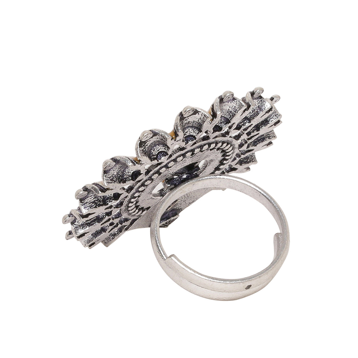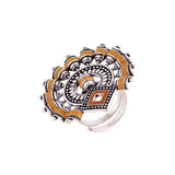 Half moon enameled ring inspired by classic bell design. Made from brass and oxidised silver plated. Good match for Indo-Western looks. This piece of jewelry comes with the Voylla assurance of quality and durability.