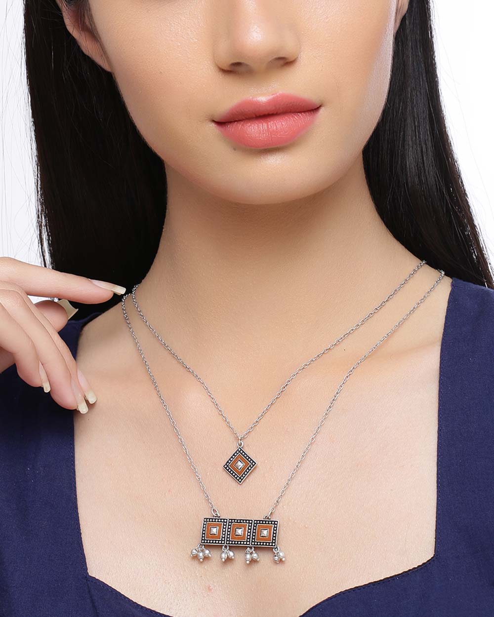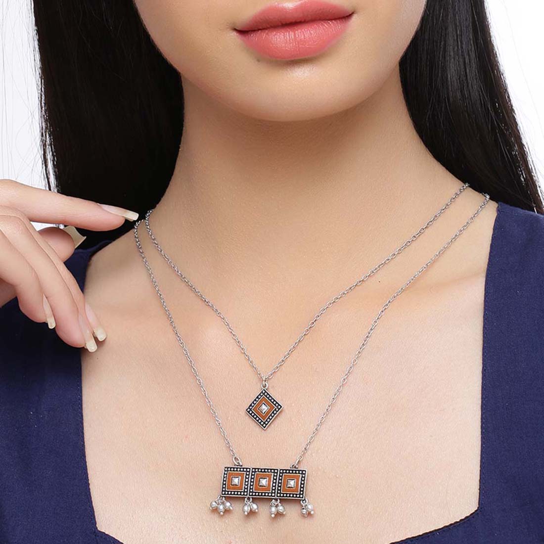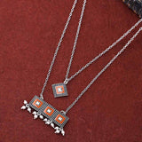 Layered necklace made from brass and inspired by dainty jewelry designs. Oxidised plated and enameled. Wear with an ethnic skirt or Indo-Western dress. This piece of jewelry comes with the Voylla assurance of quality and durability.
