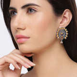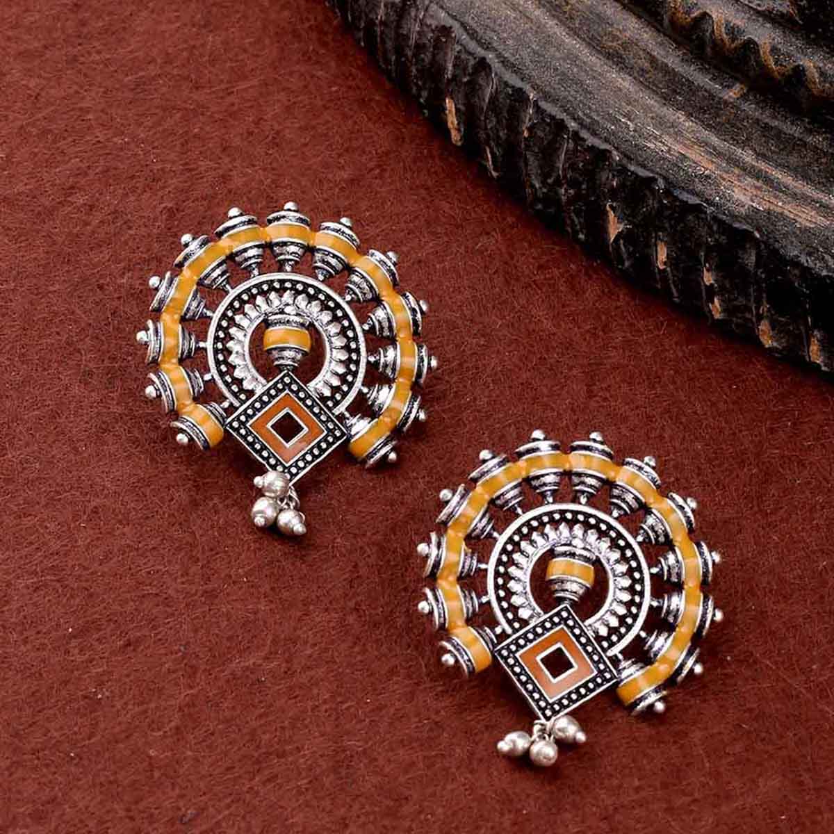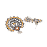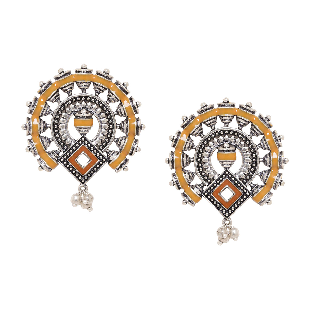 Rangoli design earrings made from brass and inspired by classic dainty jewelry. Enameled and mini ghungroos embellished. Oxidised silver plated. Wear with a trendy saree.