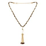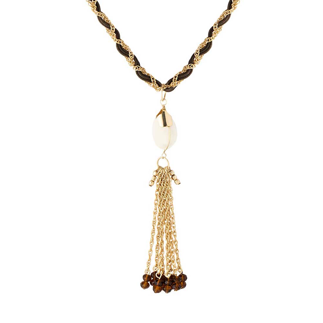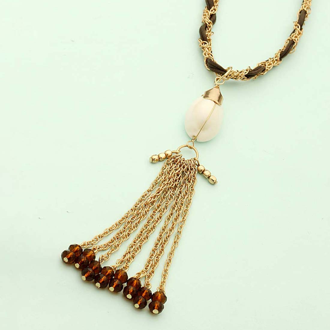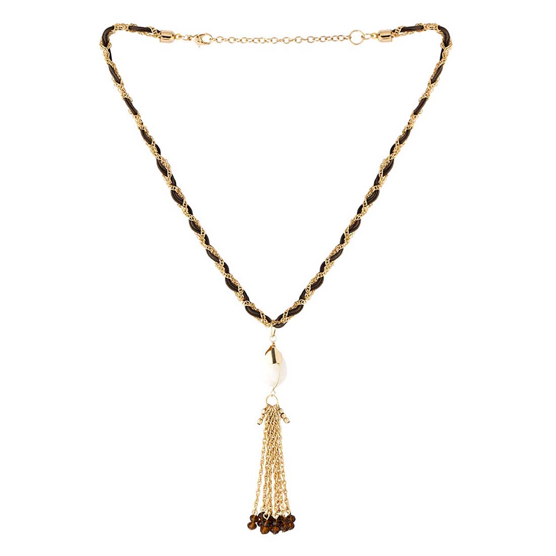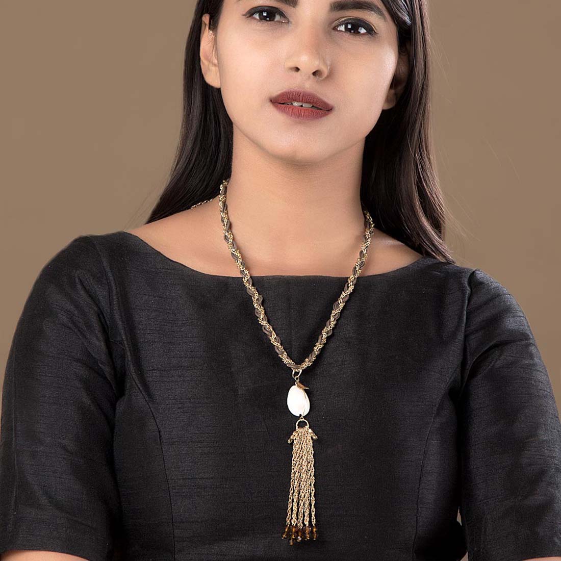For the woman, who has a penchant for exquisite necklaces, this elegant designer necklace is a perfect piece for her. Gold-toned chain, which is interlocked with a black thread studded with sea shell. This captivating jewelry piece will definitely flaunt your elegance.