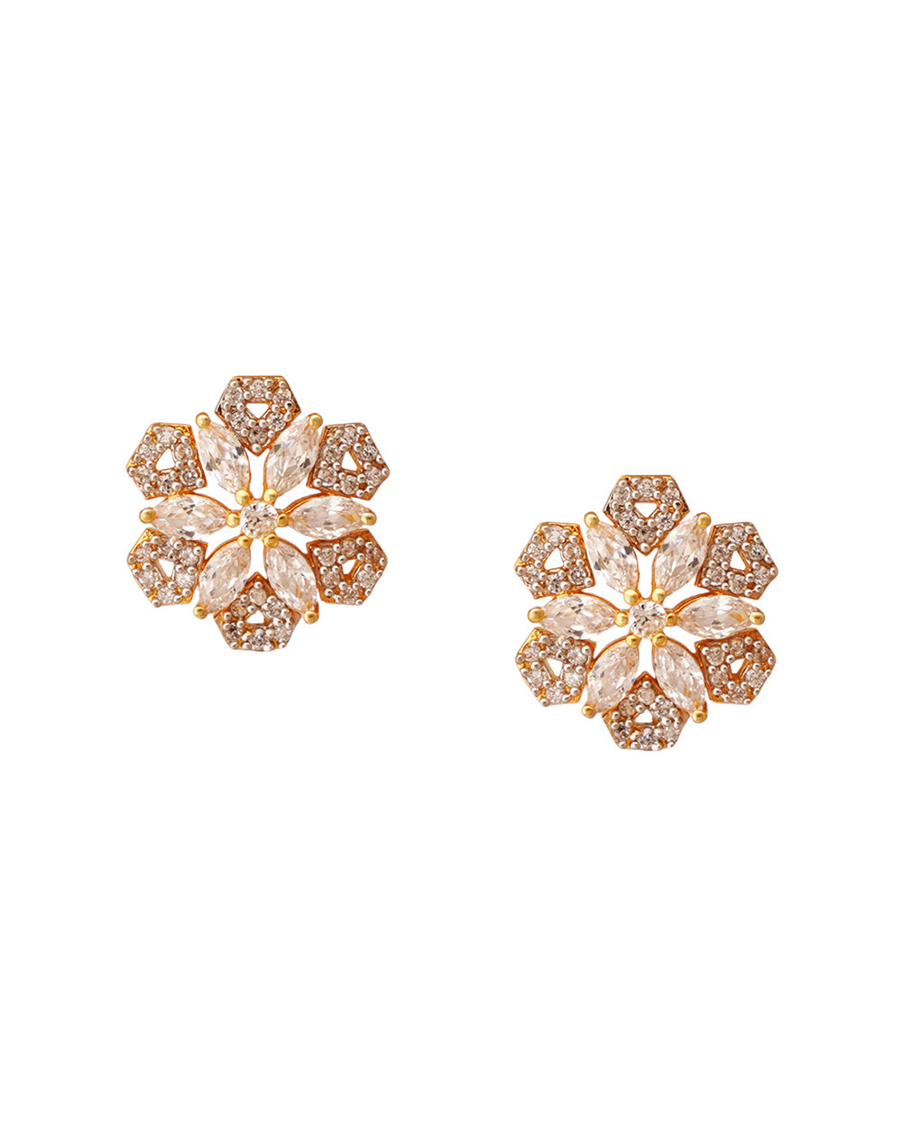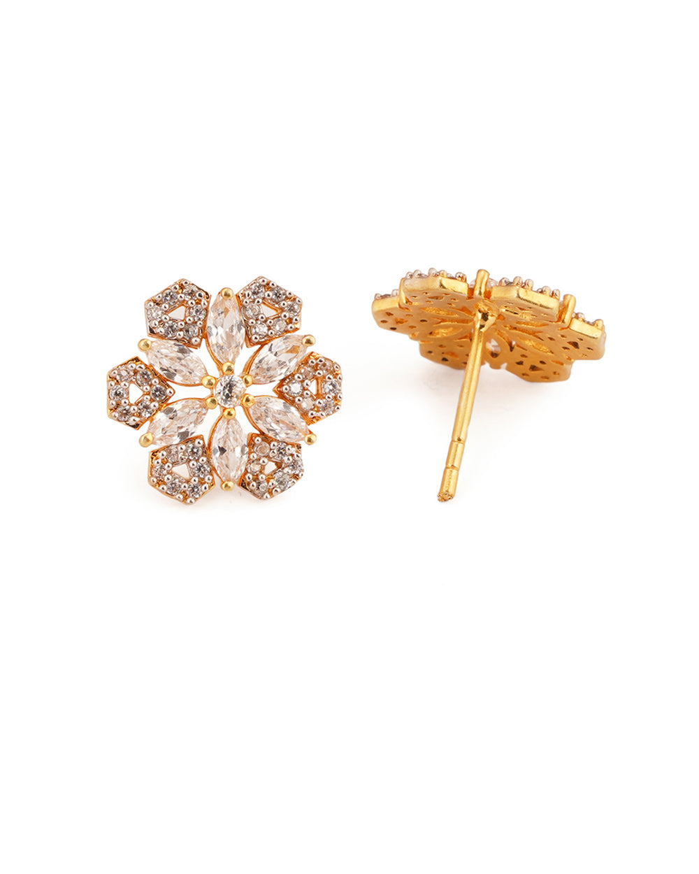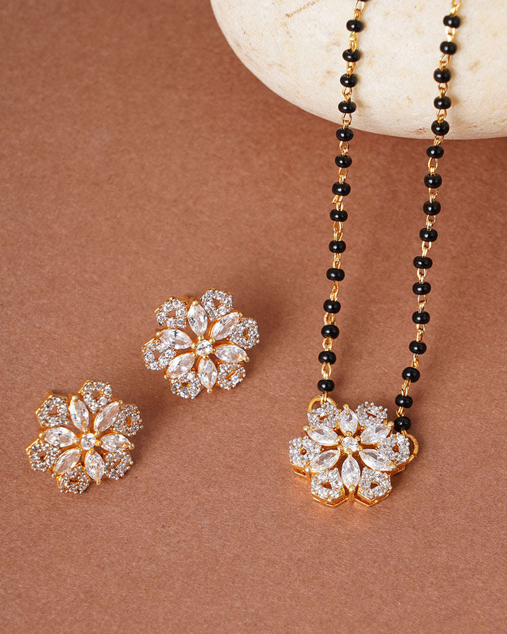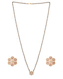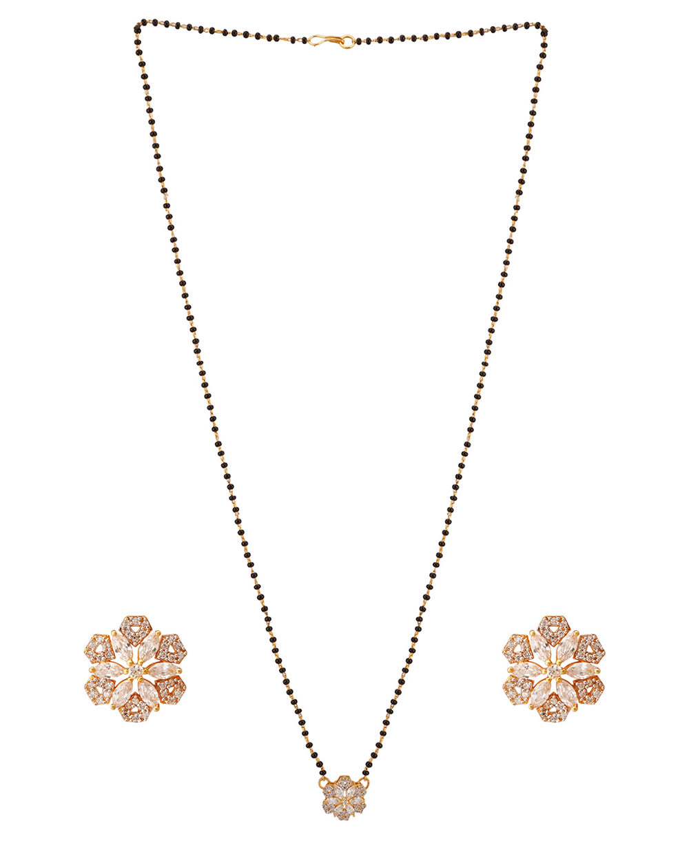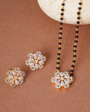 Shimmering Floret American Diamond CZ Gold Plated Brass Black Beaded Mangalsutra with Earrings
