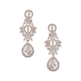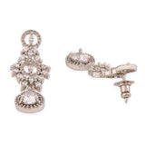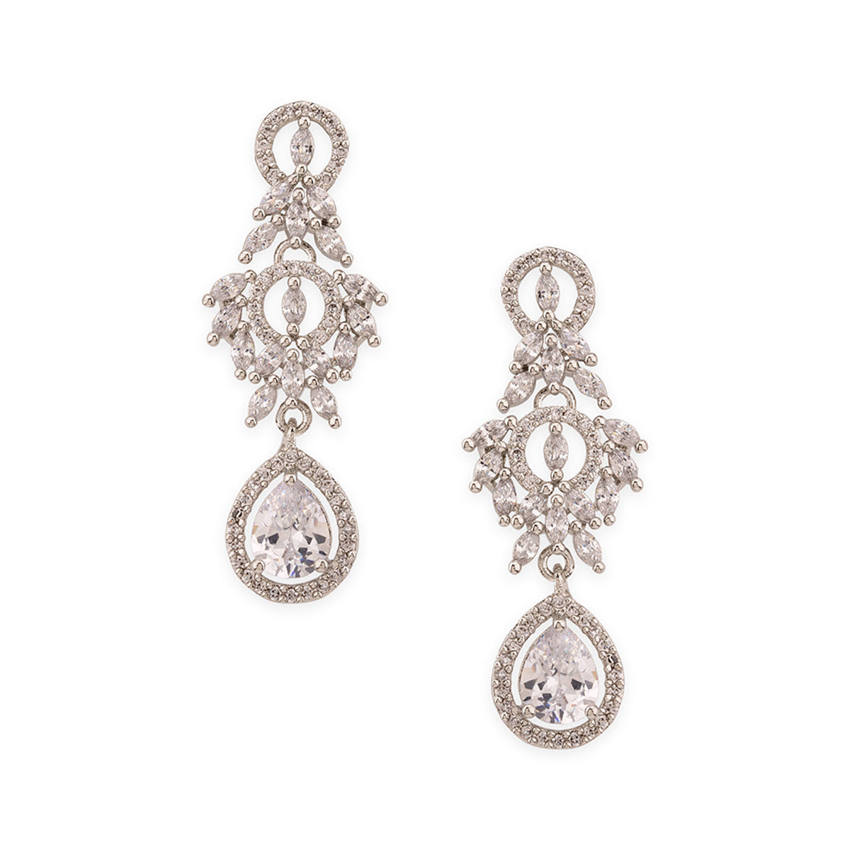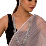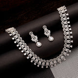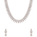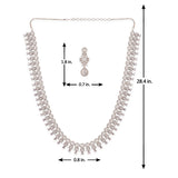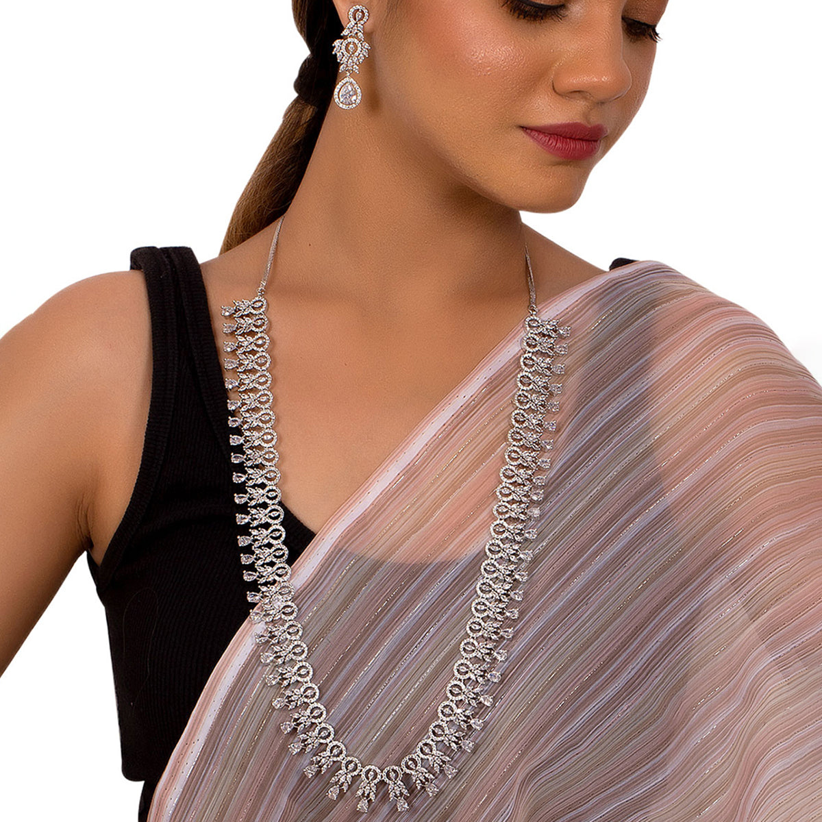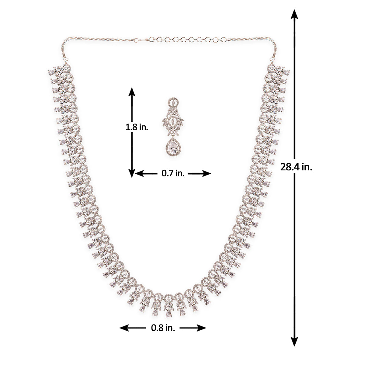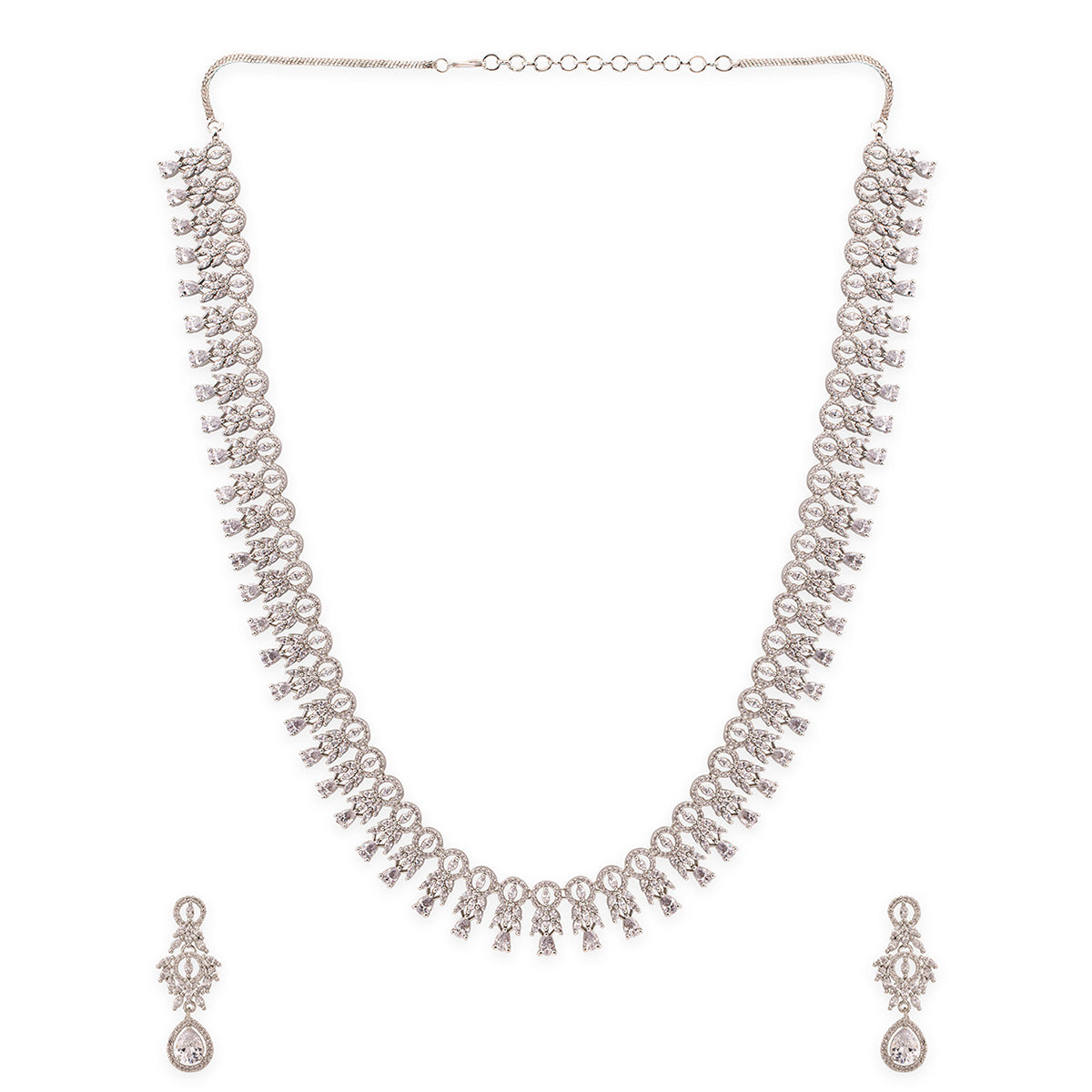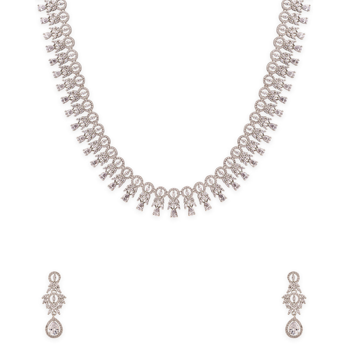 A classic necklace set with a delicate design and sparkling American Diamond stones. Crafted beautifully with brass and finished with the smoothest white rhodium polish, the elegance, and quality of this necklace set are unmatched. It is a great jewelry piece for anniversaries, birthdays, or any special occasion.