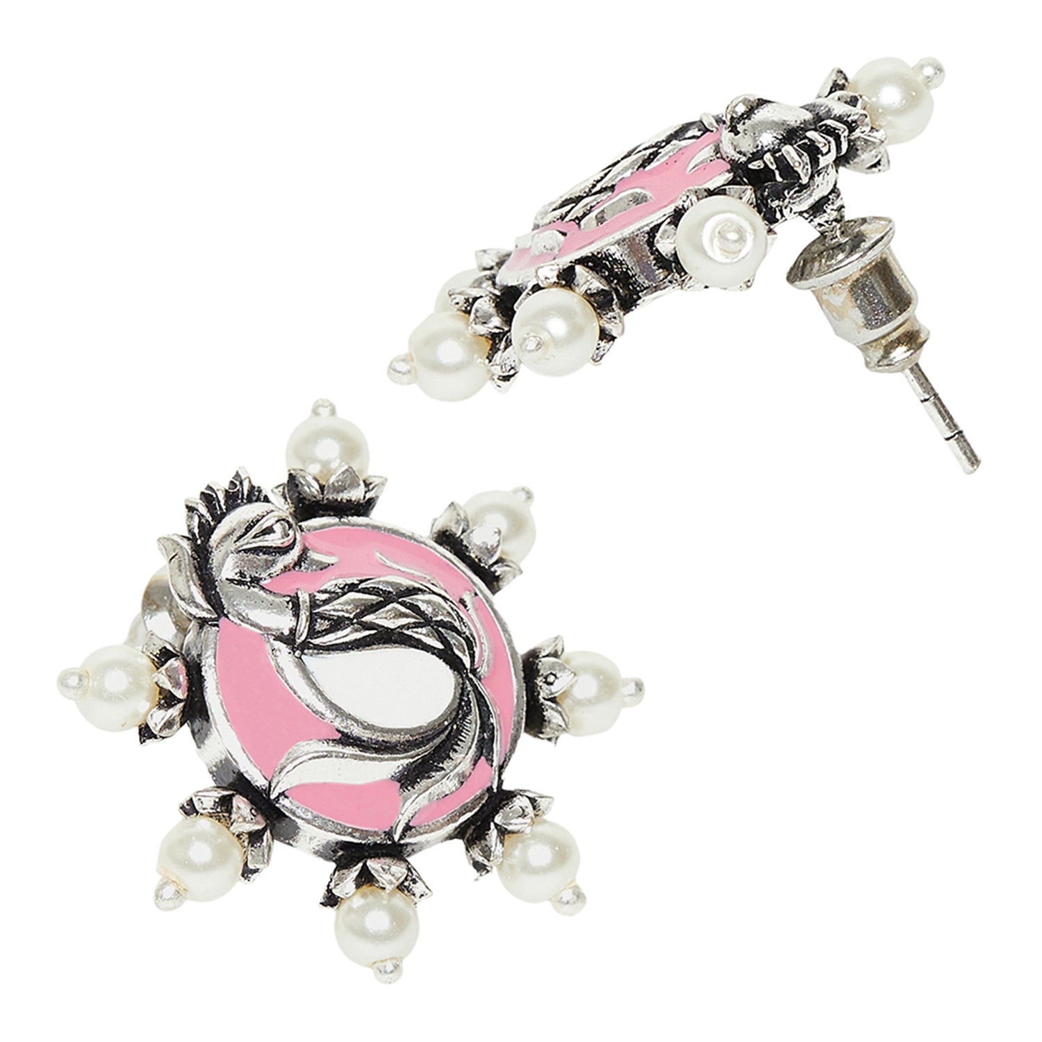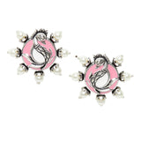 Brass stud earrings, featuring a peacock motif and pink enamel embellishments. Adorned with white faux pearls, the earrings have been given a silver plating for added charm. Lightweight and comfortable, the earrings pair well with a wide range of formal and casual Indian and Indo-Western outfits.