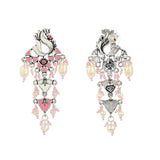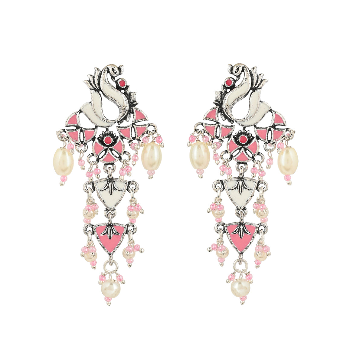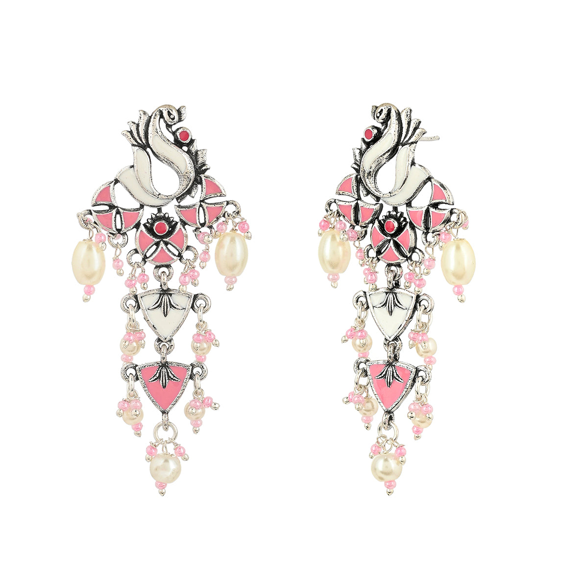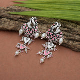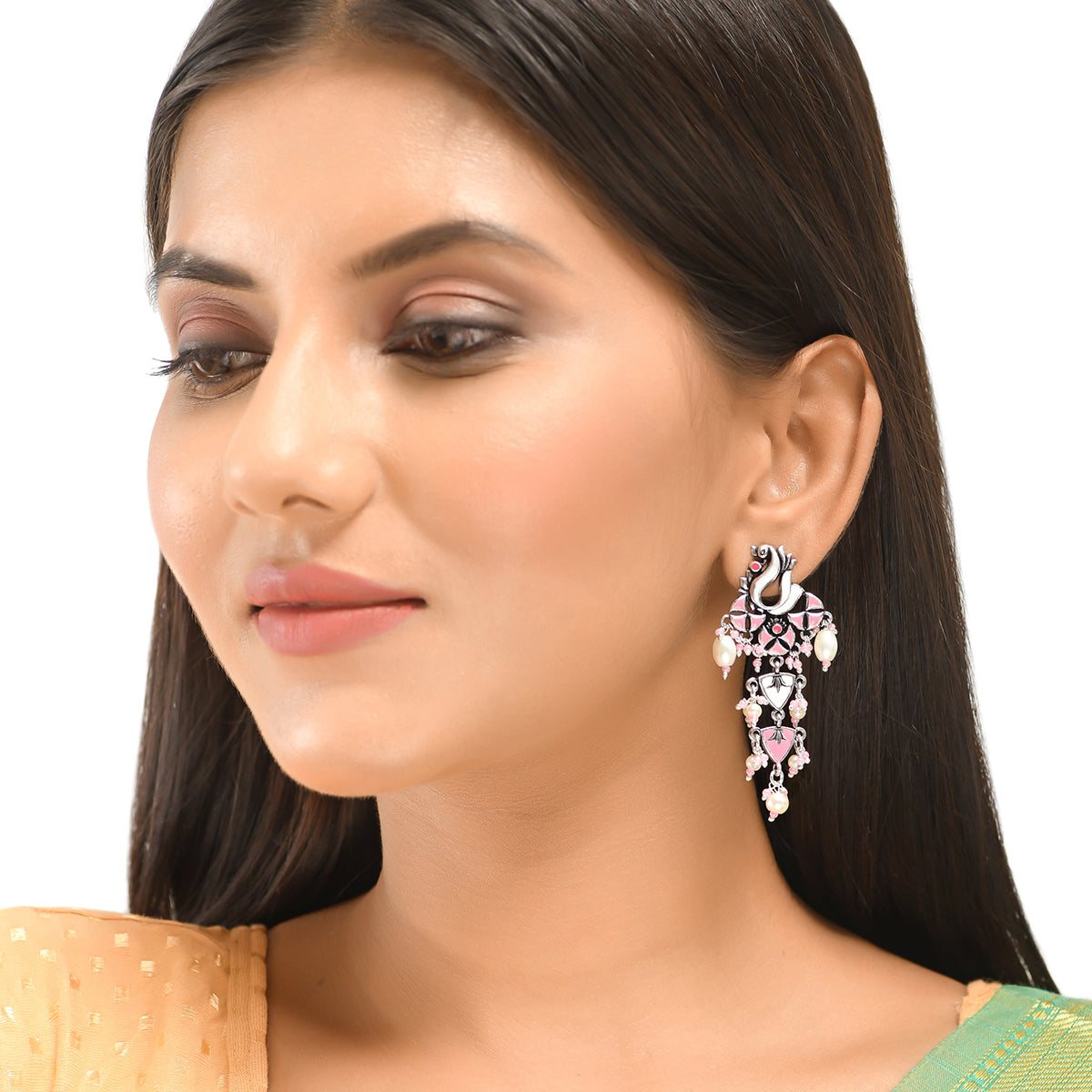 Drop earrings featuring a delicate peacock motif and pink enamel details. The brass pair has been given a lovely oxidised silver plating. Faux pearl embellishments add to the charm of these earrings, which will look splendid when paired with a designer saree.