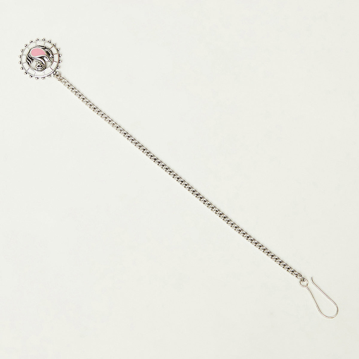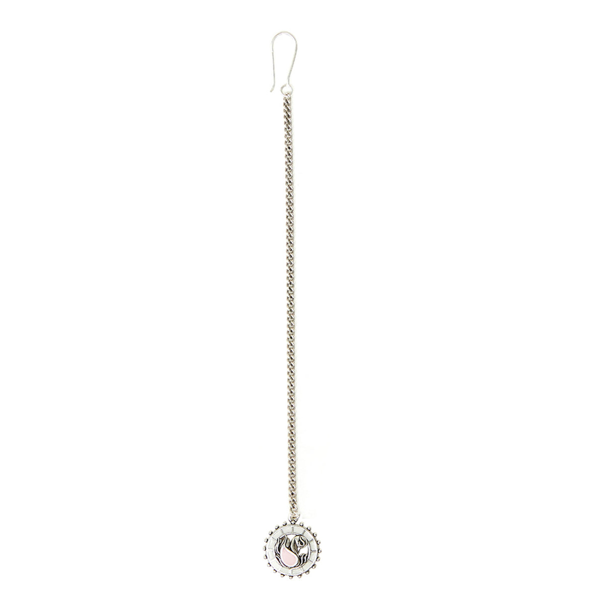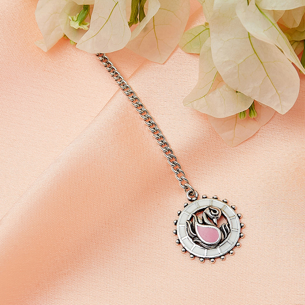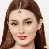 Brass maang tika, featuring a peacock motif and pink enamel details.Comfortable and lightweight tika will pair well with a wide range of Indian, Indo-Western and Bohemian looks.