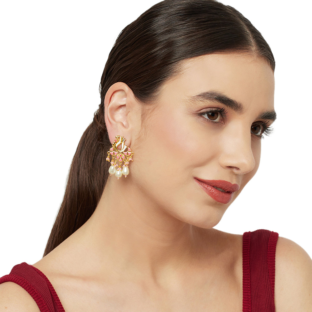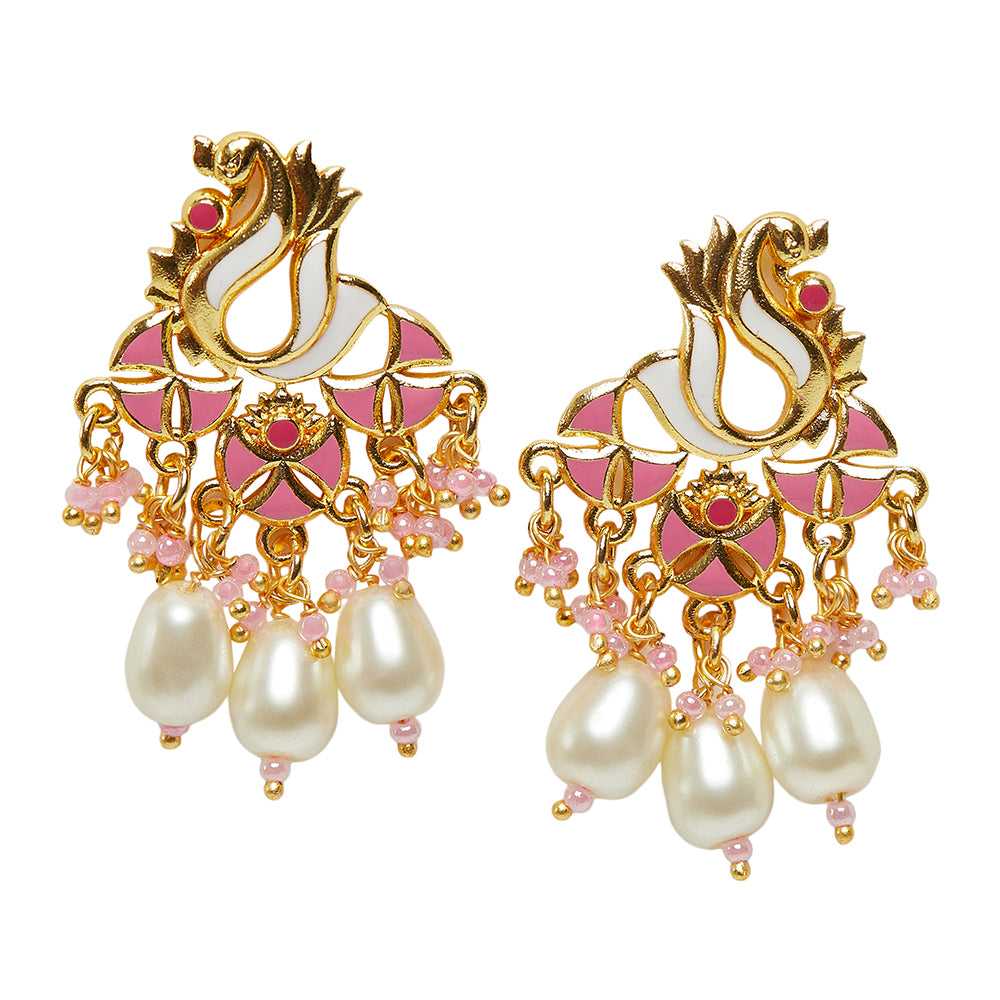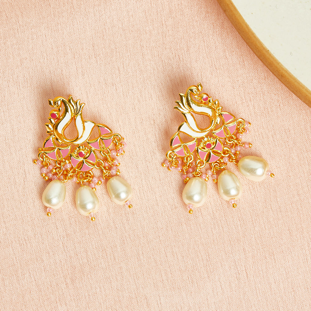 Feel like a regal princess when you wear these gold-plated jhumkis inspired by the serenity of lotus and magnificent beauty of peacock to the next wedding ceremony. Adorn them on a salwar-suit and high-heels.